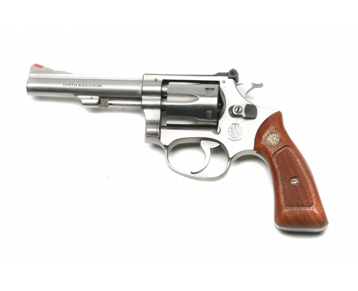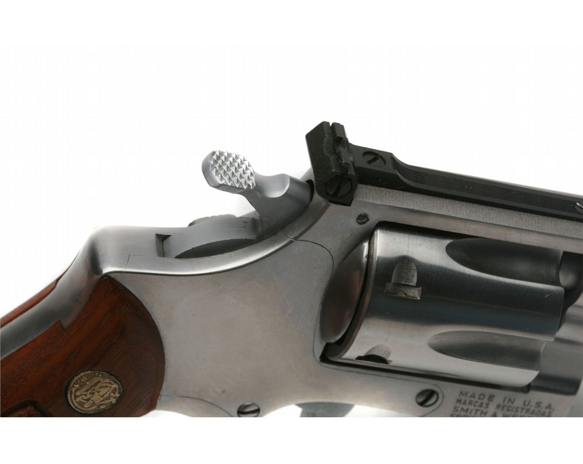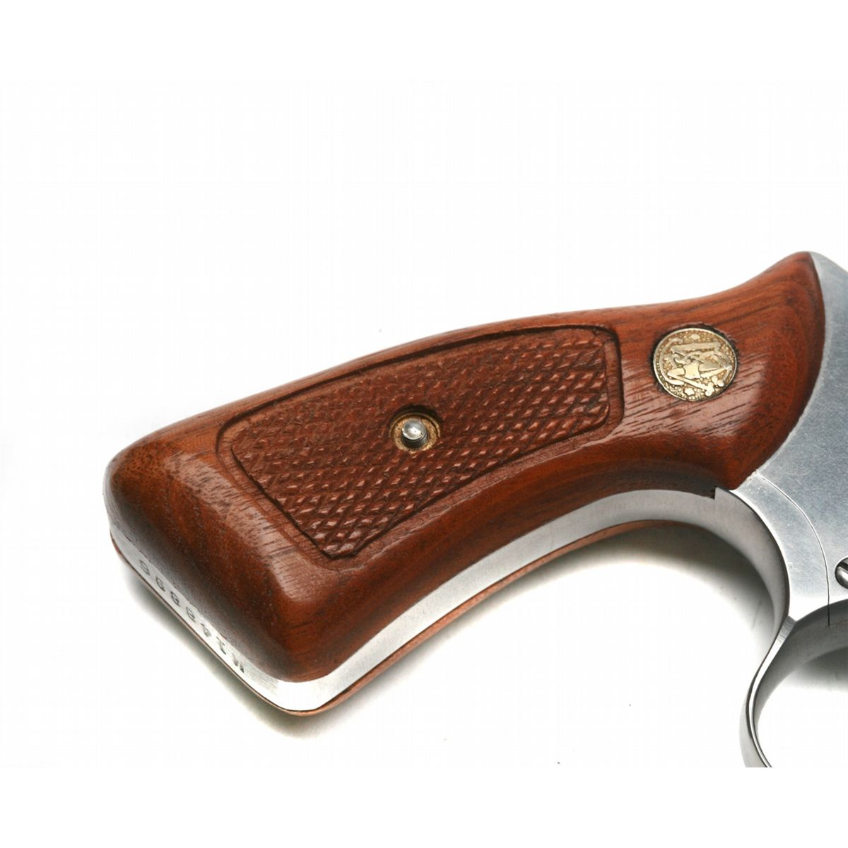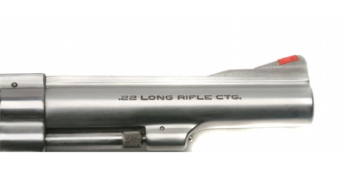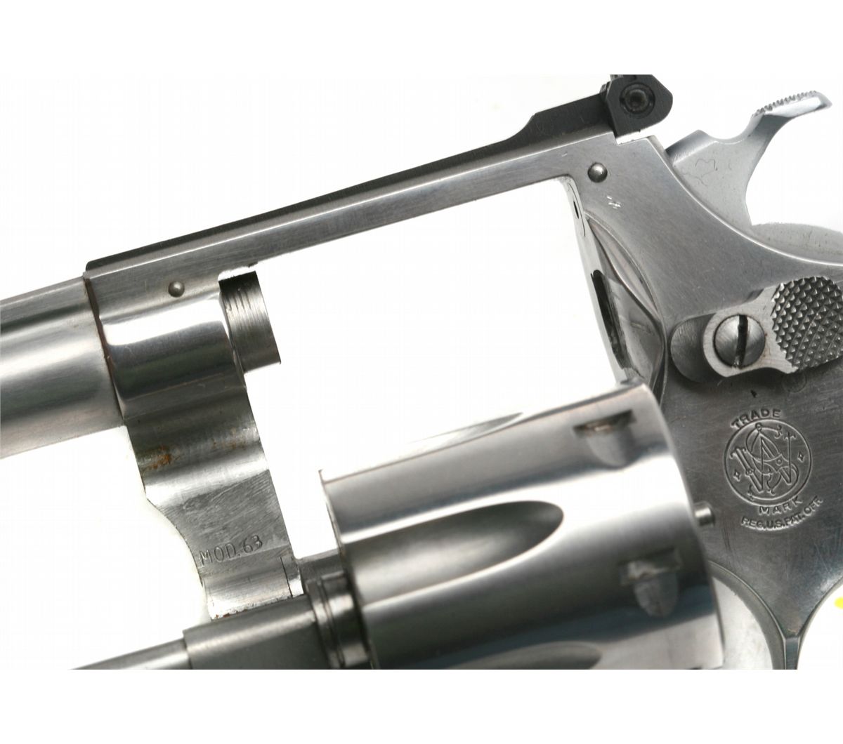 ANIB condition - 4" half lug pinned barrel - .22/32 Kit Gun Stainless model - 99% stainless finish - checkered walnut J frame grips with S&W medallions in excellent condition - front fixed serrated red ramp & rear black adjustable sights - crisp markings on barrel & frame - crisp yoke markings - smooth backstrap & serrated top rib - 6-shot fluted cylinder - serrated trigger - appears unfired - yr. mfg: 1977-81 - factory Bangor Punta box in very good condition, strong corners - sealed cleaning kit - papers - SN M148896 - est. 300 - 600 - FFL - 25JJCHKS013