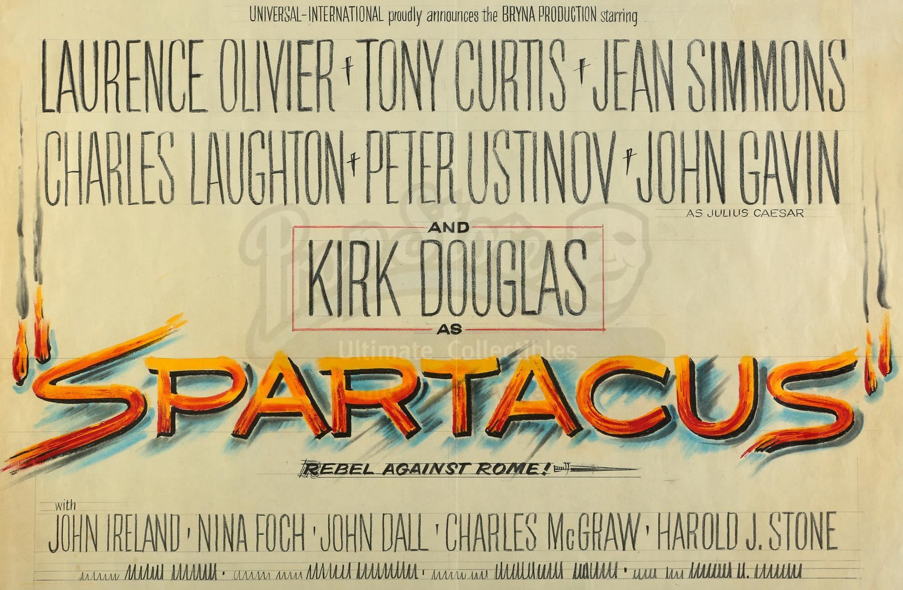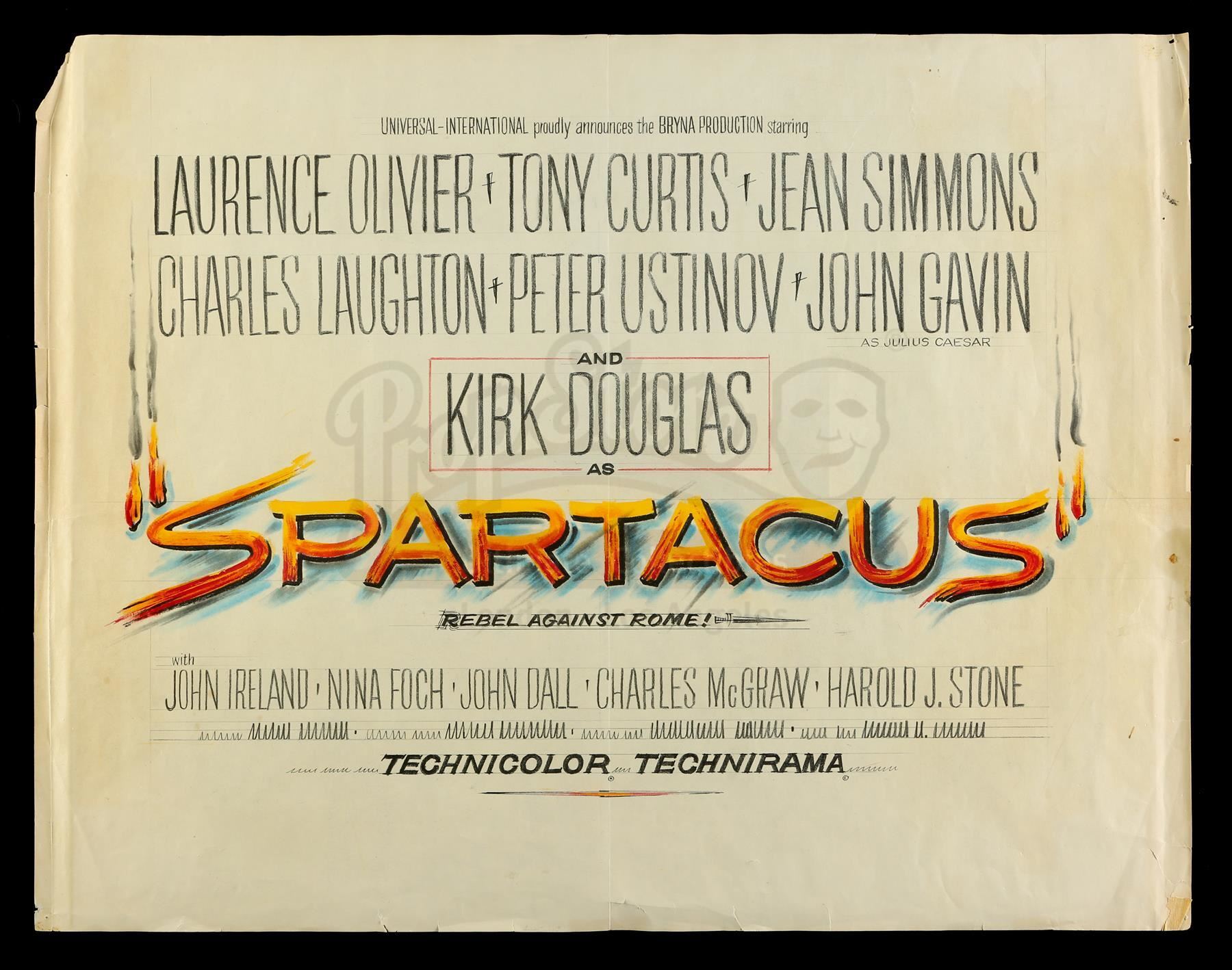 A hand-drawn poster concept illustration from the promotion of Stanley Kubrick's sword-and-sandals epic Spartacus. Kubrick replaced original director Anthony Mann, and ultimately guided the film to win four Academy Awards. This half-sheet concept illustration was acquired from the estate of Universal-International art department illustrator David Shane.