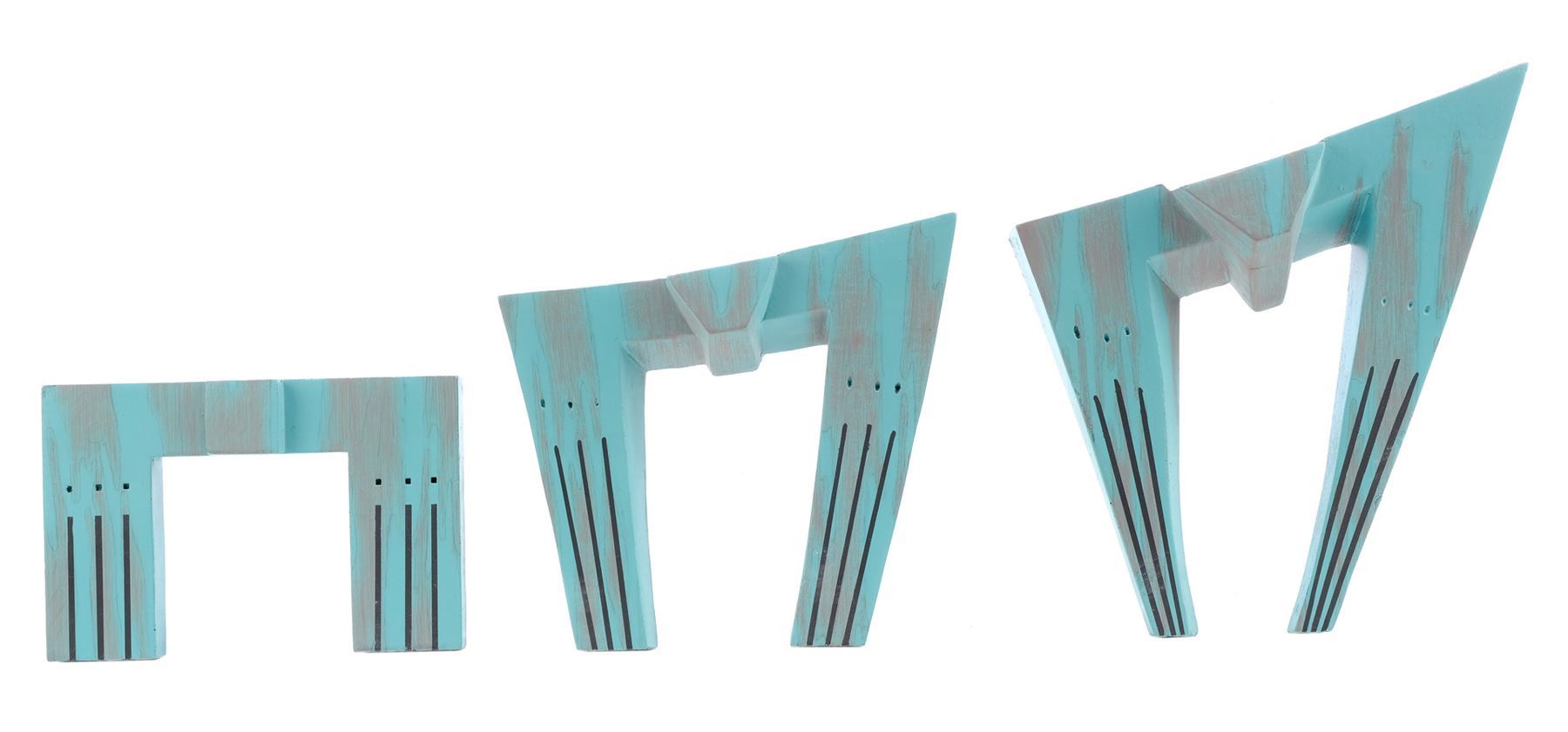 This lot consists of three fireplace frame pieces. Made of foam painted in shades of gray and teal, these frames feature three levels of increasing angular shapes. They have wood tabs and metal tubes inset in the back and are hand-marked with "1," "14," and "25" in red marker. This lot exhibits discoloration, notable adhesive residue, and notable paint marks. Dimensions: 9.25" x 8.25" x 2" (23.5 cm x 21 cm x 5 cm)