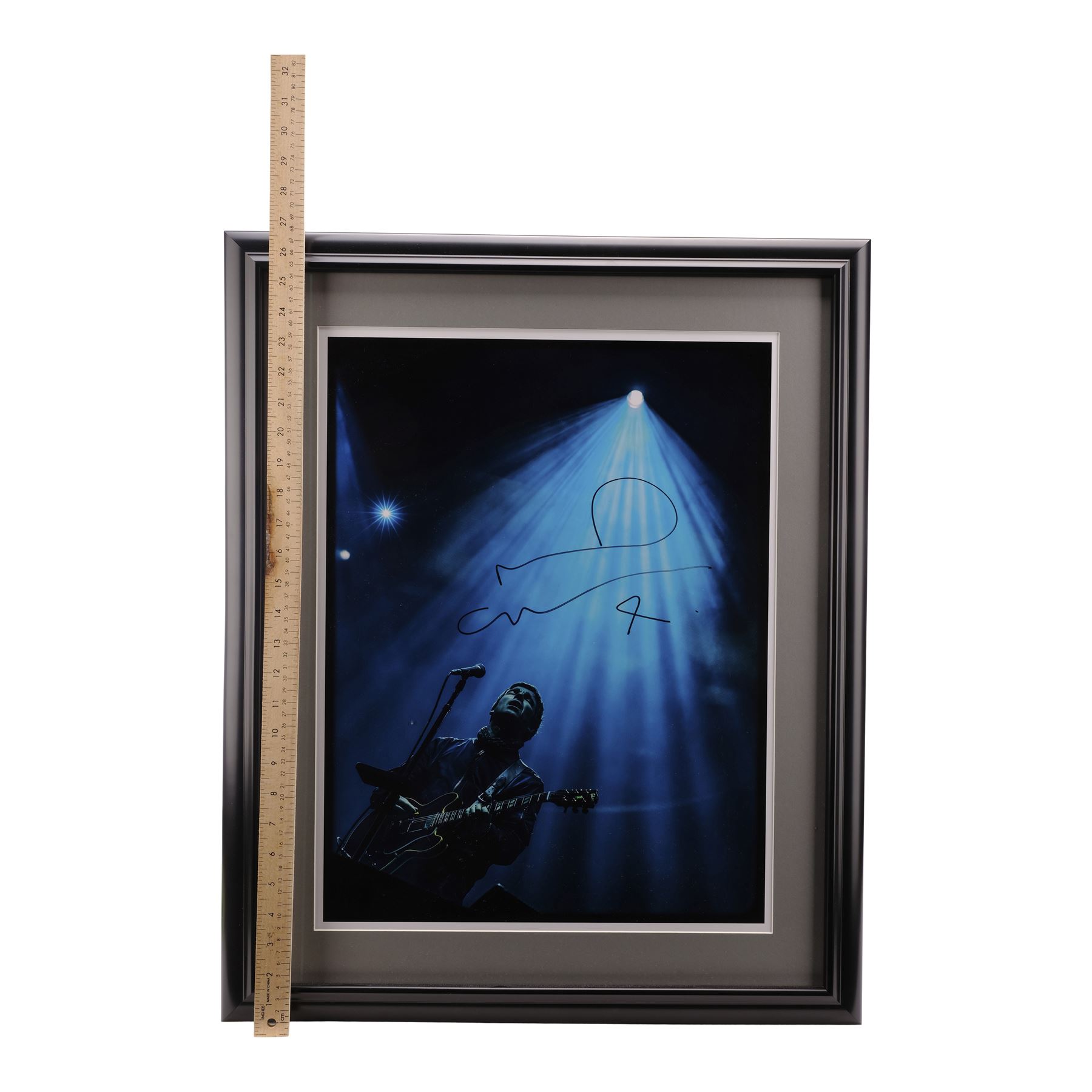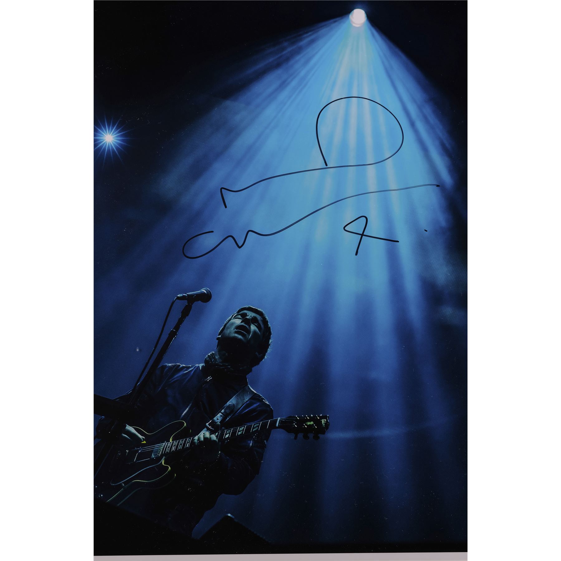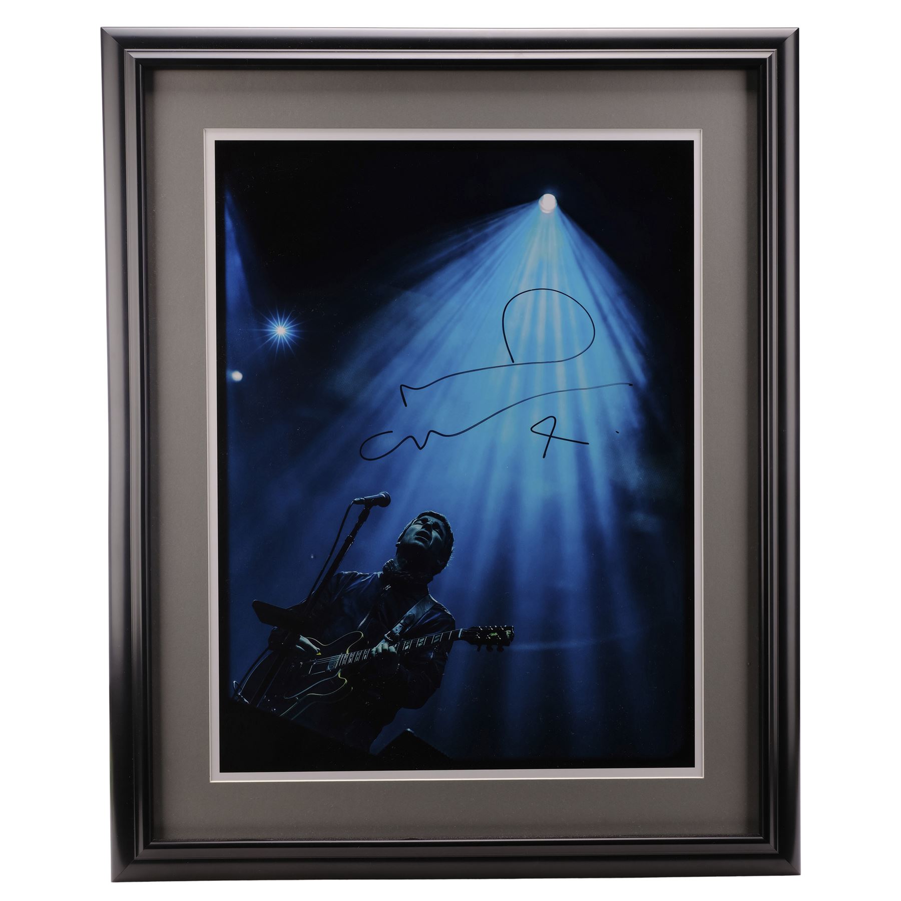 A framed photograph of Oasis co-founder and lead guitarist Noel Gallagher. This full-colour glossy photograph of the musician with his black Gibson Les Paul electric guitar is signed in black marker by Gallagher and comes mounted behind glass in a custom black frame with a grey matte backing. The frame exhibits minor dings. Dimensions: 68.75 cm x 56 cm x 2.5 cm (27" x 22" x 1")