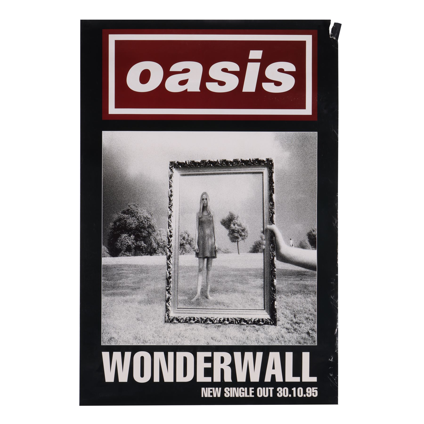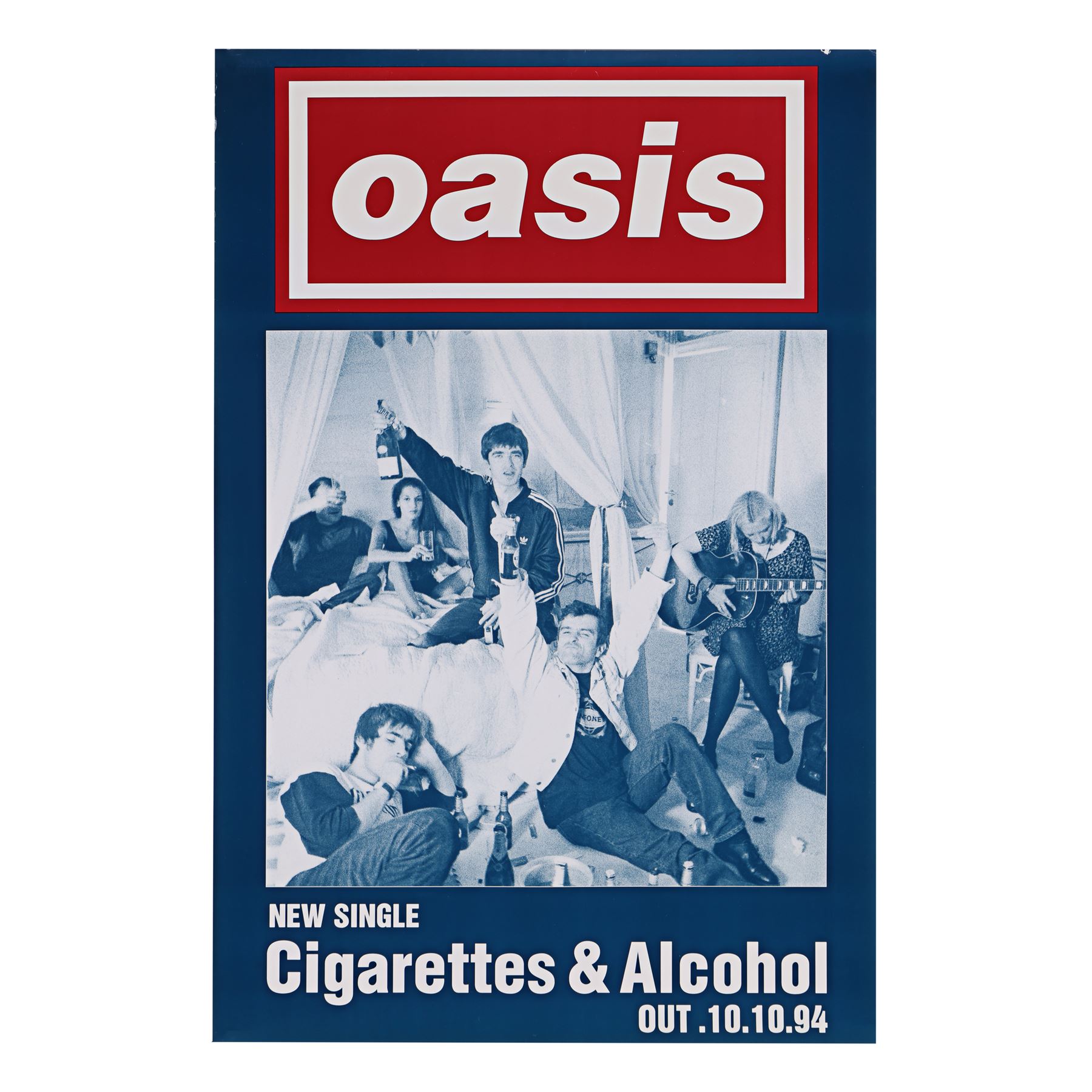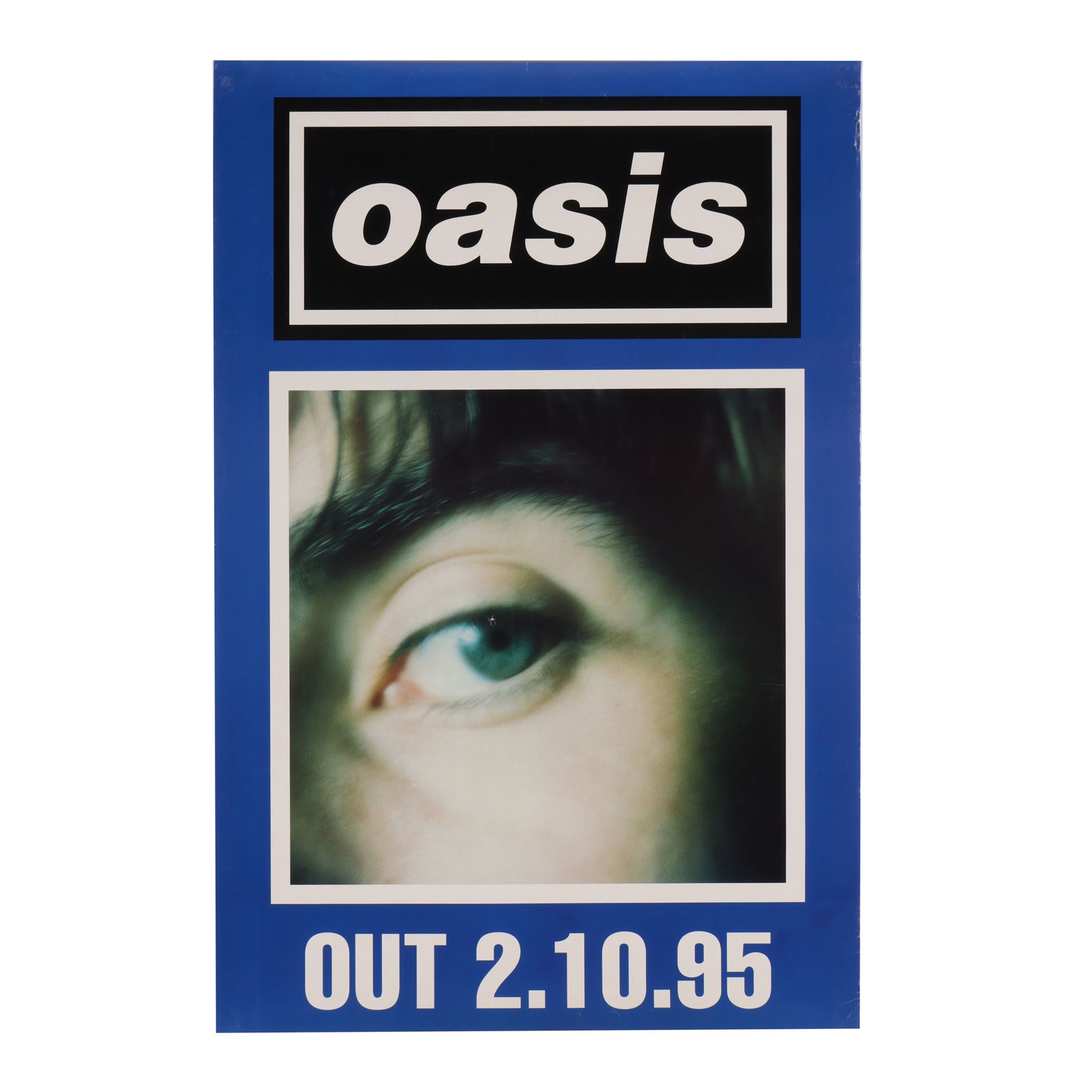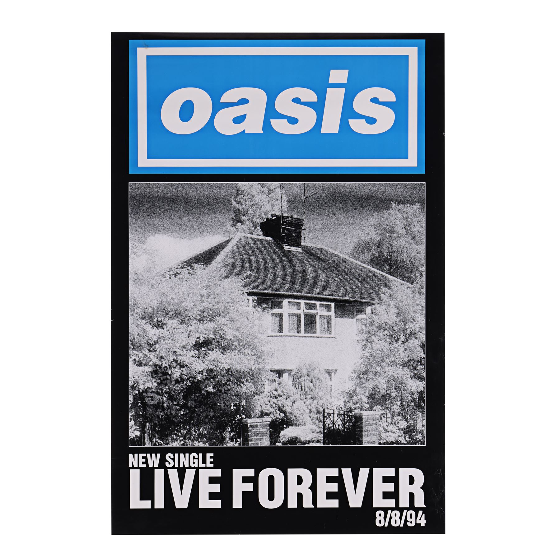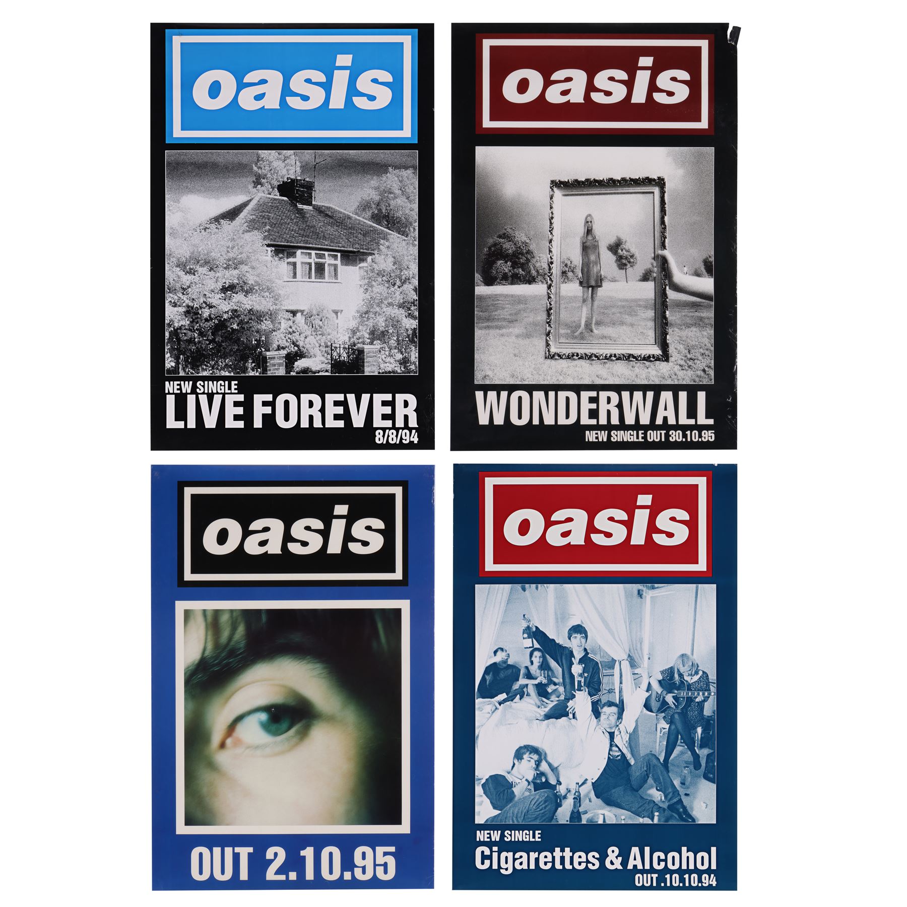 A set of four rare Oasis posters promoting the release of the singles "Live Forever", "Cigarettes & Alcohol" and "Wonderwall", and the album (What's the story) Morning Glory?, respectively.