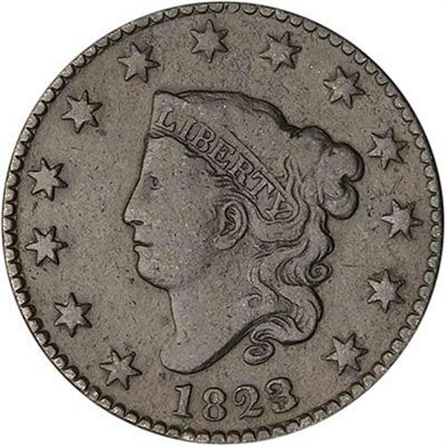 1823/2 N-1 R2. Overdate 3 over 2.. Sharpness F15 but covered with uniform fine granularity that's somewhat hidden under a slightly glossy dark olive and steel patina. A couple small spots of greenish verdigris but no significant contact marks. EDS. The overdate remains sharp.