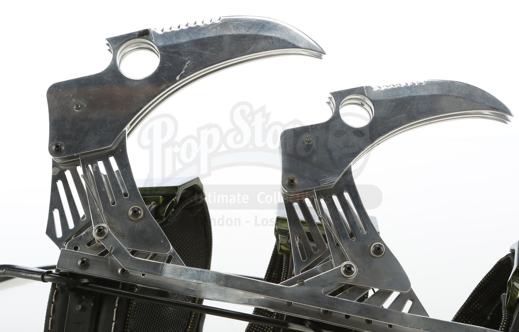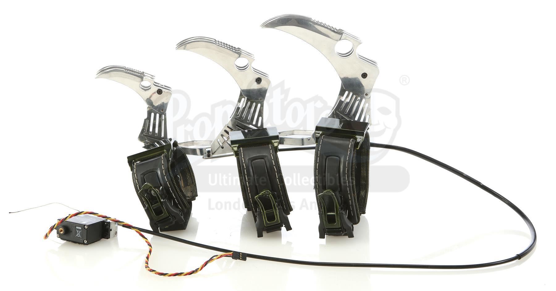 The nine chrometone metal blades are separated into groups of three, with spring-loaded folding mechanisms controlled by cables and servos. This allows the blades to spring out into an open, battle-ready form from their compact, folded-up position. The blades are attached to three black leatherette straps with green resin and metal buckles and that latch onto small nylon straps. The lot is in good overall condition with minimal wear from production, most notably a bit of fraying and loose threads in the arm straps. Dimensions (arm mechanism): 16" x 14" x 7" (41 cm x 36 cm x 18 cm)