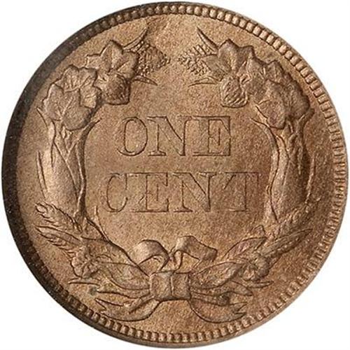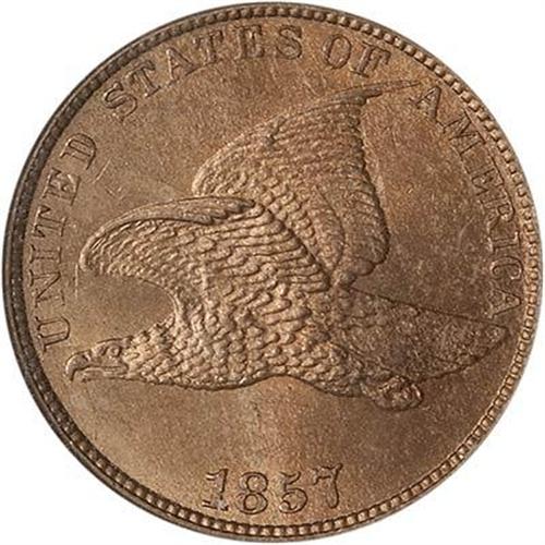 1857 Flying Eagle Cent. Beautiful brownish tan color with coruscating mint frost that swings and pitches around the surface on both sides as the coin is angled under a light. What is most noteworthy here is the sharp detail on the eagle, whose eye is complete, upper wing feathers show, and tail has nice separation between the feathers as well. Even the upper part of the wreath shows its leaves and cotton bolls, which is unusual for an area of the coin that is typically found softly struck. A gem, in other words, and something to fit right at home in a U.S. Type set. (#2016)