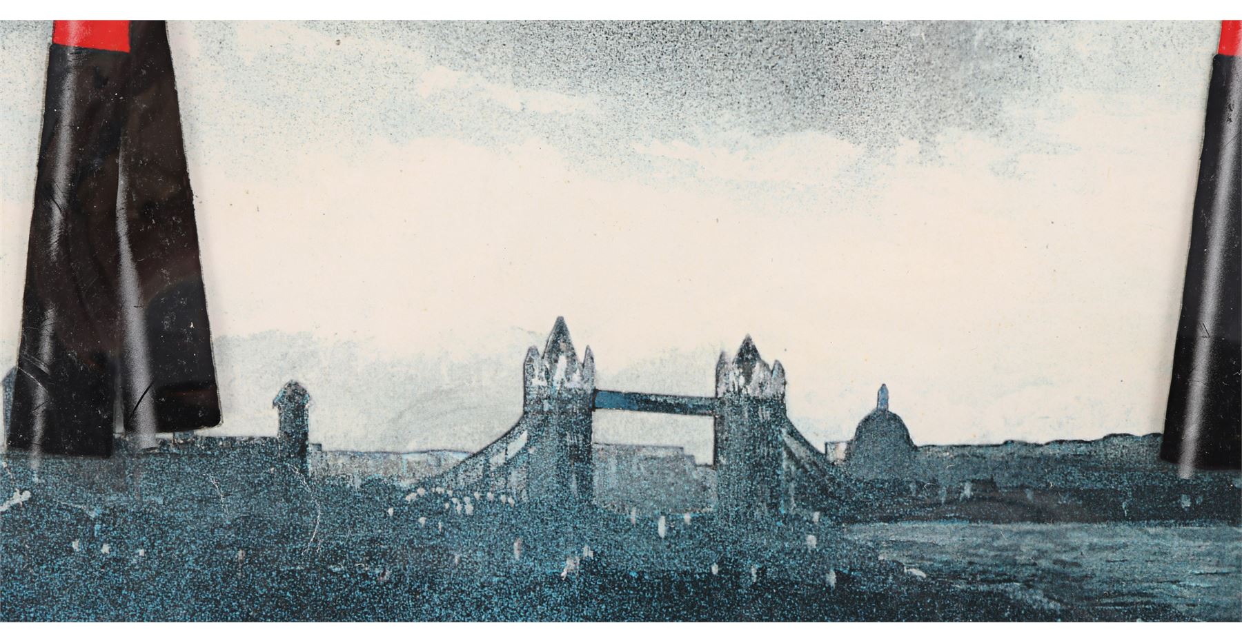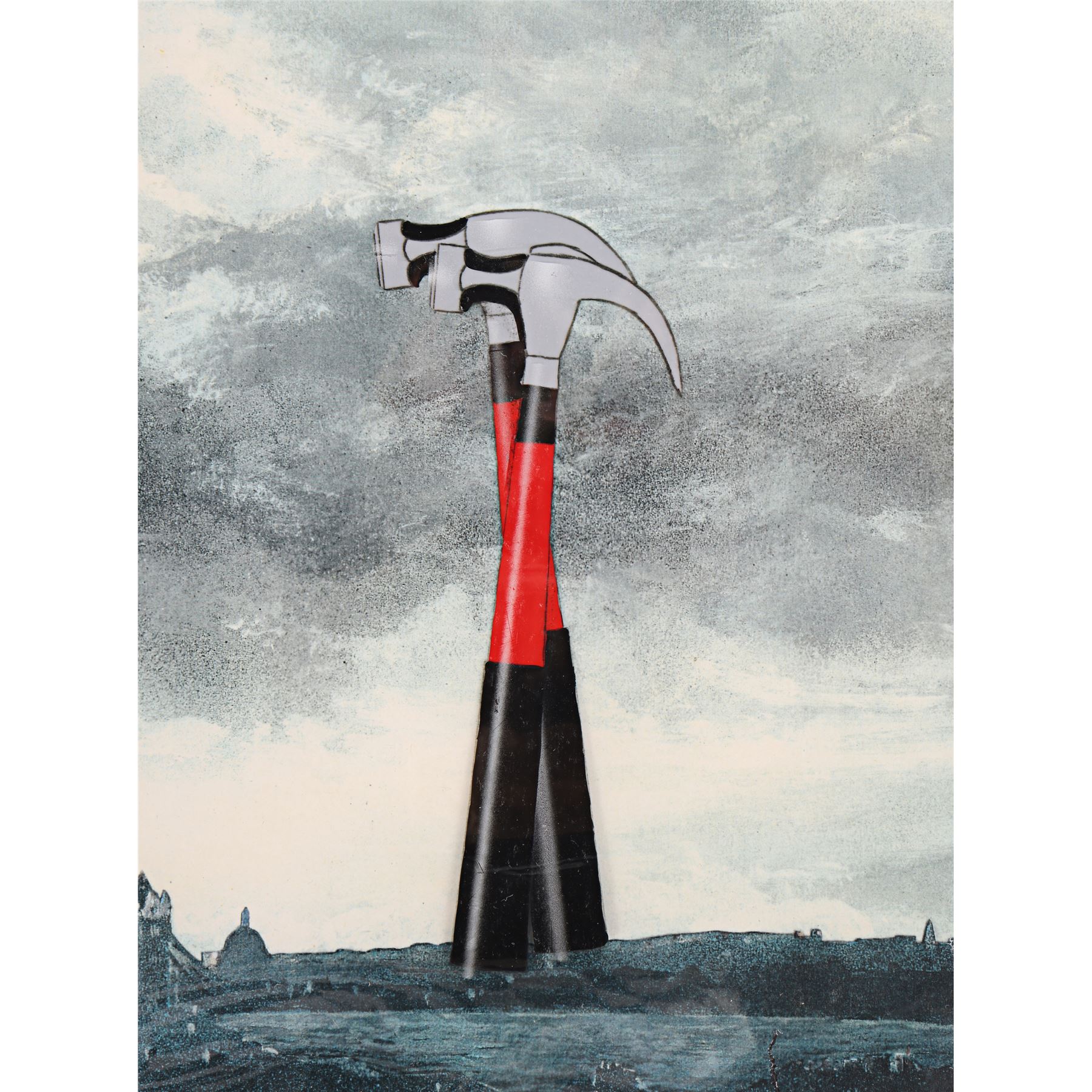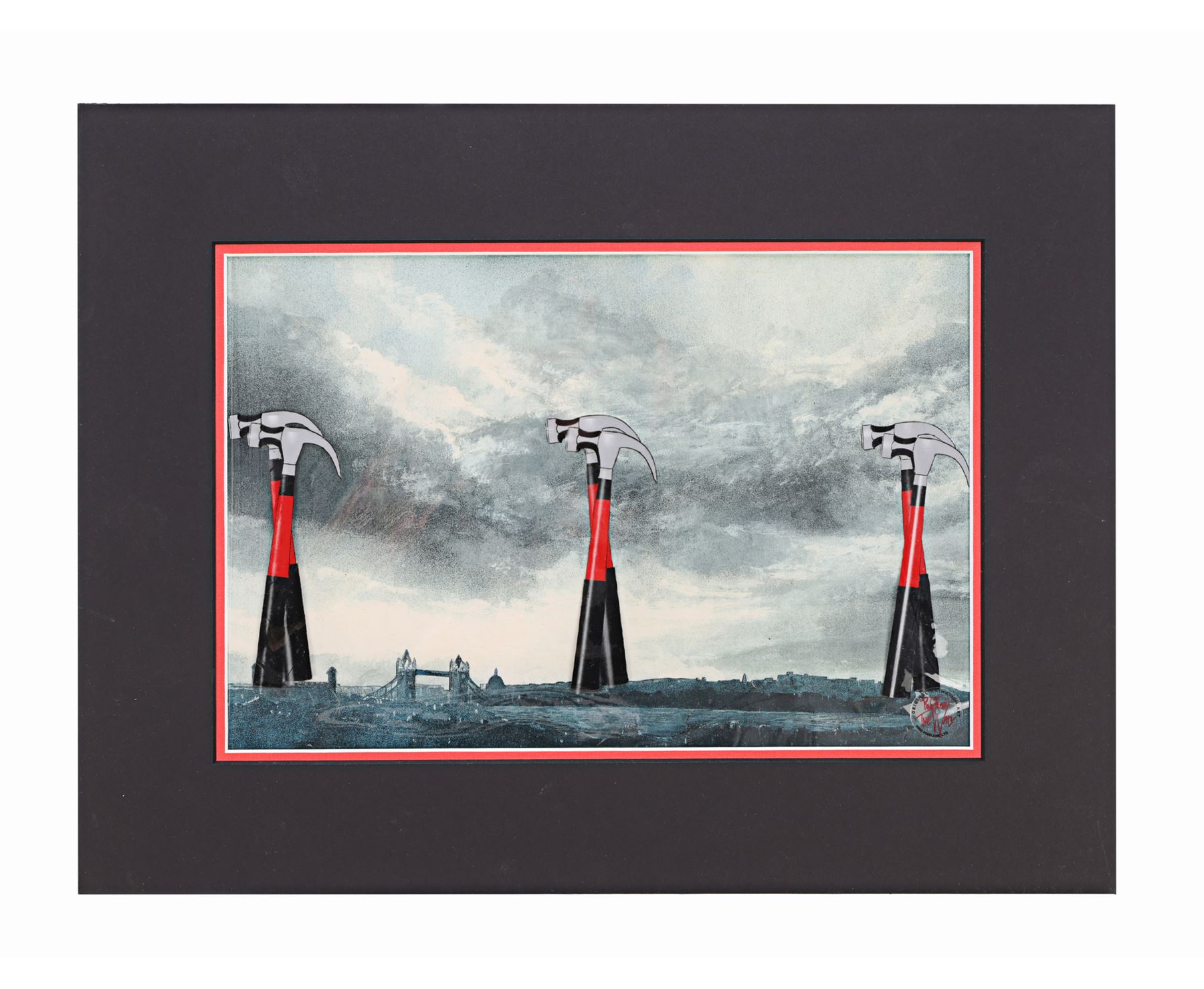 An animation cel from Alan Parker's musical drama Pink Floyd: The Wall. The goose-stepping hammers appeared during the "Waiting for the Worms" sequence as Pink (Bob Geldof) imagines himself as a fascist dictator. The sequence was animated by noted British illustrator and cartoonist Gerald Scarfe. It is presented on two acetate sheets: one featuring the hammers and one featuring the hammers' reflected lighting. Both sheets are over a printed illustration of the London skyline and held in a black card mount. Dimensions (display): 38 cm x 50 cm (15" x 19 3/4")