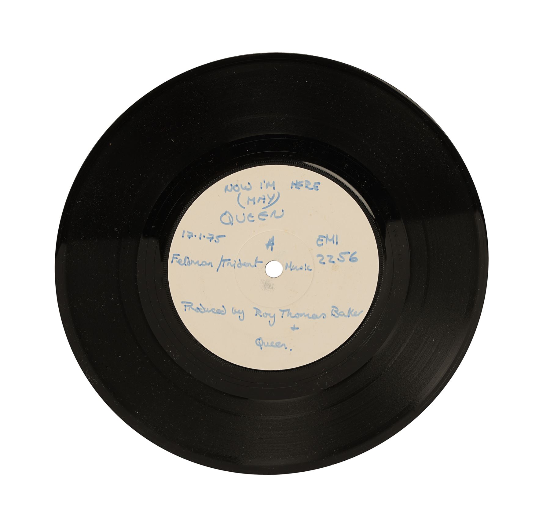 A test pressing of Queen's double-A-side single "Now I'm Here/Lily of the Valley". It was released in the UK in 1975, and both songs feature on the 1974 album Sheer Heart Attack. This lot originally came from the archive of British DJ John Peel.