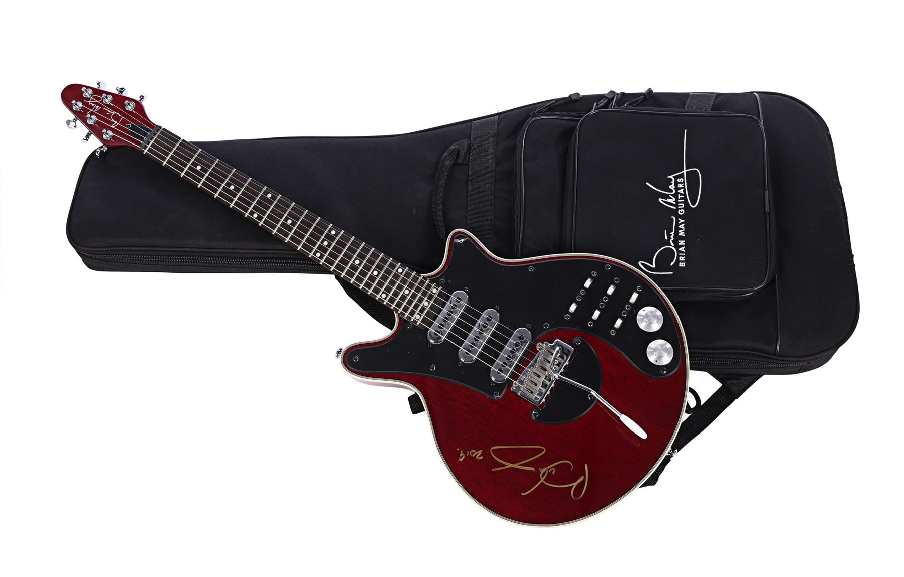 The guitar comprises an antique cherry mahogany body, an ebony fingerboard, black scratch plates and chrome hardware. "Brian May" is printed in white on the headstock and the serial number is "BHM 190738". The body is autographed in gold-coloured ink by May, who has added the year "2019". The instrument comes in a "Brian May Guitars" branded padded gig bag, and the scratch plate's protective plastic film has begun to peel. Dimensions (guitar): 99 cm x 35.5 cm x 9 cm (39" x 14" x 3 1/2")