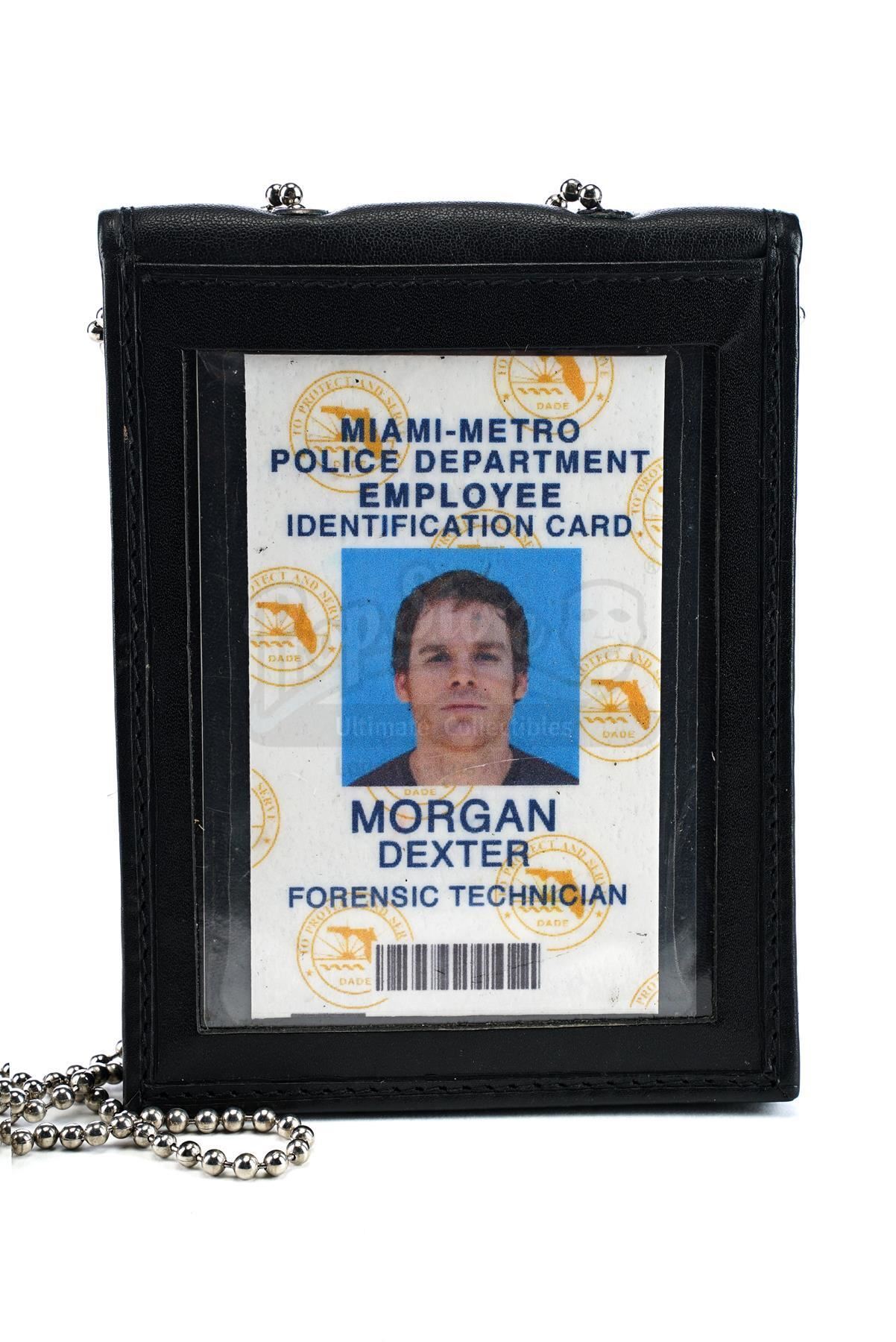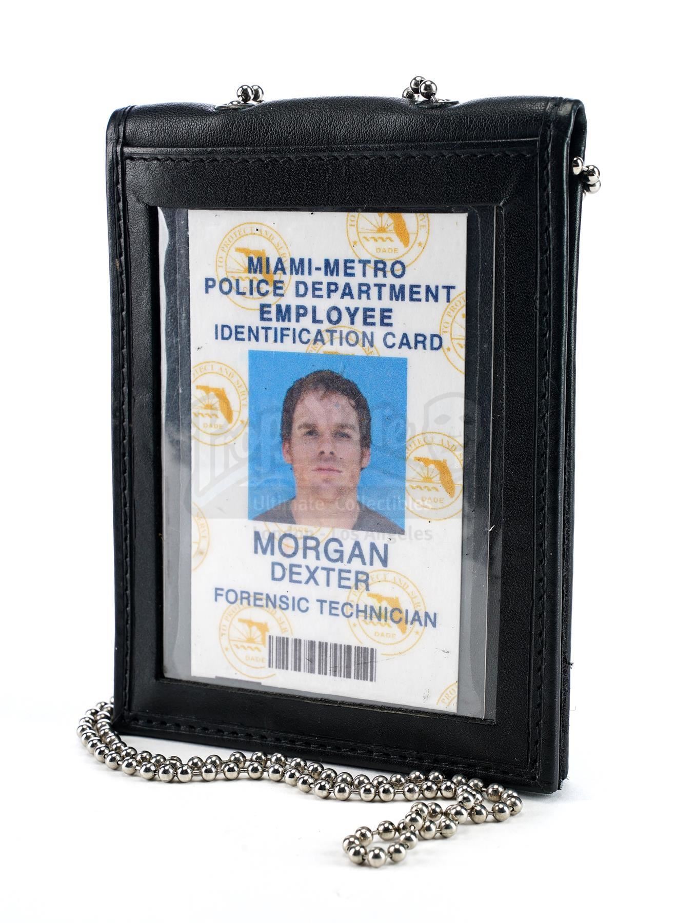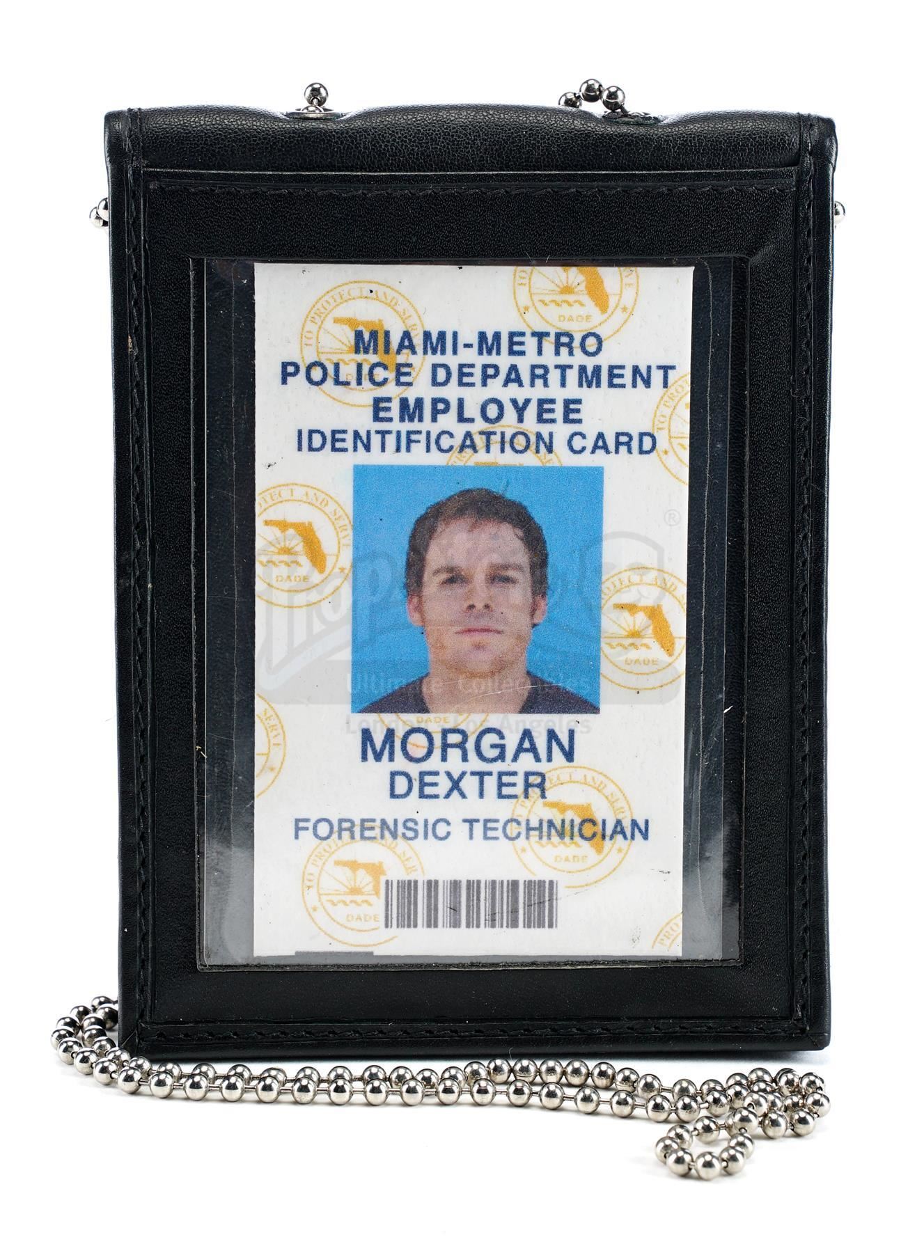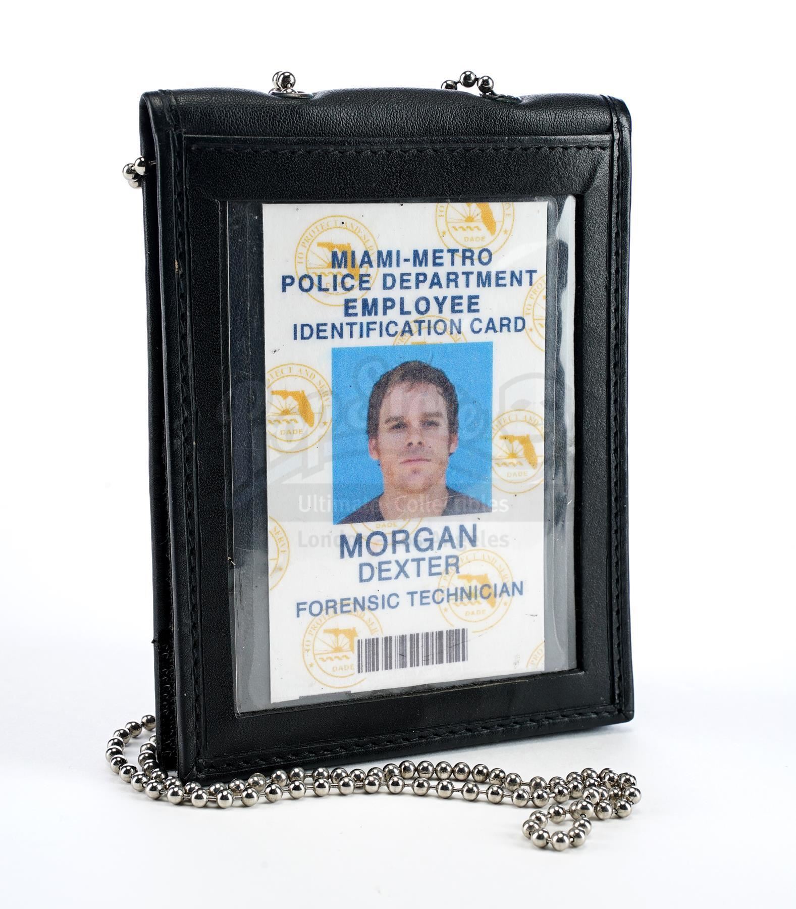 This lot will be auctioned on Wednesday, June 30th. The auction will begin at 9:00am PDT and lots are sold sequentially via live auctioneer; tune in to the live streaming broadcast on auction day to follow the pace. Note other lots in the auction may close on June 29th or July 1st. Dexter Morgan's (Michael C. Hall) ID card from James Manos, Jr.'s crime television series Dexter. Morgan, a vigilante serial killer who targeted other killers, was a bloodstain pattern analyst for the Miami-Metro Police Department throughout the series. This plastic Miami-Metro Police Department employee identification card labeled for "Morgan, Dexter Forensic Technician" comes in a leatherette sleeve with a metal chain necklace. The ID is in excellent overall condition with some wear to the sleeve from production. Dimensions: 5" x 3.5" x 0.5" (12.75 cm x 9 cm x 1.5 cm) Estimate: $3,000 - 5,000