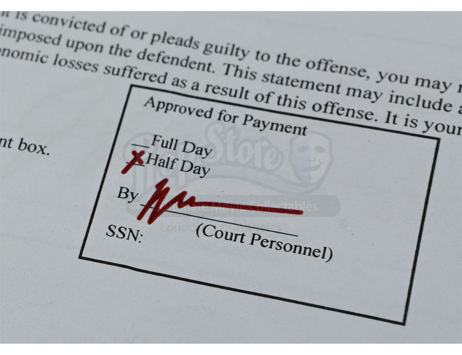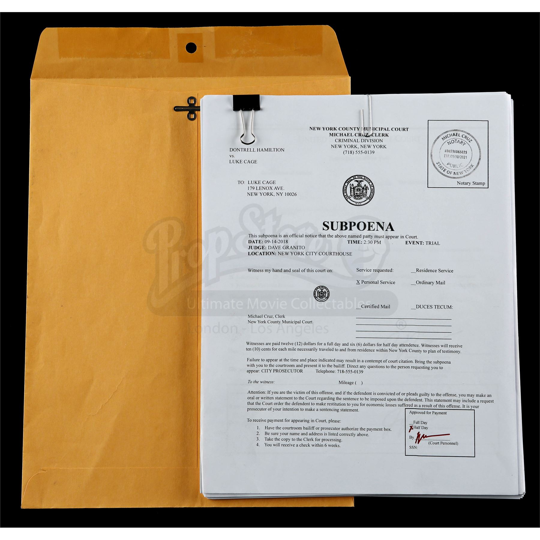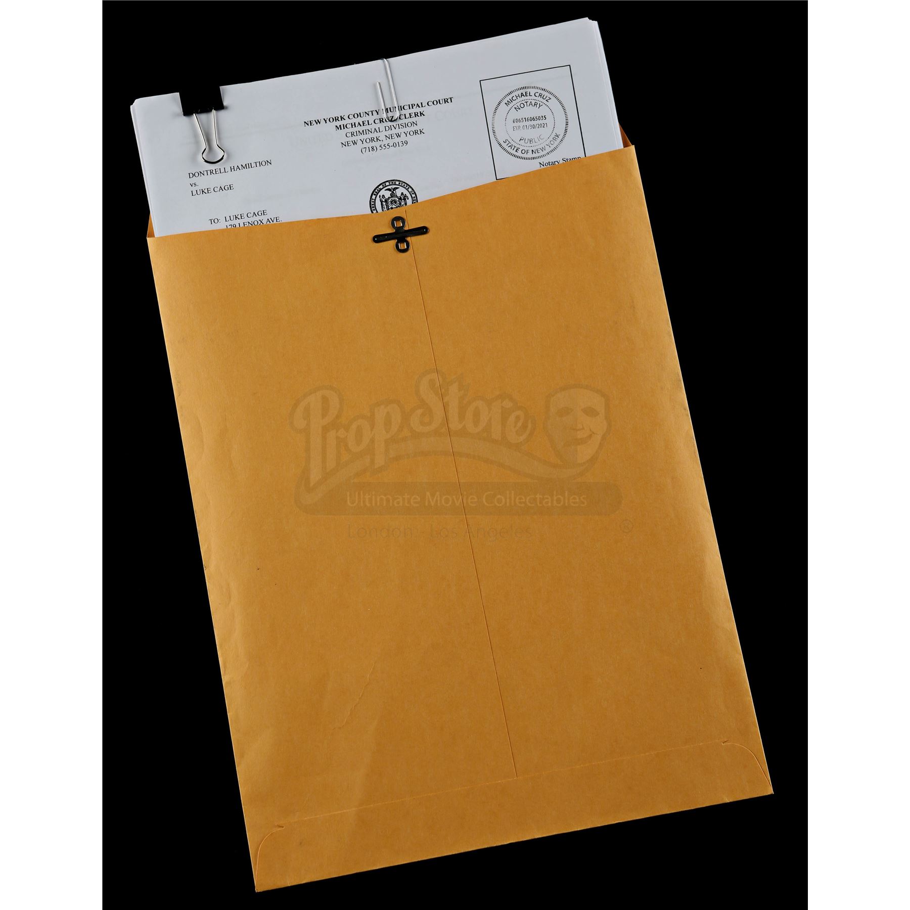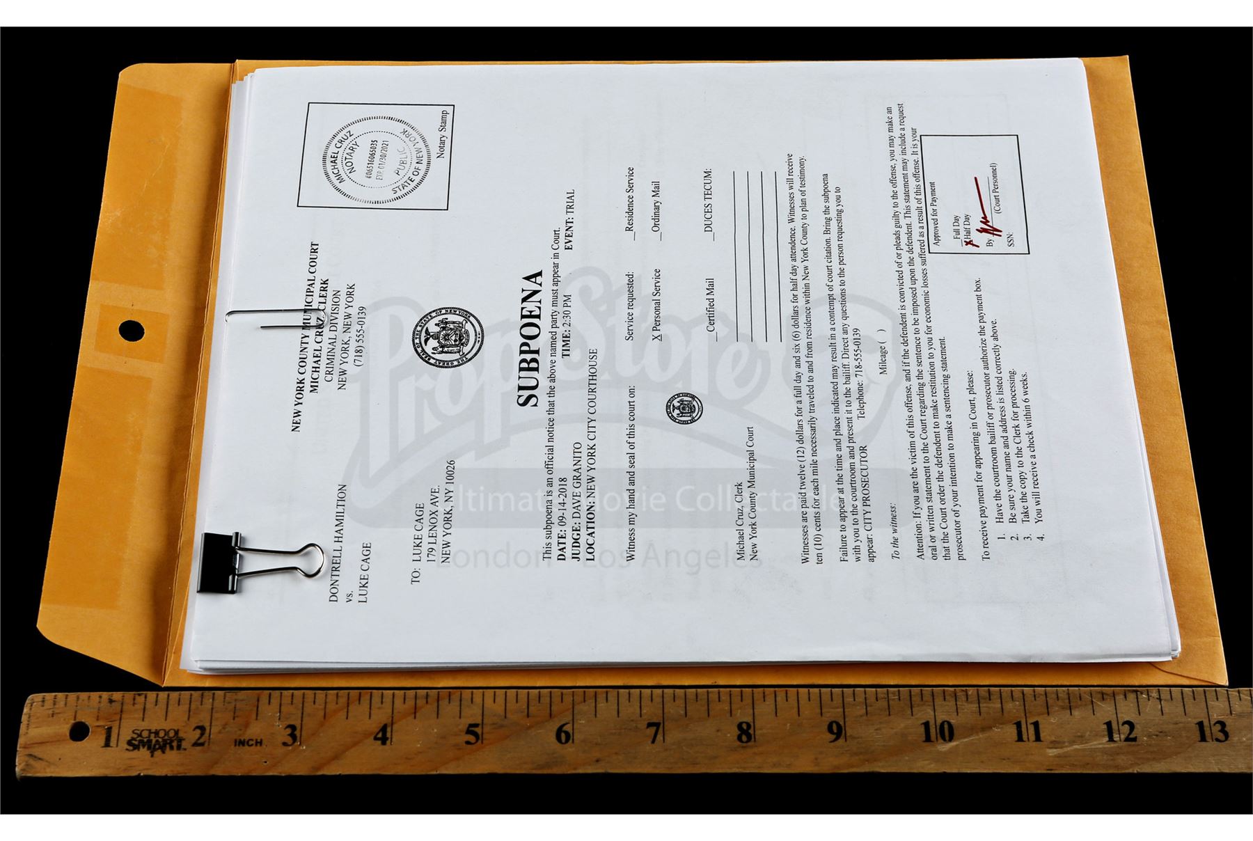 Luke Cage’s subpoena packet from the episode ‘All Souled Out’ (205) of Marvel's Luke Cage. In the episode, Cage shows Misty Knight the subpoena he was served for beating up Dontrell ‘Cockroach’ Hamilton. This lot consists of a manila envelope with 43 white sheets of faux legal documents printed on white paper and bound with a black plastic clip. It is in good overall condition with minor wear from production.