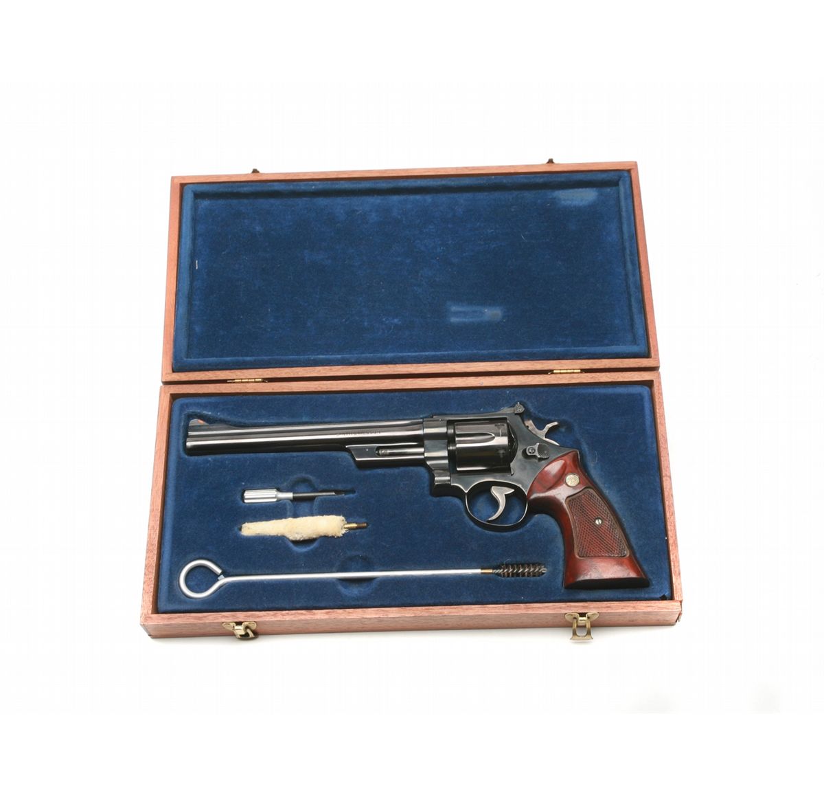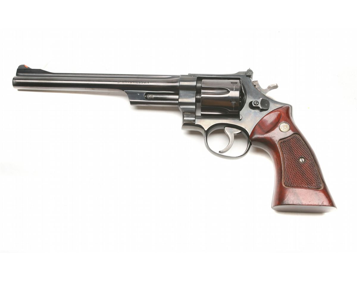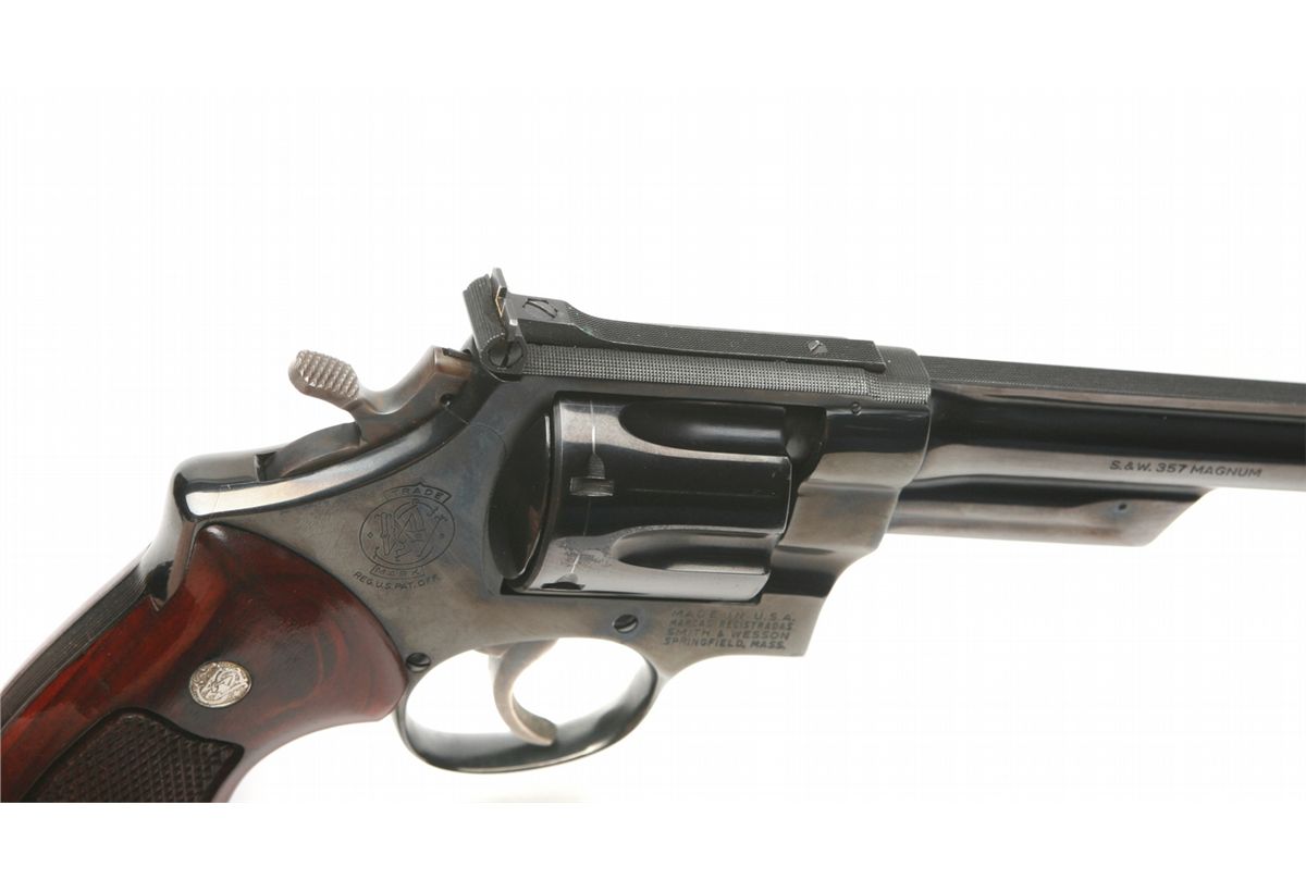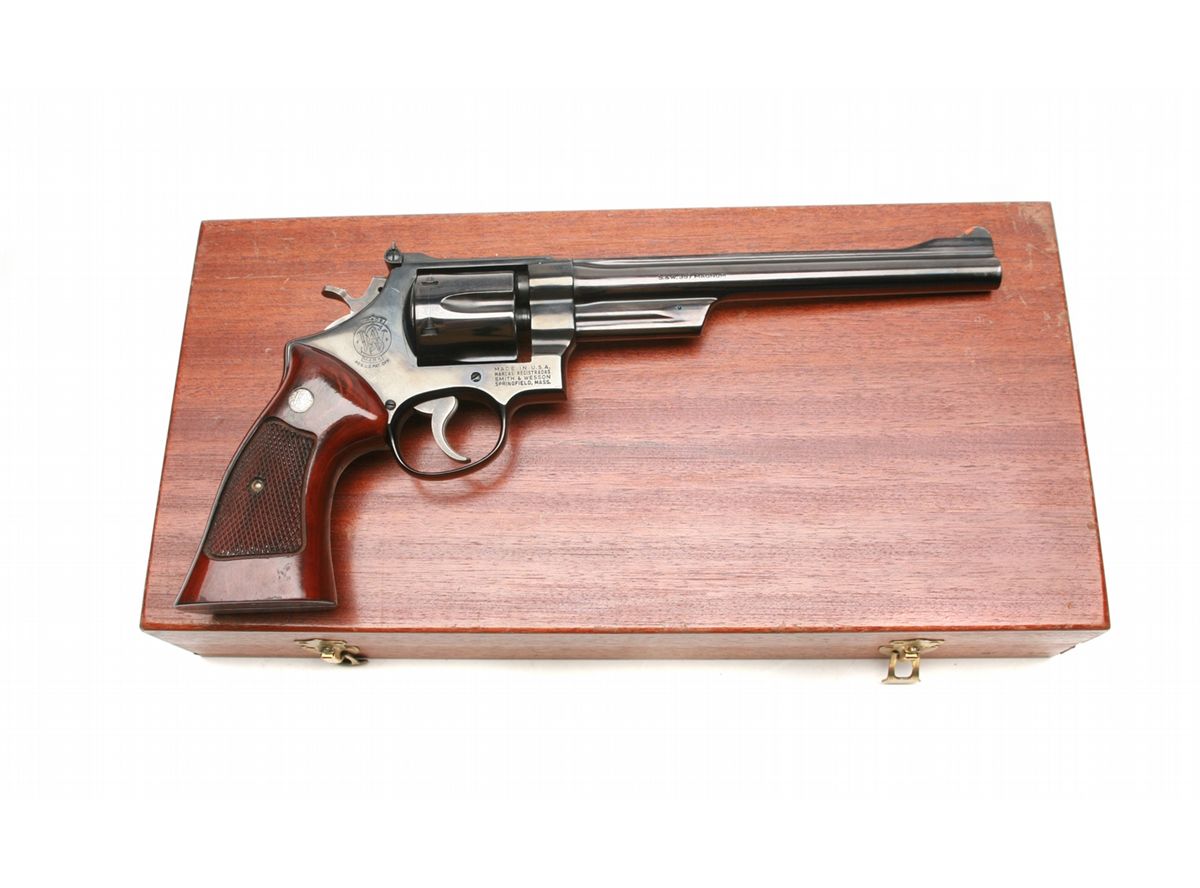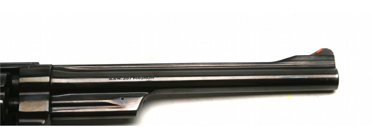 Excellent condition - 8 3/8" pinned ribbed 1/4 lug barrel - The .357 Magnum model - N frame - retains 97% blue finish - slight wear at muzzle - checkered walnut grips with S&W medallions in excellent condition - front raised serrated red ramp & rear white outline micrometer adjustable sights - crisp markings on barrel & frame - crisp yoke markings - 6-shot fluted cylinder - lockup & timing in excellent condition - 10 grooved backstrap - finely checkered topstrap - strong case color on hammer & trigger - serrated trigger - yr. mfg: 1961-82 - Factory wood display case - cleaning kit - SN N165590 - est. 800 - 1200 - FFL - 25JJCHKS028