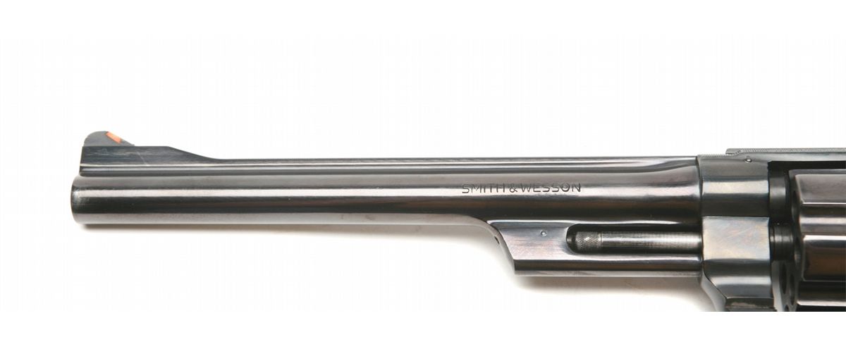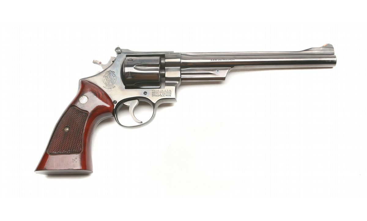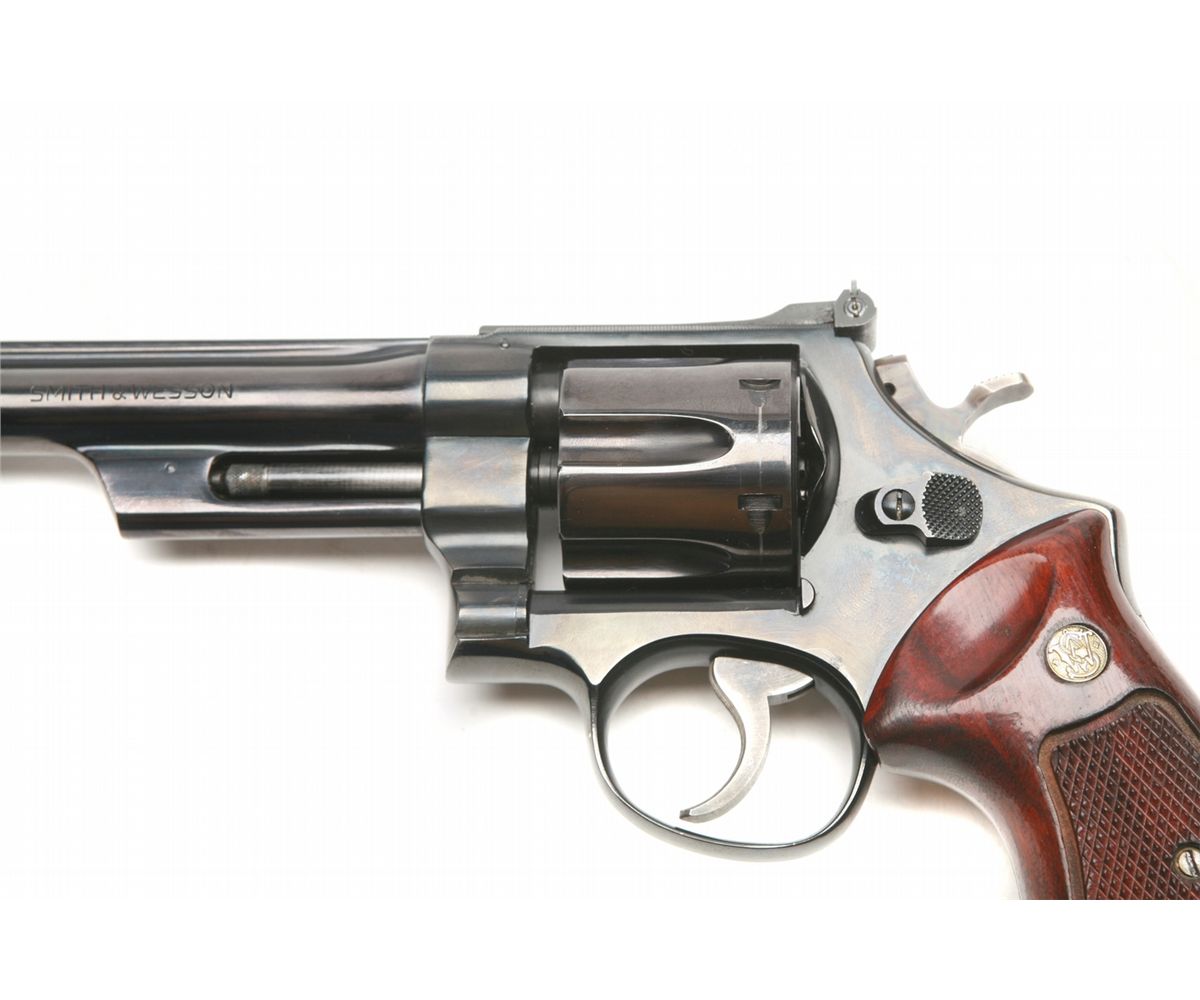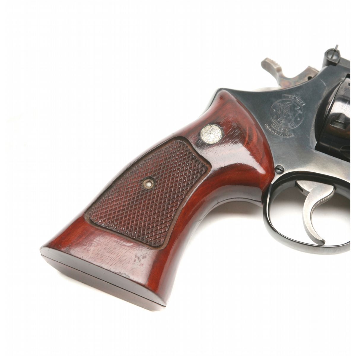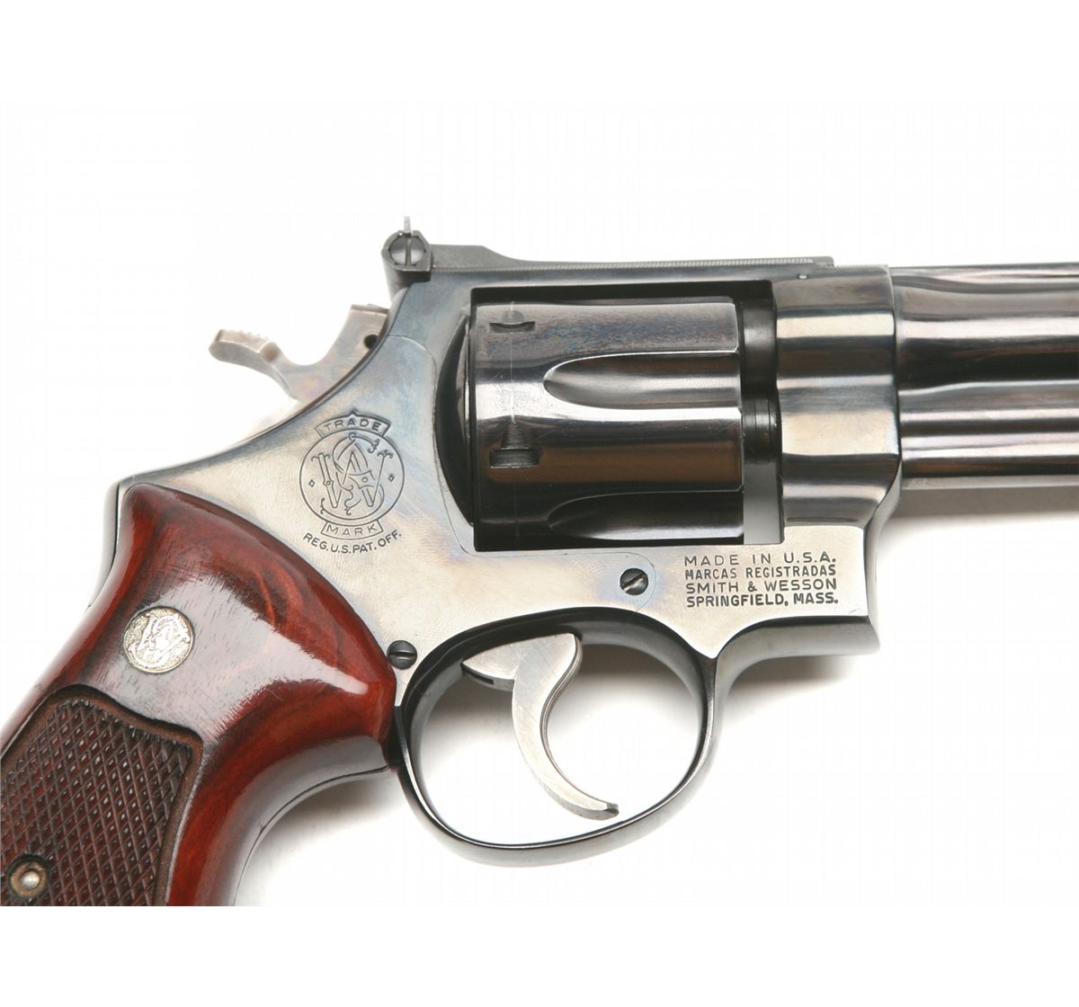 Excellent condition - 8 3/8" pinned ribbed 1/4 lug barrel - The .357 Magnum model - N frame - retains 97% blue finish - slight wear at muzzle - checkered walnut grips with S&W medallions in excellent condition - front raised serrated red ramp & rear white outline micrometer adjustable sights - crisp markings on barrel & frame - crisp yoke markings - 6-shot fluted cylinder - lockup & timing in excellent condition - 10 grooved backstrap - finely checkered topstrap - strong case color on hammer & trigger - serrated trigger - yr. mfg: 1961-82 - Factory wood display case - cleaning kit - SN N165590 - est. 800 - 1200 - FFL - 25JJCHKS028