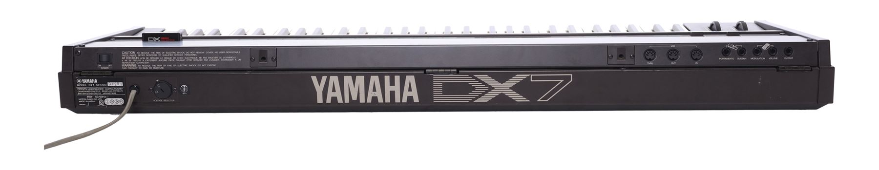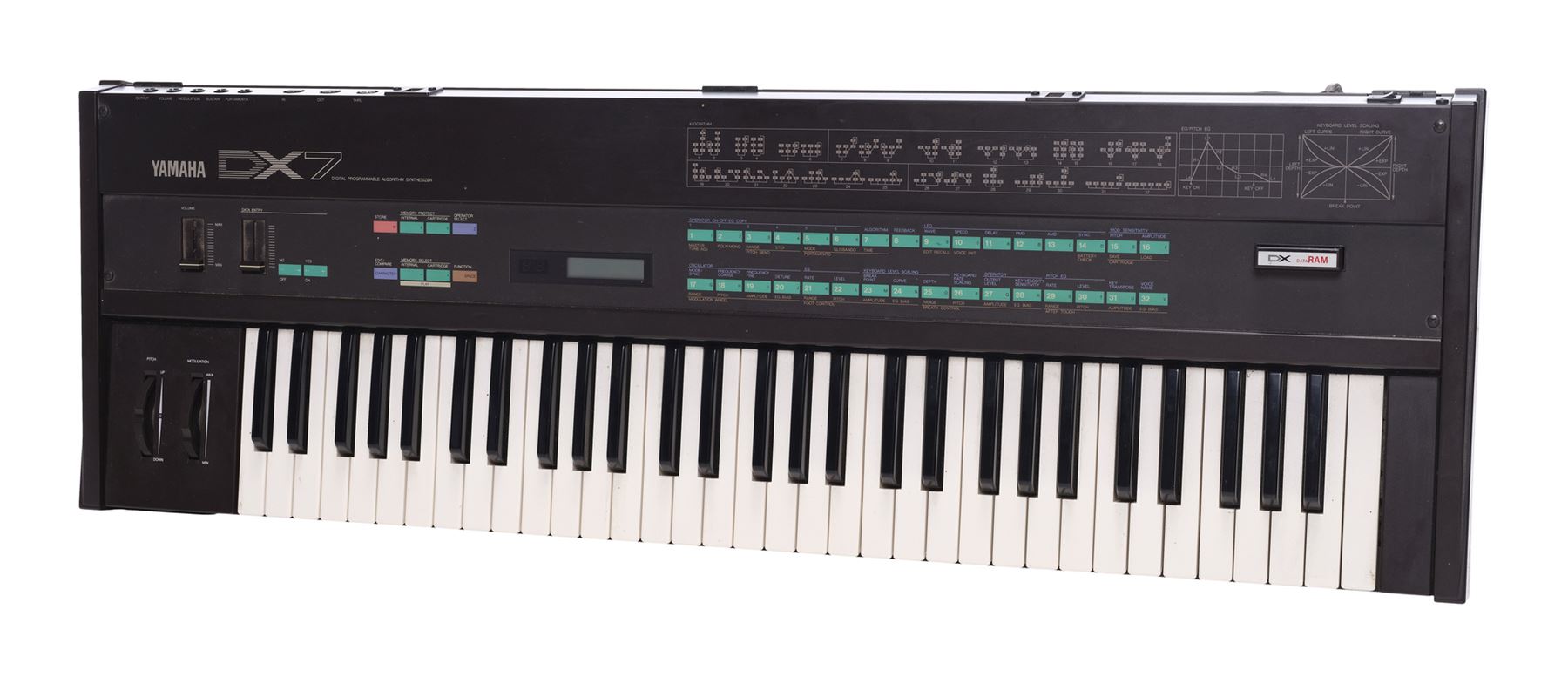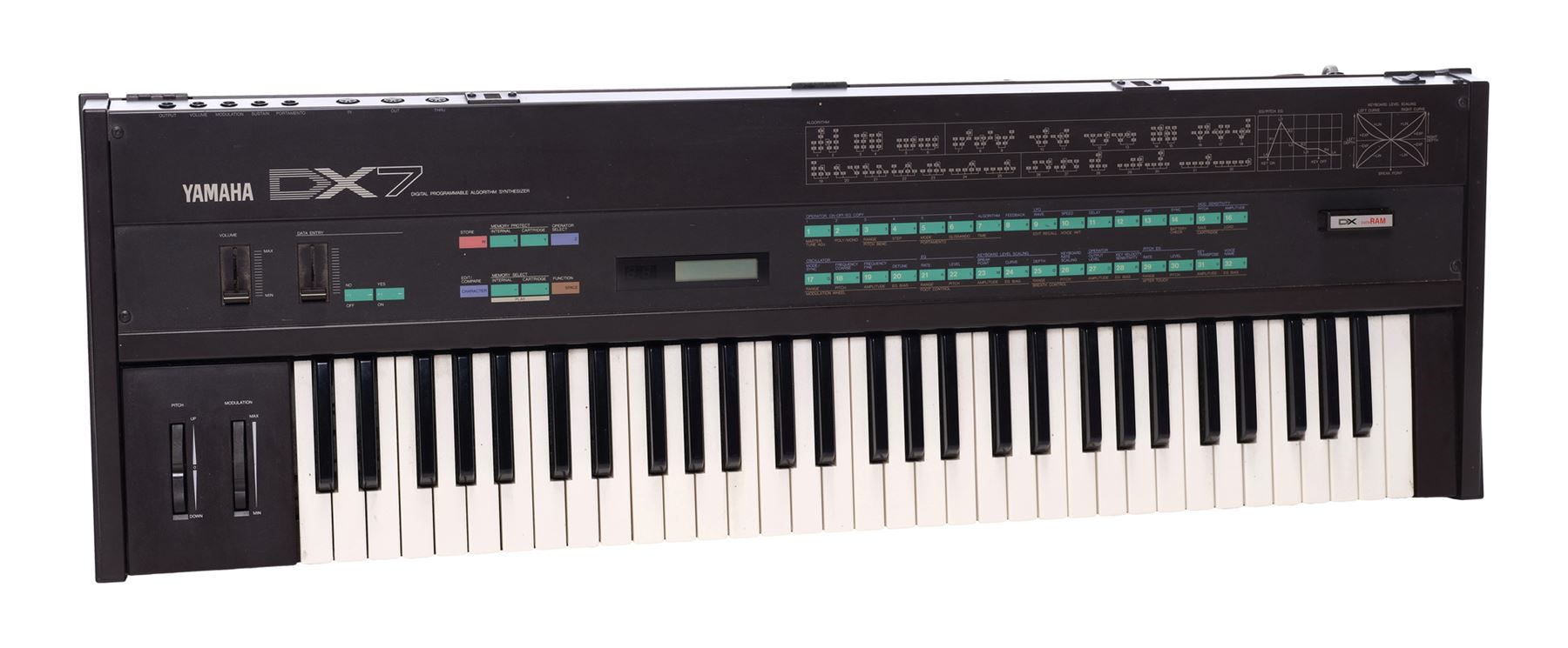 A Yamaha DX7 synthesiser that once belonged to Bill Wyman of the Rolling Stones. The DX7's FM synthesis method allowed it to generate a wider variety of unique sounds, which led to the instrument's long-held popularity.