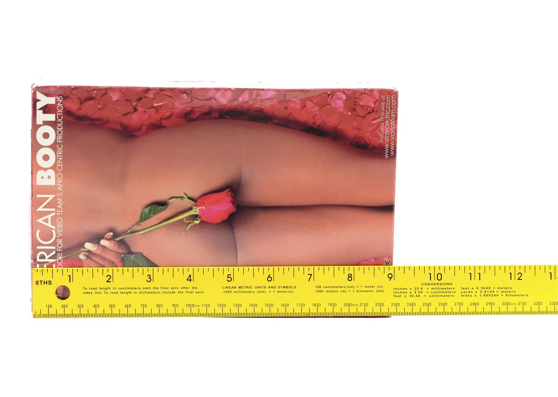 This lot consists of a VHS cassette applied with a "Logjammin'" decal featuring a "Treehorn Productions" logo and four explicit, production-made XXX VHS covers for films titled "Anus & Andy," "Shevann's Schvanz!," "Fist Fuck Inn," and "American Booty." The covers exhibit corner and edge wear throughout, and the cassette's contents and functionality remain untested. Dimensions: (largest) 9" x 5.75" x 2" (23 cm x 18 cm x 5 cm)