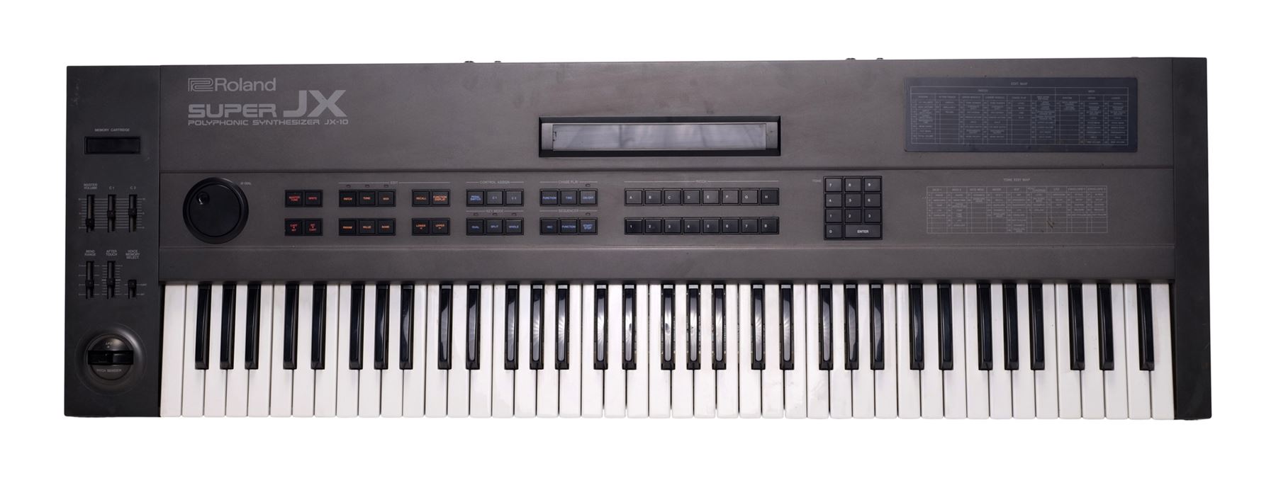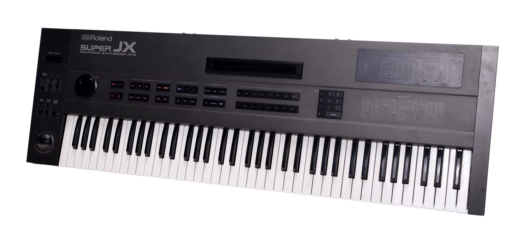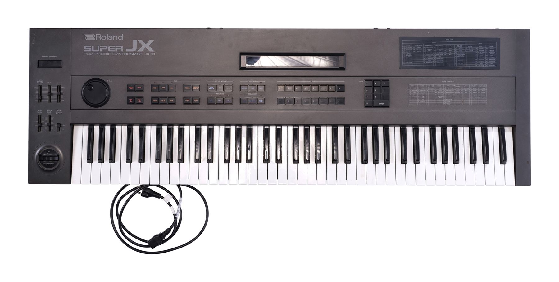 A Roland JX-10 Super JX synthesiser that once belonged to Bill Wyman of the Rolling Stones. The JX-10 improved upon the sound and features of its predecessor, the JX-8P, and was the last true analog synthesiser made by Roland for nearly 30 years.