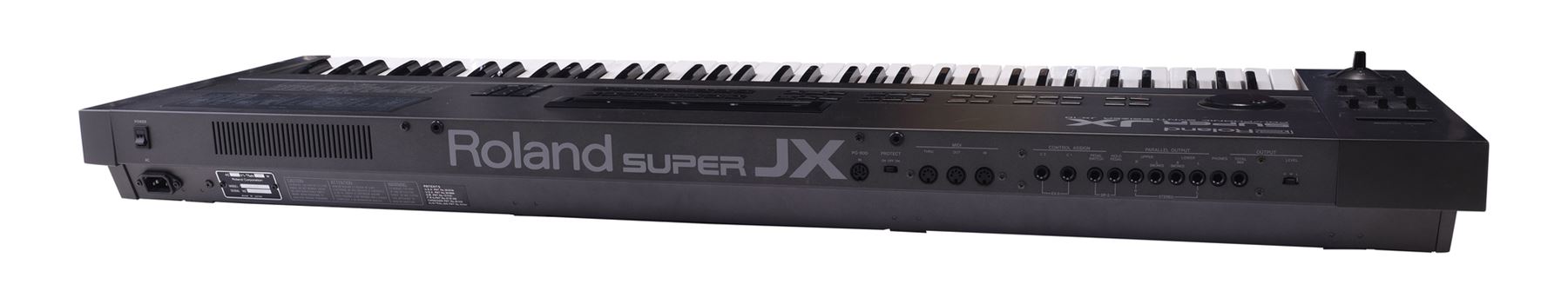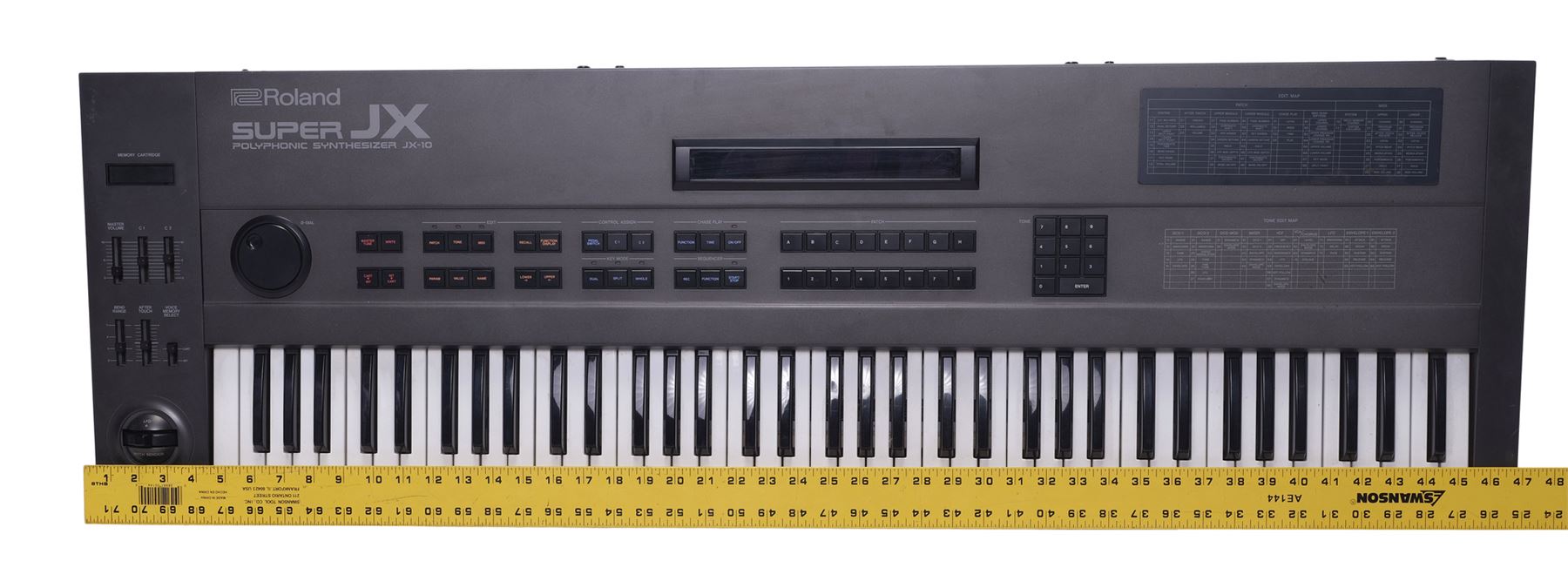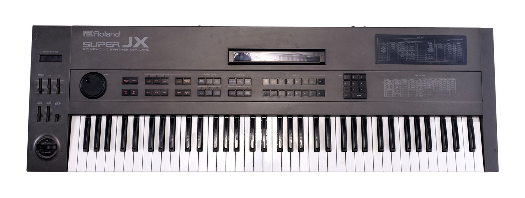 A Roland JX-10 Super JX synthesiser that once belonged to Bill Wyman of the Rolling Stones. The JX-10 improved upon the sound and features of its predecessor, the JX-8P, and was the last true analog synthesiser made by Roland for nearly 30 years.