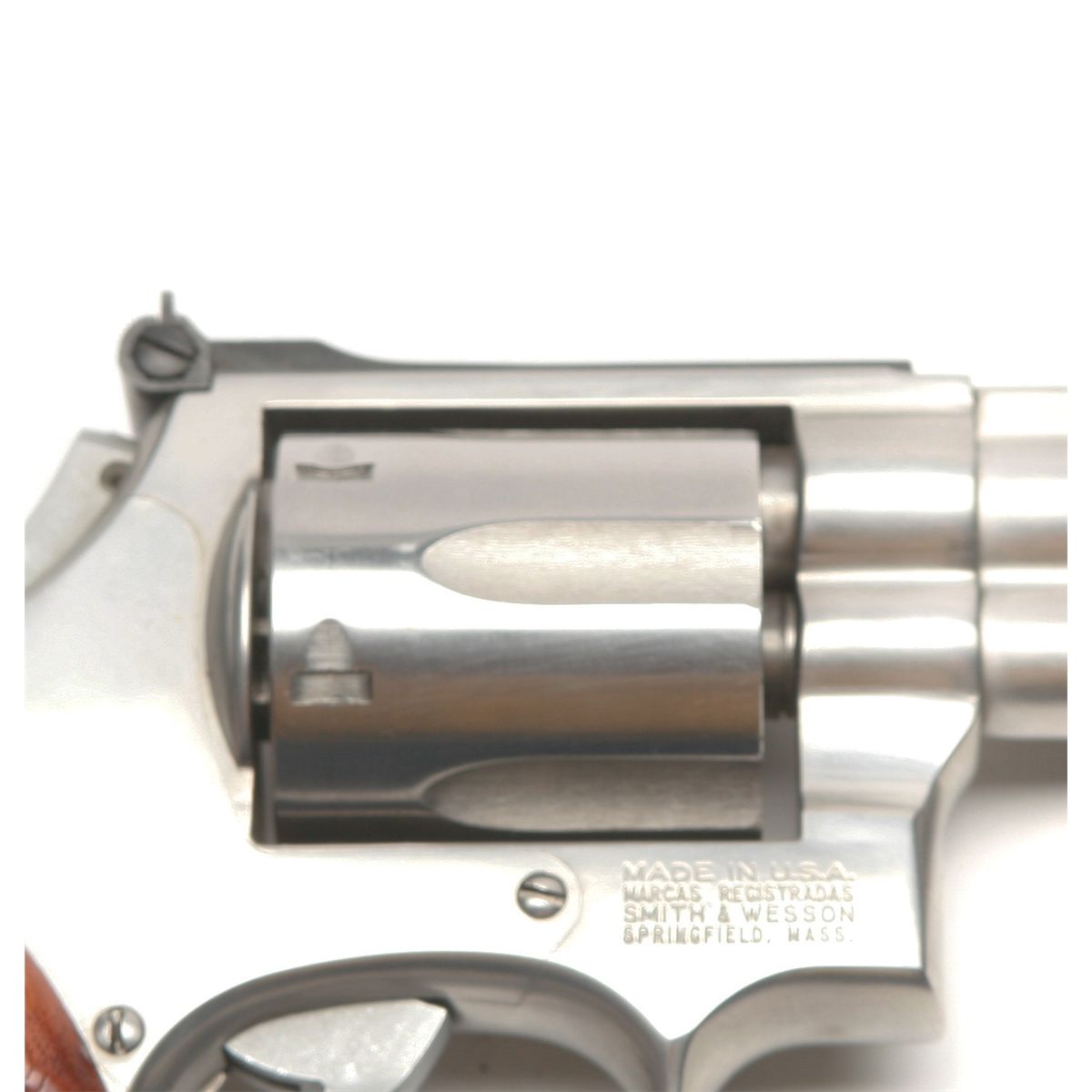 ANIB condition - 6" full lug ribbed barrel - The .357 Distinguished Combat Magnum Stainless model - L frame grips - retains 99% stainless finish - checkered Goncalo Alves with S&W medallions in excellent condition - front raised red serrated fixed ramp & rear white outline micrometer adjustable sights - crisp markings on barrel & frame - crisp yoke markings - 6-shot fluted cylinder - serrated trigger - 10 grooved backstrap - grooved topstrap - appears unfired - yr. mfg: 1986-87 - one piece factory box - manual - SN AVE3793M - est. 400 - 600 - FFL - 25JJCHKS031