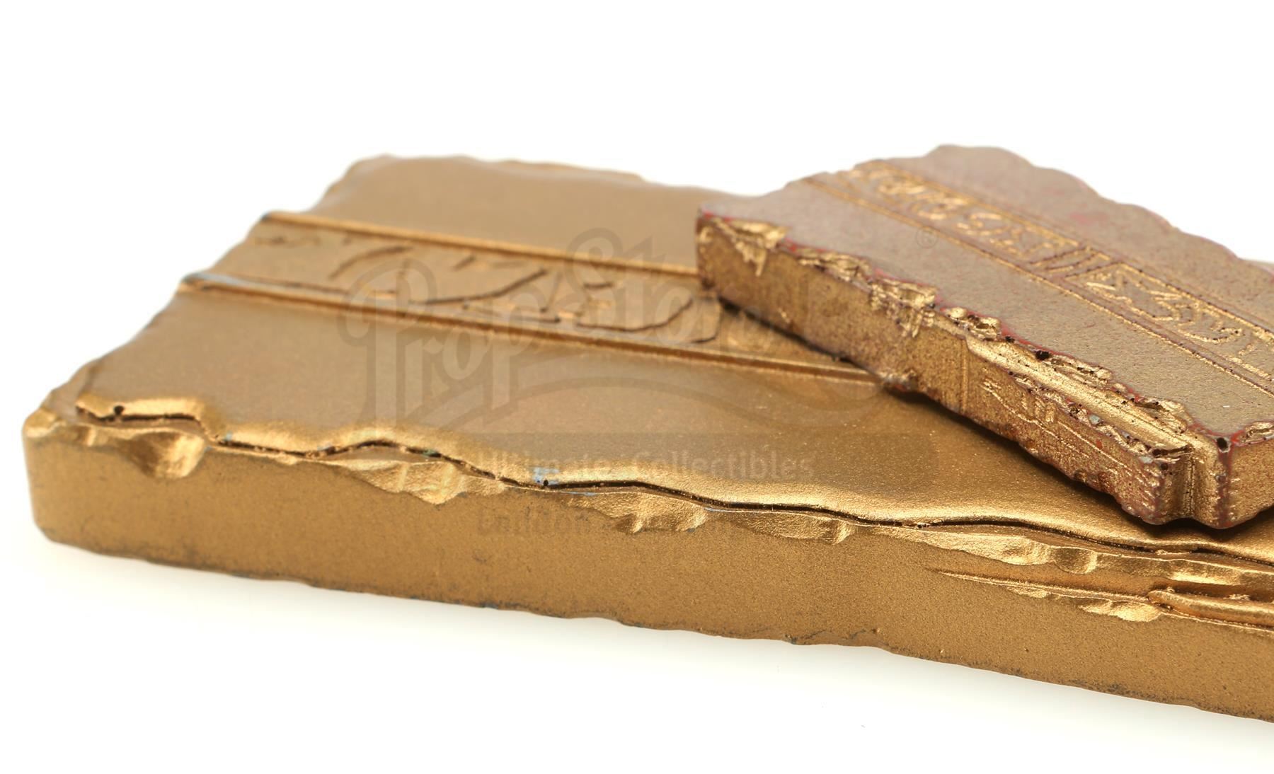 The resin phaser is painted primarily brown with details including sculpted buttons, the Ferengi Alliance insignia in green, and a metal emitter tip on the front. The two pieces of gold-pressed latinum, in the sizes known in-canon as a "slip" and a "bar," are also resin painted in a metallic goldtone.