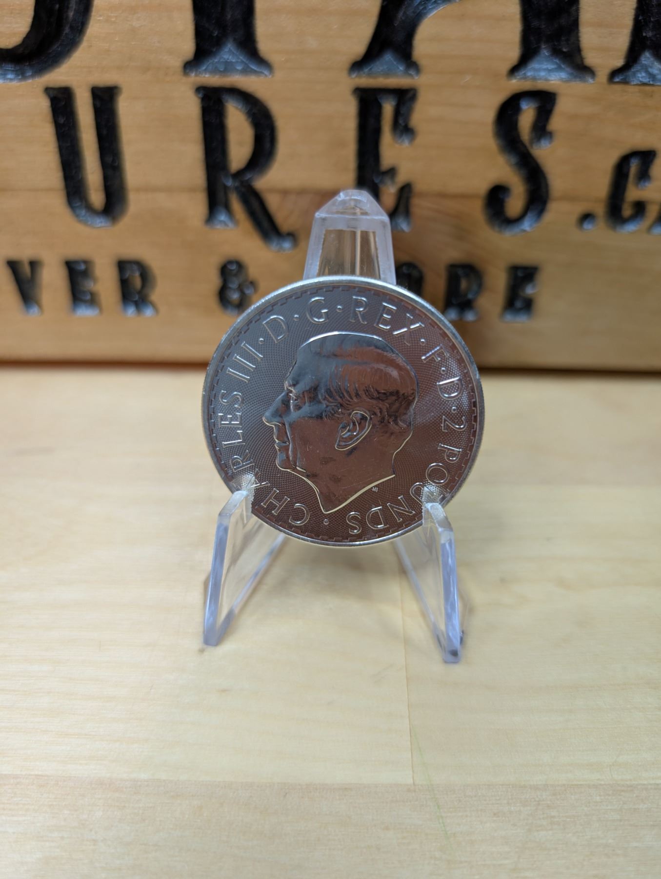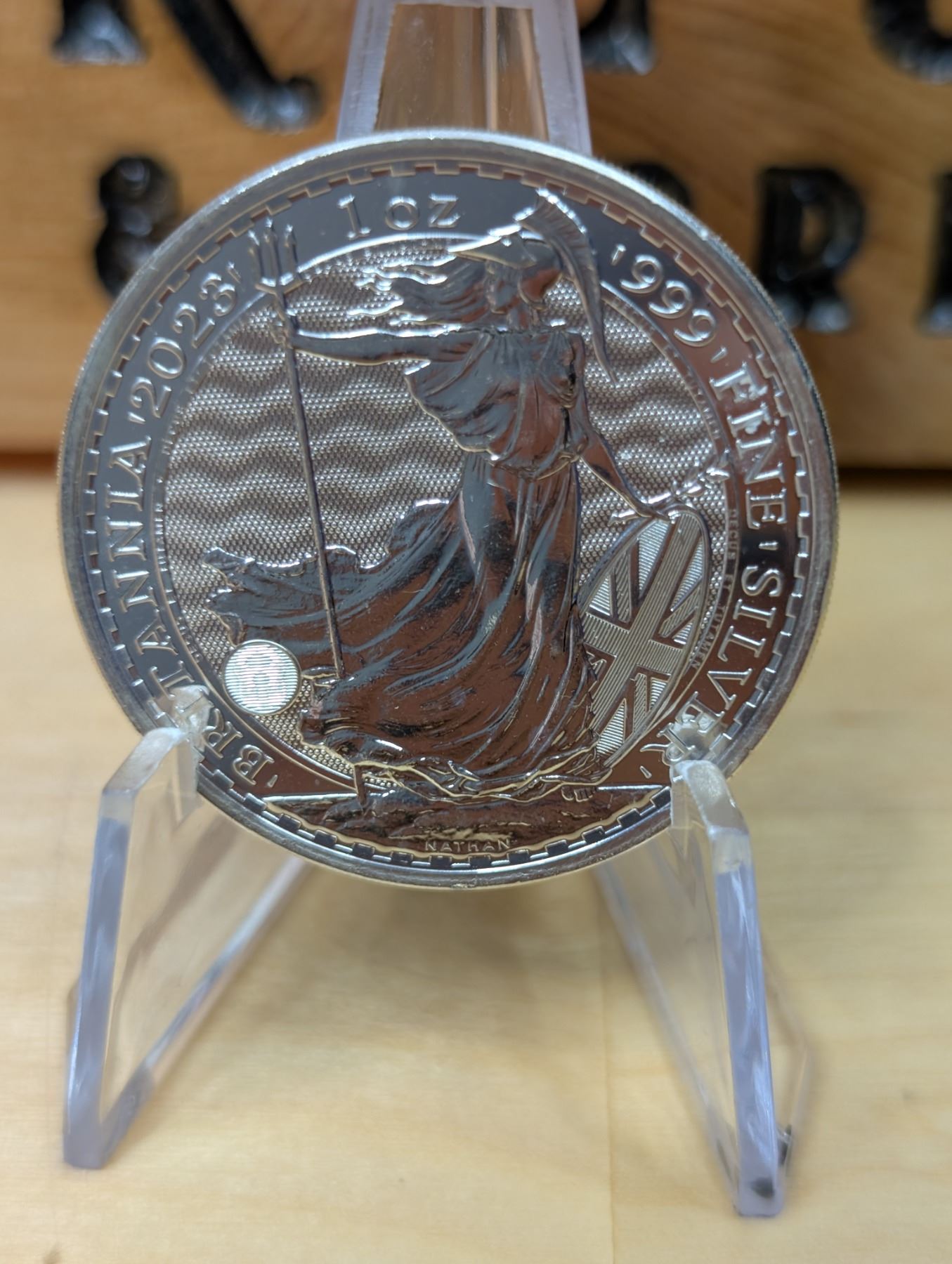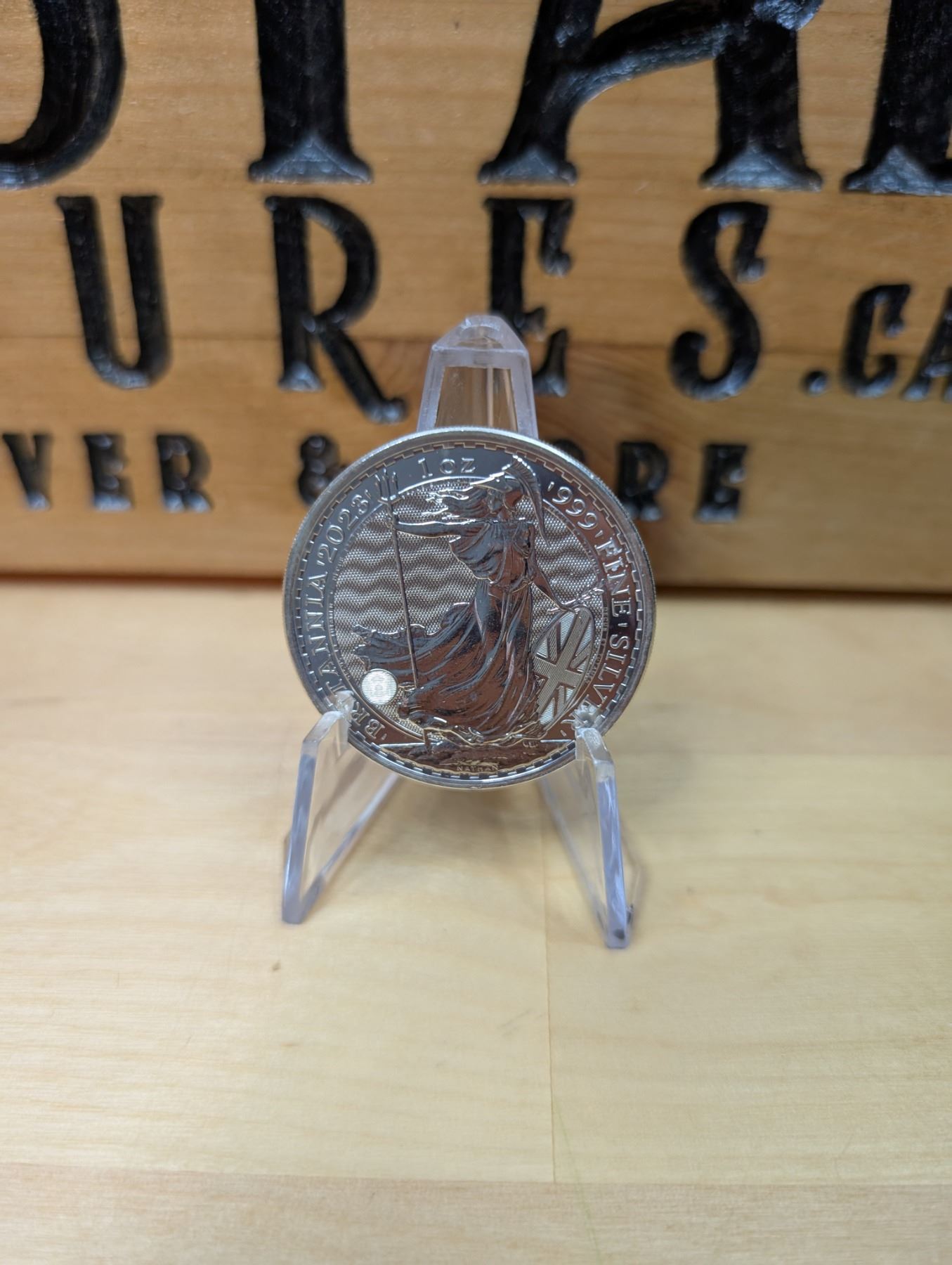 The 1 oz Britannia 2023 silver round is made from .999 fine silver and features the iconic Britannia design, symbolizing British strength and heritage. Issued by various mints, it typically showcases Britannia in a classical pose, holding a trident and shield. The value of the round is influenced by the current silver price and its appeal to collectors.