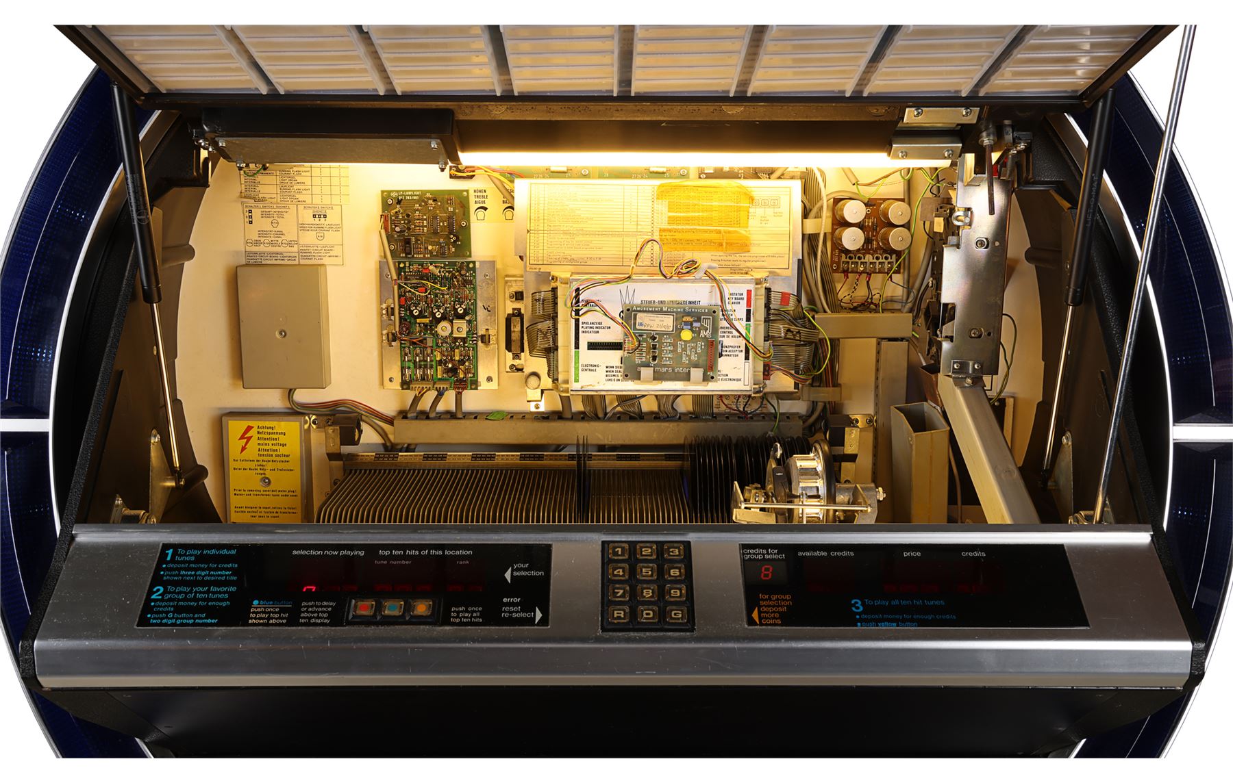 The lot comes with an extensive collection of over 1,000 records, with artists including The Beatles, The Rolling Stones, The Police, Kate Bush, Suzi Quatro, Elvis Presley and The Animals. Its music-playing functionality remains untested, and the jukebox exhibits minor scuffing, marks and general dirt from age. Dimensions: 68 cm x 107 cm x 142 cm (26 3/4" x 42" x 55 3/4")