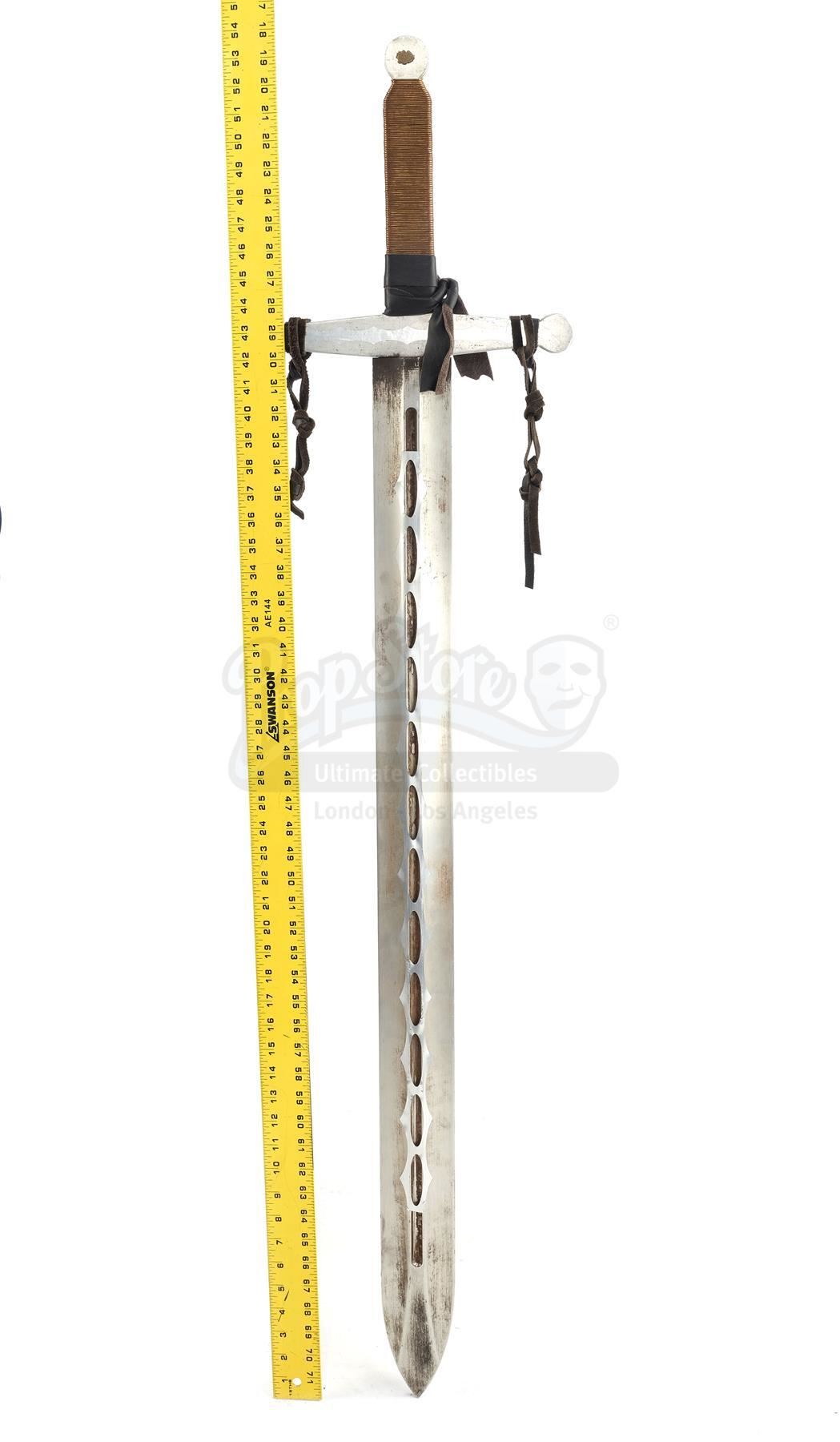 The large sword is made of silvertone metal with bronze-colored wire wrapped tightly around the grip, silvertone tape cut into a decorative pattern adhered along one side's guard and fuller strips of dark brown leather tied at both ends of the guard and the grip. The pommel has bronzetone metal in the center of either side. The sword is in good overall condition with some wear from production and age in addition to its production-made weathering, including scratches and tears in the metallic tape, areas of discoloration or small stains along the blade, and various scuffs and dents throughout.