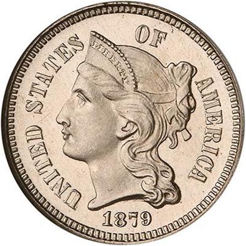 1879 Nickel Three Cents. A lovely bright little cameo Proof with glinting surfaces, razor-sharpness on both sides, and grand eye appeal. (#83775)