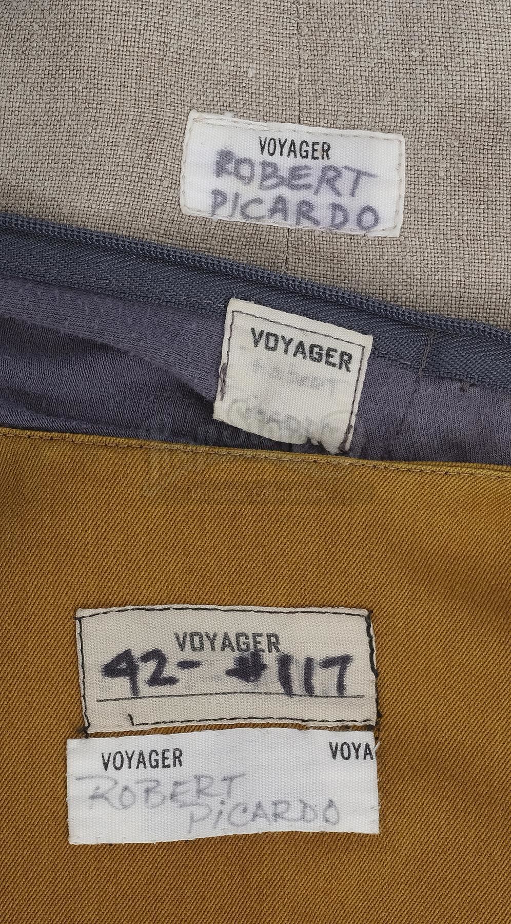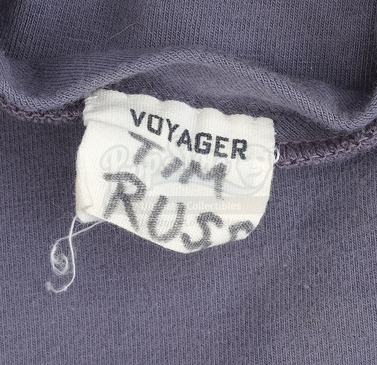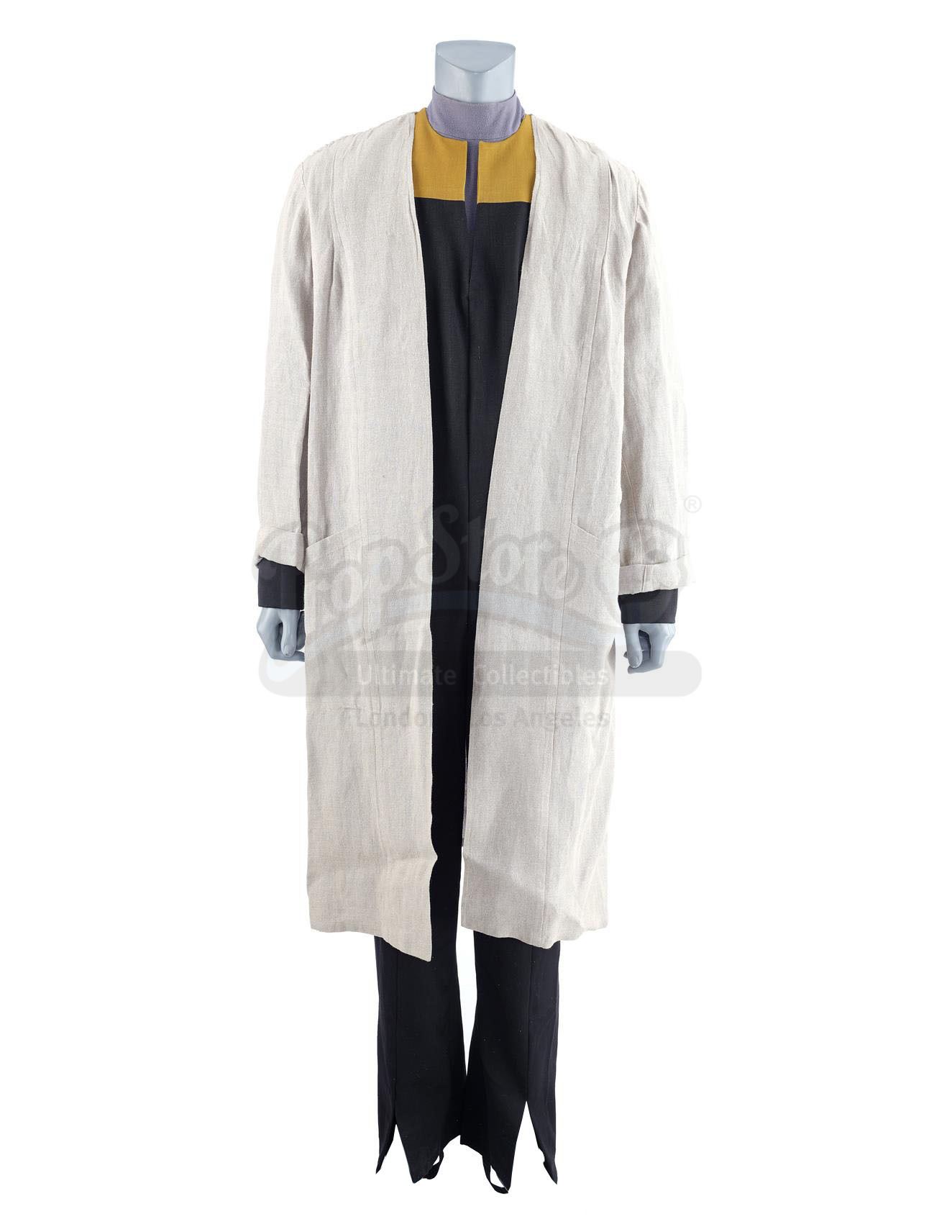 This black wool operations division zip-up jumpsuit uniform with the signature dark yellow features a Velcro patch on front for affixing a Starfleet badge, Velcro closures on the cuffs, tapered ankles with shoe stirrups, and two tags sewn into the collar reading "VOYAGER 42-#117" and "Robert Picardo." Included with the main uniform is a gray cotton-blend undershirt with a zip back, latch collar, snap under-strap, and a sewn-in tag reading "VOYAGER Robert Picardo." The light brown linen lab coat features an open front, two pockets, and a sewn-in tag reading "VOYAGER Robert Picardo."