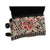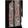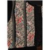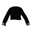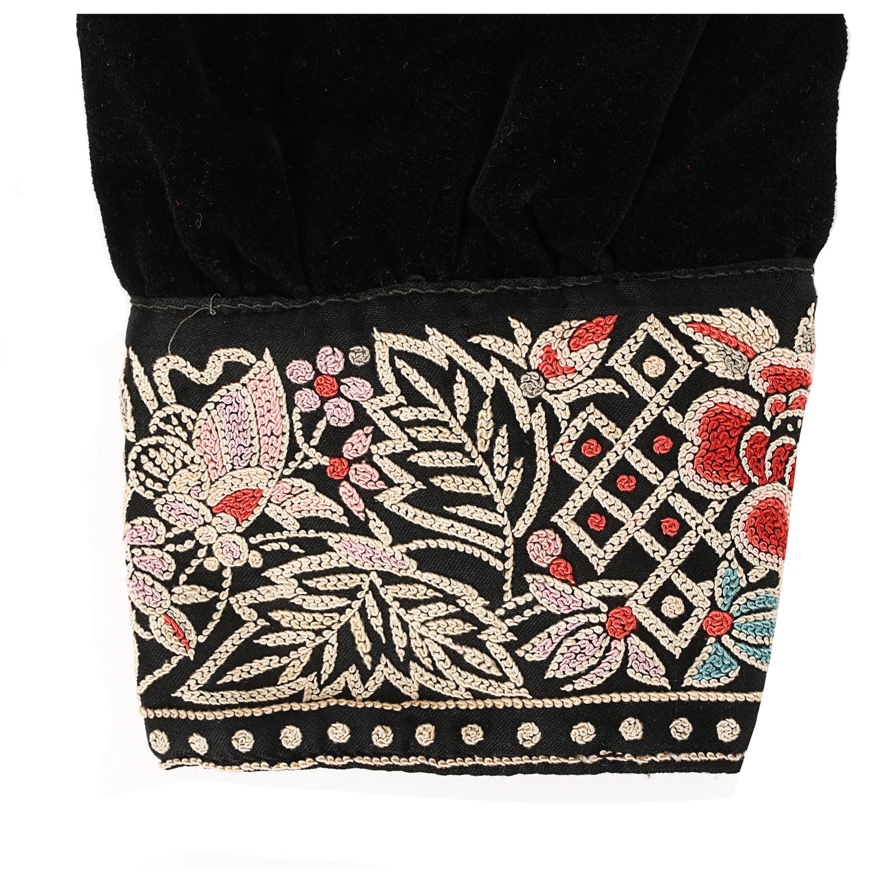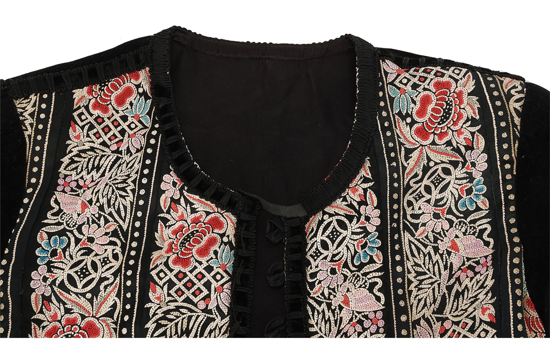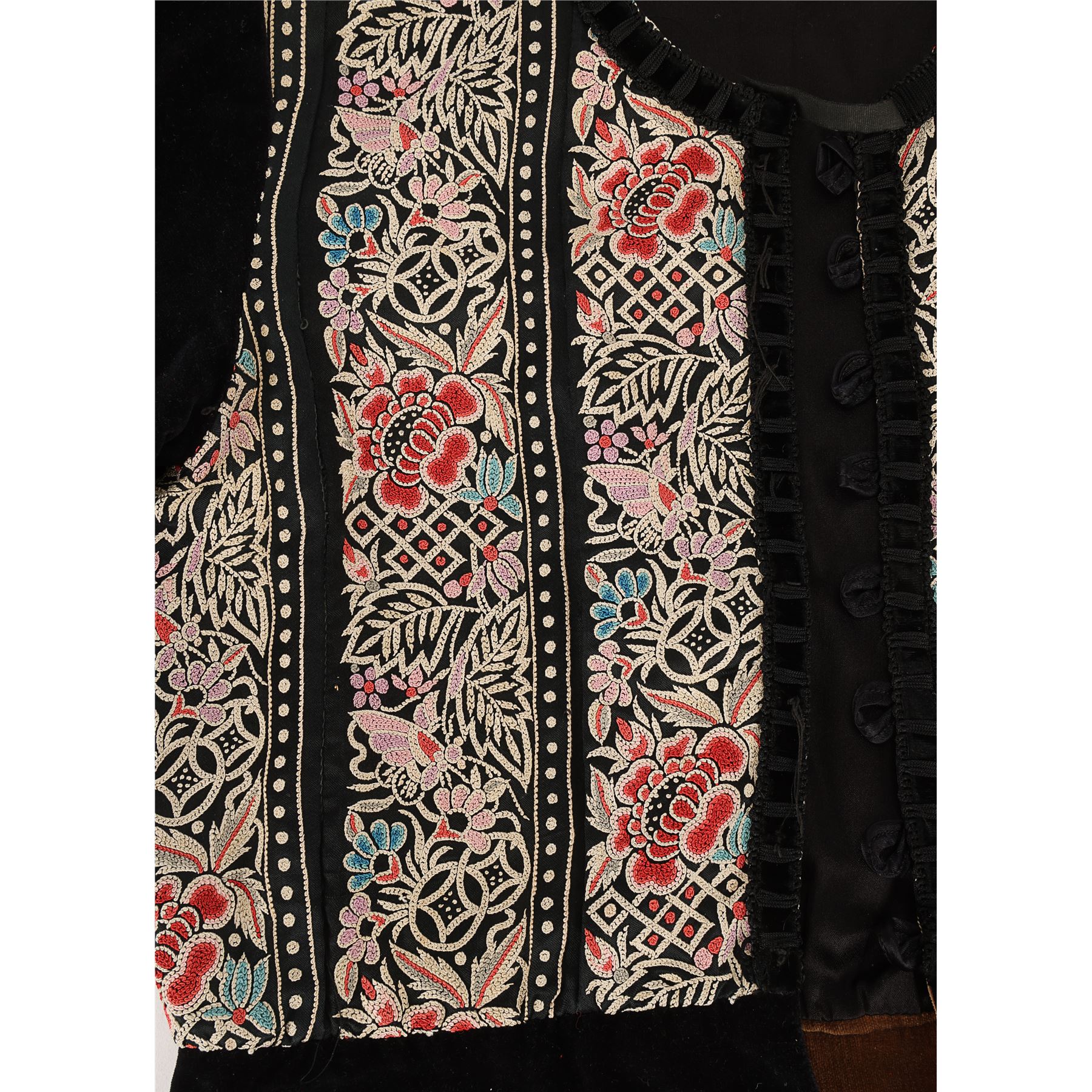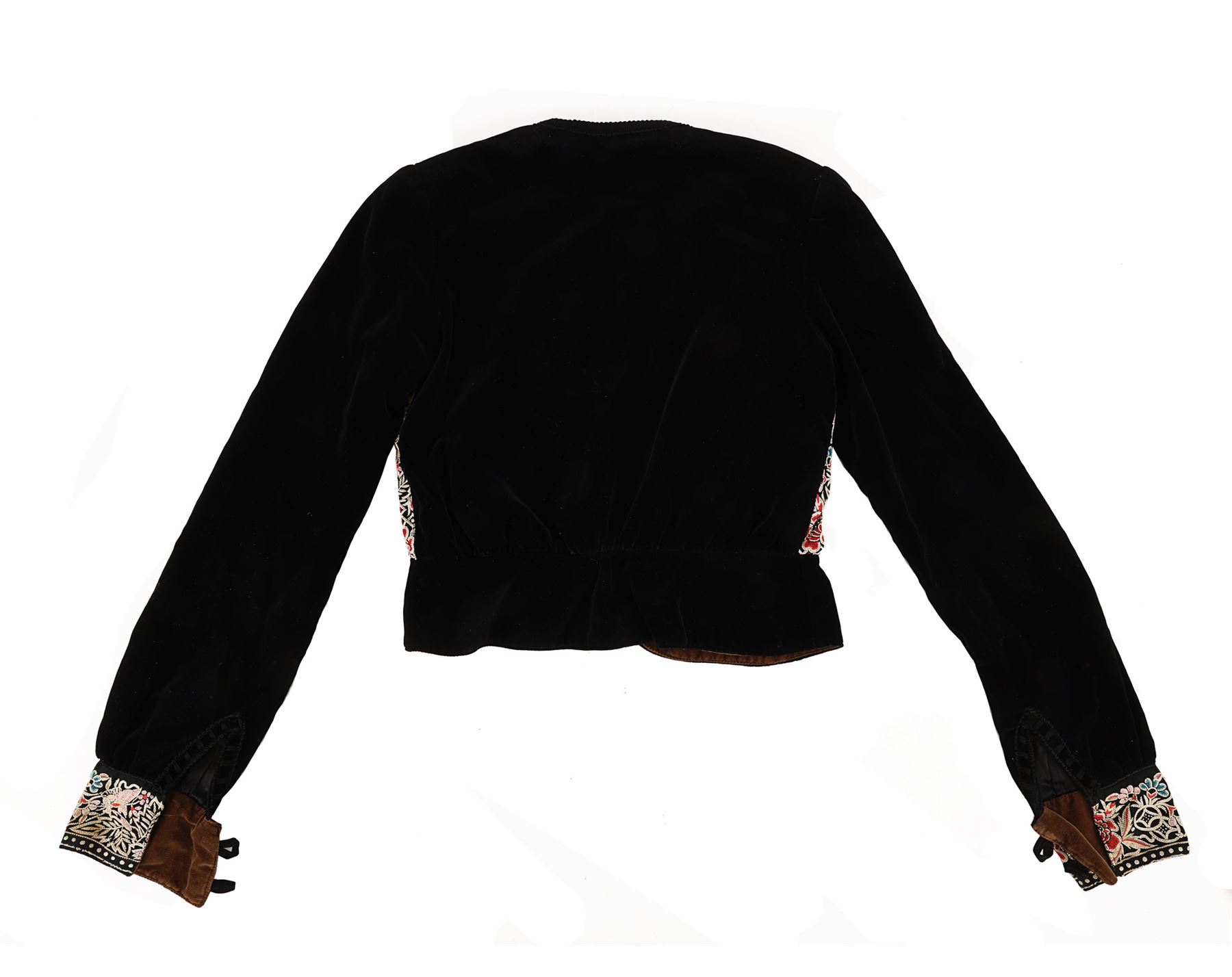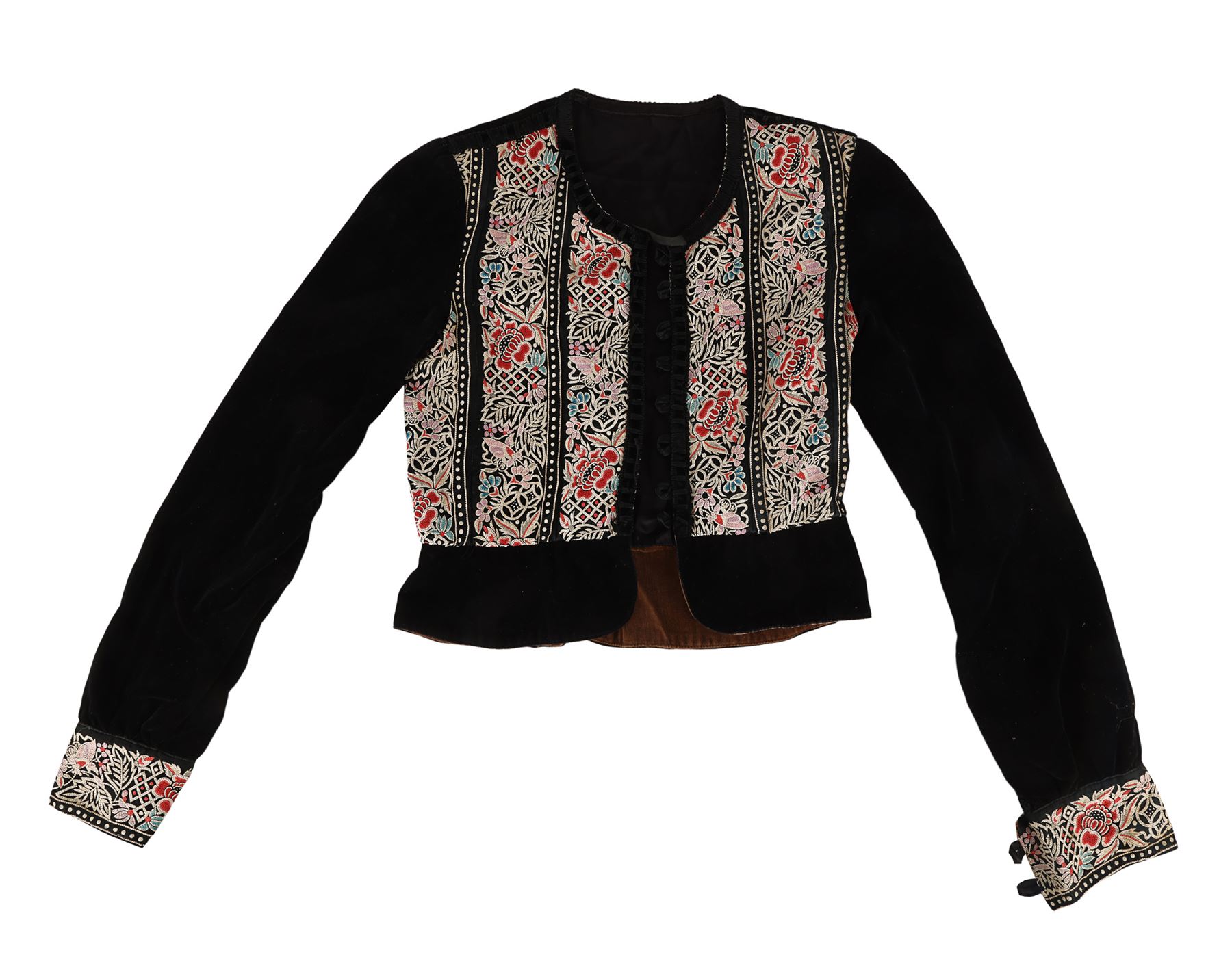 The black velvet cropped jacket features highly decorative embroidered panels on the front, and the inside is lined in black satin. Similar intricate embroidery adorns the sleeve cuffs. The garment is missing all of its buttons, leaving only threads where they once were. The lot is accompanied by a letter from a previous owner detailing its history.