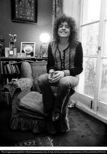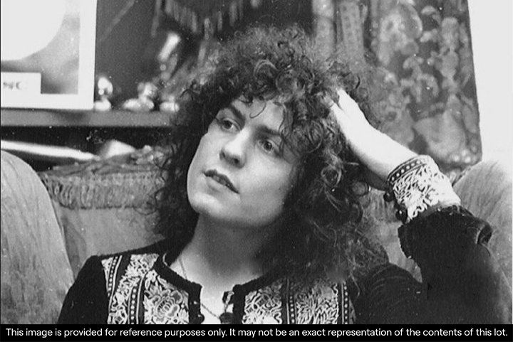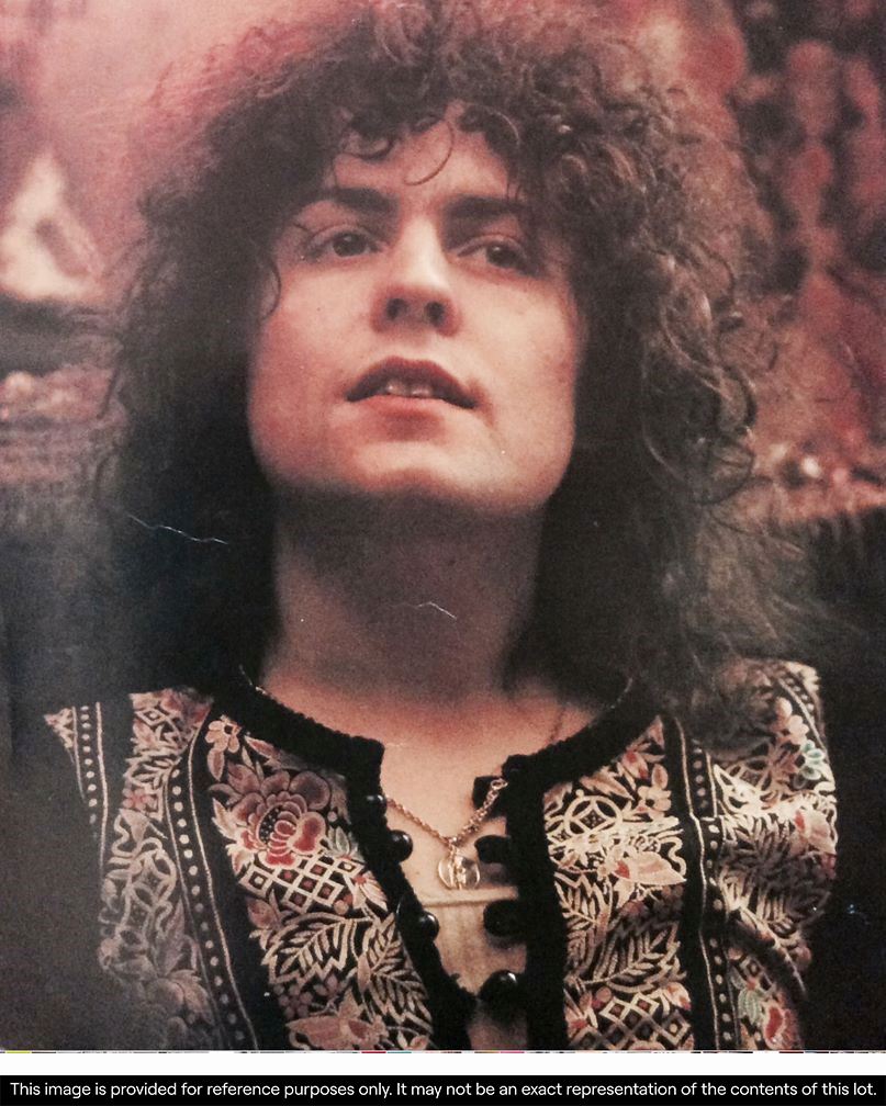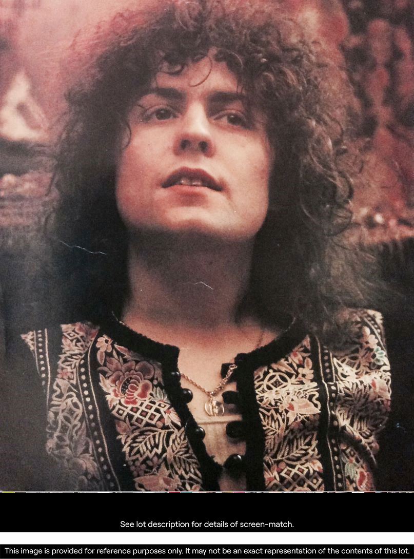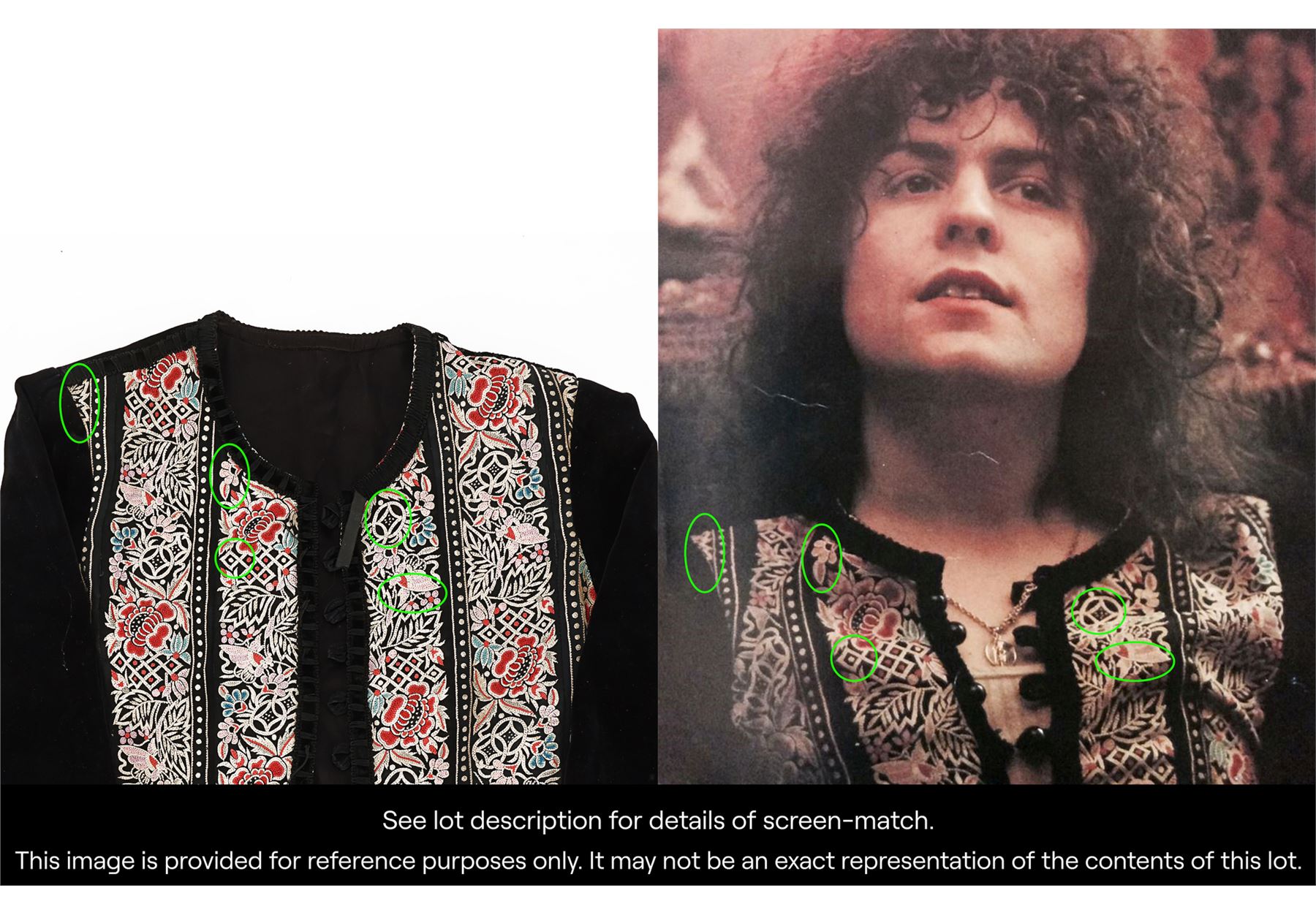 A jacket which originally belonged to Marc Bolan, the frontman of English rock band T. Rex. Bolan is shown wearing the jacket in photographs taken in 1972 by Barry Wentzell at Bolan's Clarendon Gardens home in London. The positioning of some of the embroidered patterns can be matched to one of these photos. It is believed the jacket was initially obtained from an assistant of Bolan's first wife, June Child, by a collector during the late 1970s.