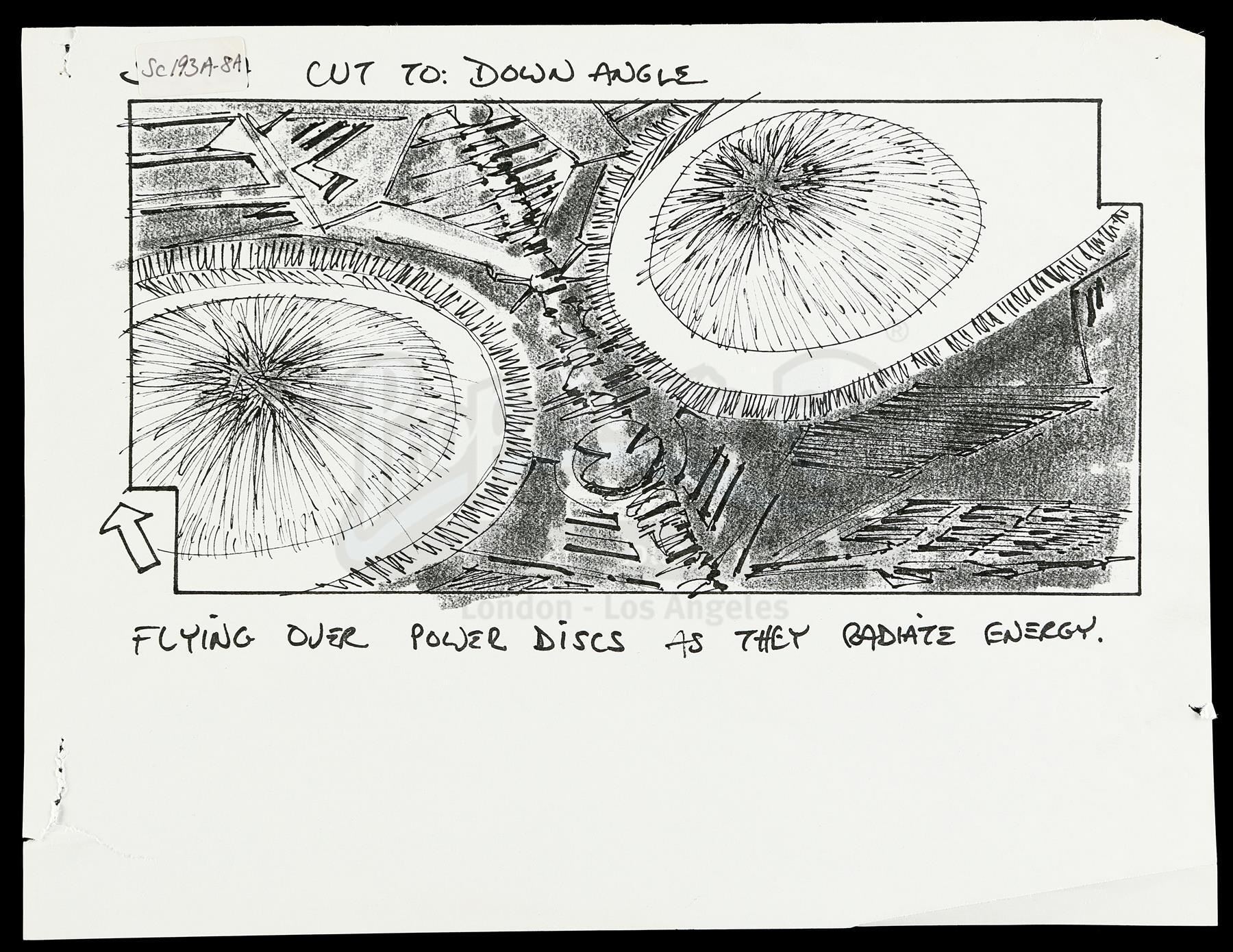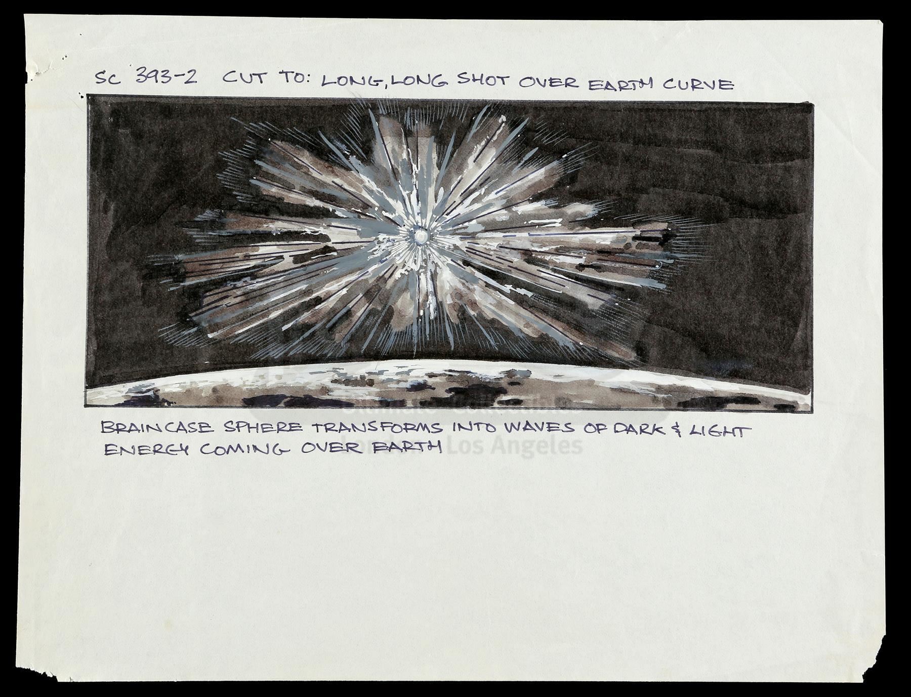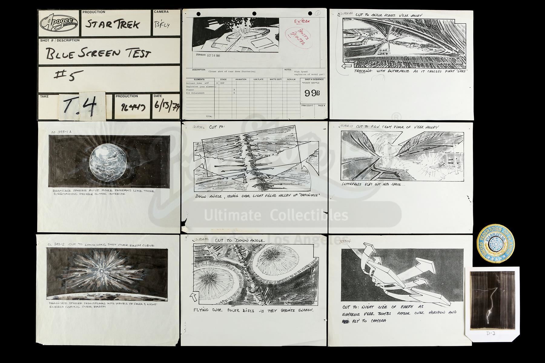 Production ephemera and a patch from Robert Wise's space adventure Star Trek: The Motion Picture. This lot includes items made by and used during production, including two hand-illustrated ink and paint storyboards depicting the Braincase sphere, six black-and-white printed storyboard copies, a paper production slate labeled "Blue Screen Test", a black-and-white Polaroid of a lightning strike, and a blue and yellow United Federation of Planets Starfleet HQ iron-on patch. The lot exhibits minimal signs of wear from production use and age, and remains in good overall condition. Dimensions (largest): 8 1/2" x 11" (21.5 cm x 28 cm); (smallest): 3" x 3" x 1/4" (8 cm x 8 cm x 1 cm)