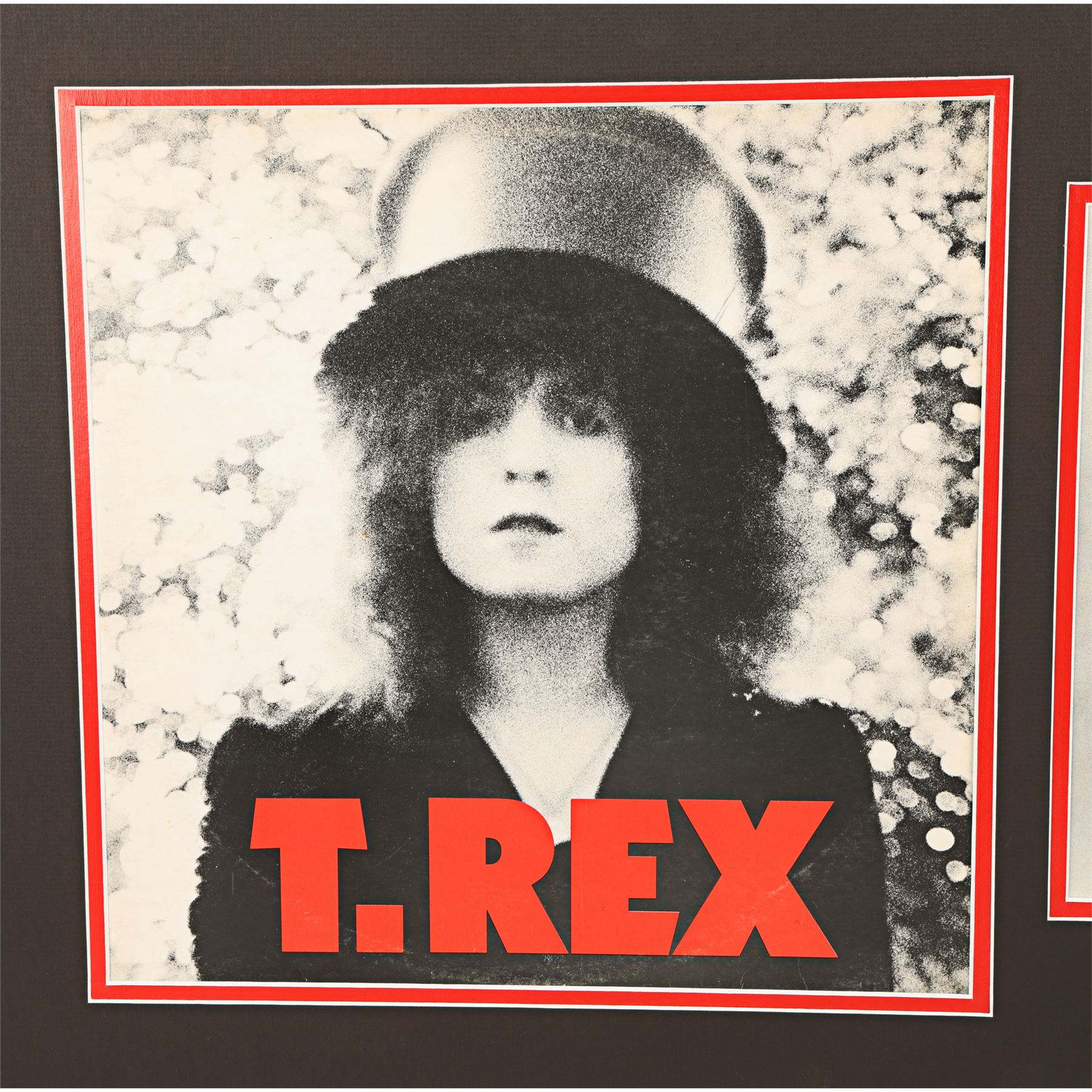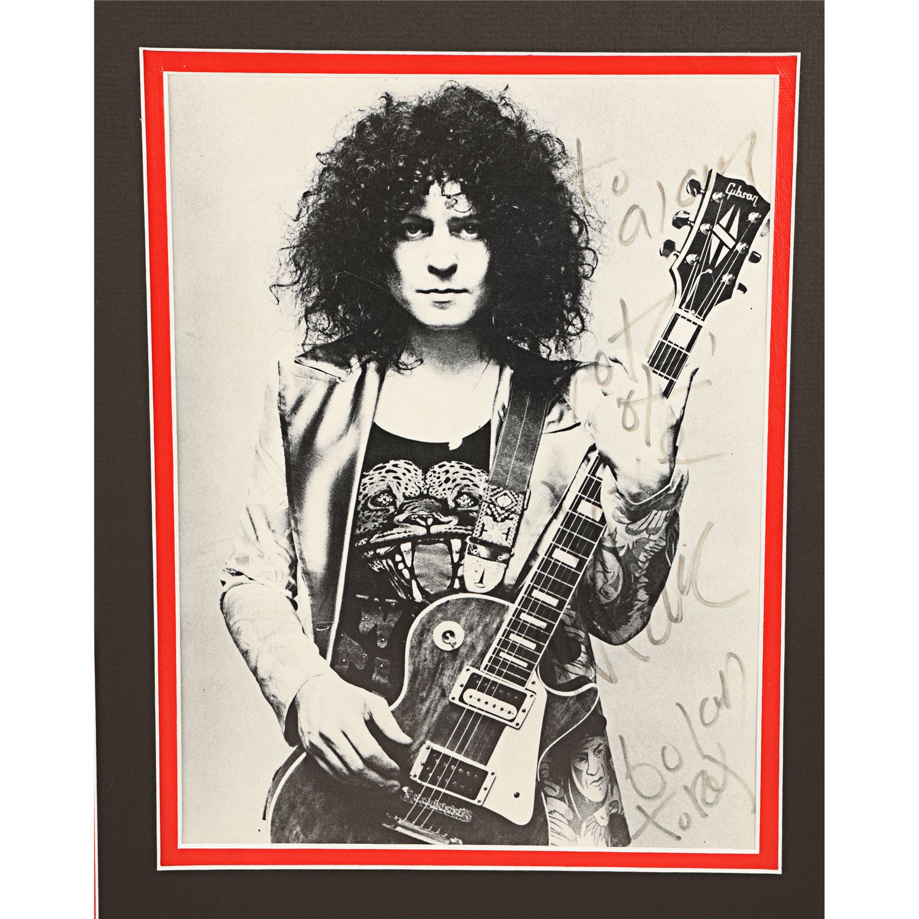 "The Slider" album cover and an autographed photo of T. Rex frontman Marc Bolan. "The Slider" was the band's seventh studio album and was released in 1972. It featured two U.K. No. 1 singles - "Metal Guru" and "Telegram Sam" - and the cover art is credited to Ringo Starr. It is mounted in a card display alongside a photo of Bolan, guitar in hand, which has been autographed in black ink. Dimensions (display): 41.5 cm x 61.5 cm (16" x 23 3/4")