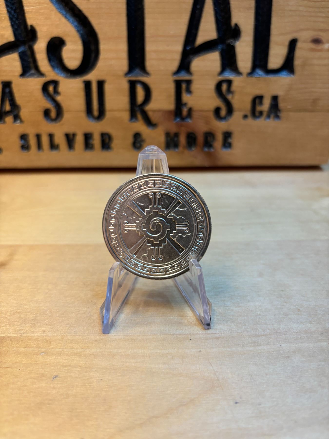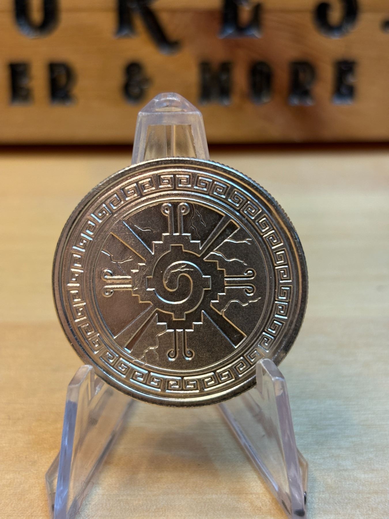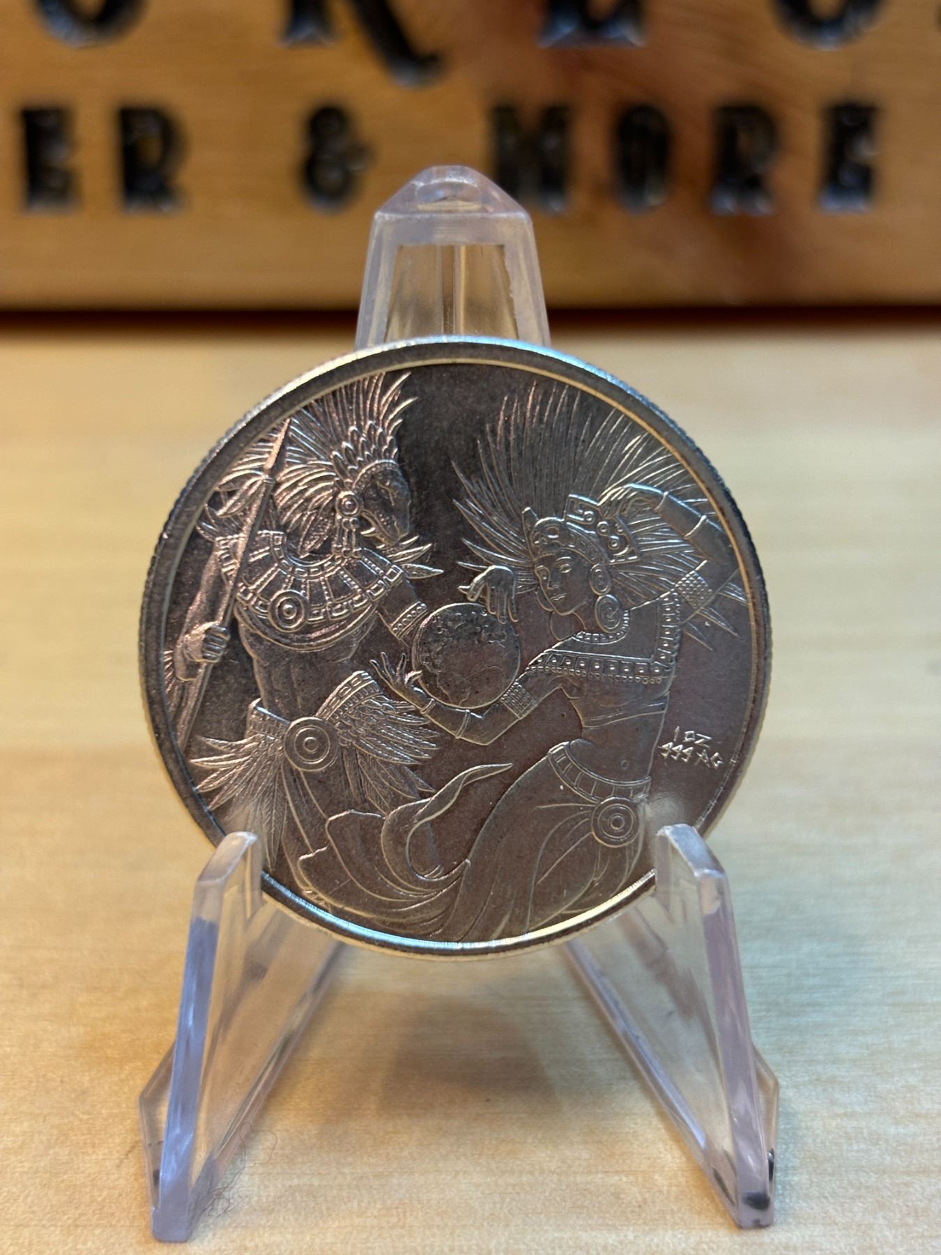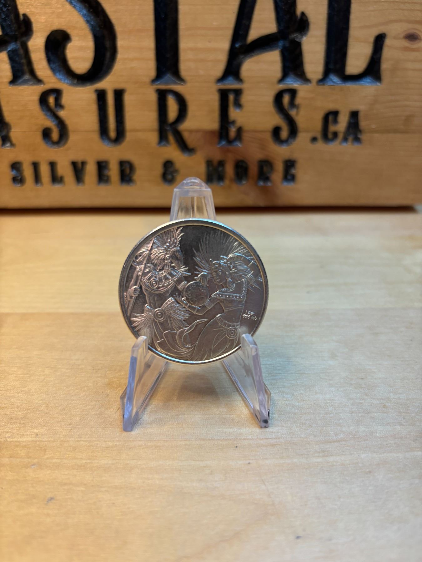 The 1 oz Aztec Yin/Yang Coin is a silver coin that typically features a combination of Aztec imagery and the Yin/Yang symbol, blending elements of Aztec culture with Chinese philosophy. The coin contains 1 ounce of .999 fine silver and often depicts an intricate design that merges the Aztec symbols, such as the Sun Stone or gods, with the Yin/Yang symbol, representing balance and duality. This coin is popular among collectors who appreciate both cultural themes and the aesthetic of the coin's design, along with its silver content.