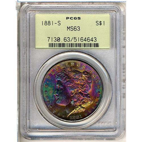 1881-S Morgan Dollar. Any other toned 1881-S might get a nod of approval, but this specimen has exciting explosive colors whose brilliance and iridescence transcends just about anything you will see. (#7130)