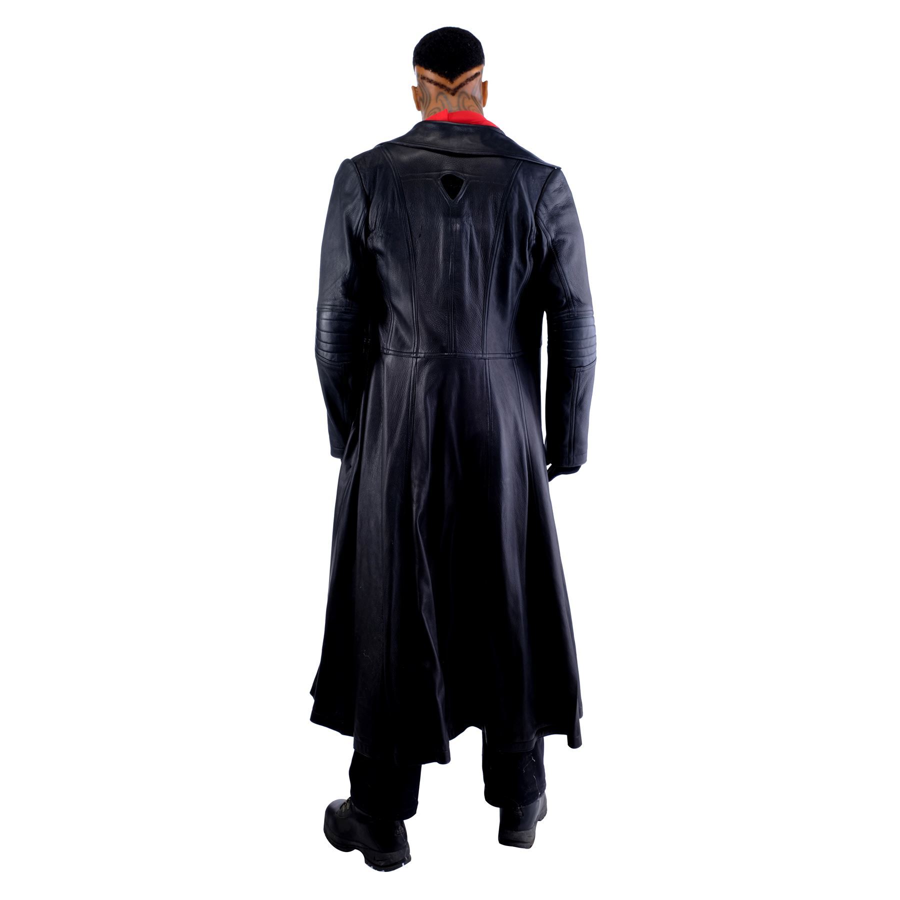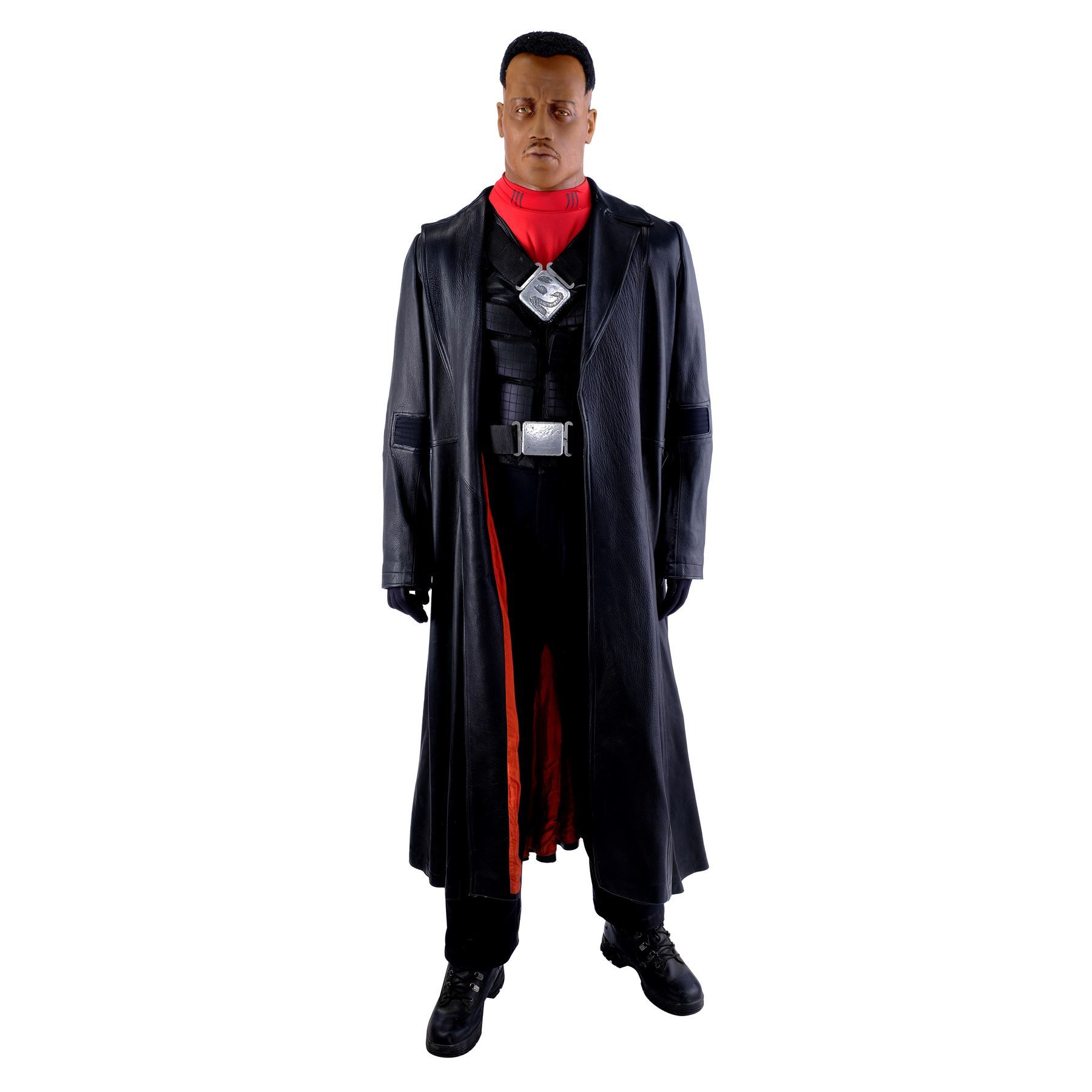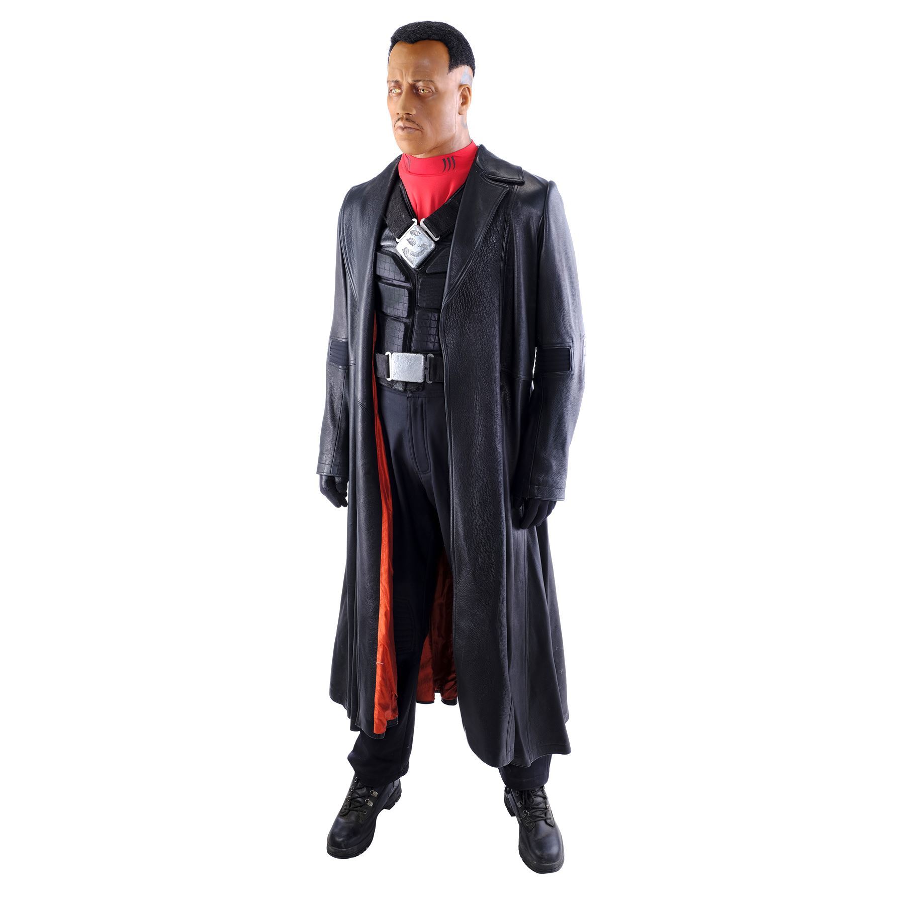 This costume consists of a dark red, long-sleeve bodysuit; a black zippered leatherette and nylon vest with padded armor blocks and metal buckles; black suede and neoprene gloves; black trousers marked "WES" in the interior; a black imitation leather duster lined with red satin, and boots This costume comes dressed on a custom mannequin affixed with a silicone Blade mannequin head. This display exhibits some discoloration and scratching on the leather jacket. Dimensions: 74.5" x 26" x 14"(189.25 cm x 66.25 cm x 35.75 cm)