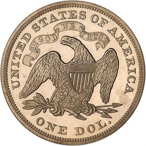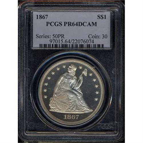 1867 Liberty Seated Dollar. Mintage decline by 100 pieces in 1867 over 1866, when a mere 625 Proof sets were sold. Powerfully burning mirror reflection explodes like a storm on the satiny frost, largely brilliant surfaces of this near-gem deep cameo dollar. A flicker of light gold highlights the uppermost surface of the obverse, with comparable splashes reverse. Especially bold strike, of course, since Proofs that year tend to be carefully made from razor-sharp dies. (#97015)<p><i>The O'Brien Proof Seated Dollar Collection</i>