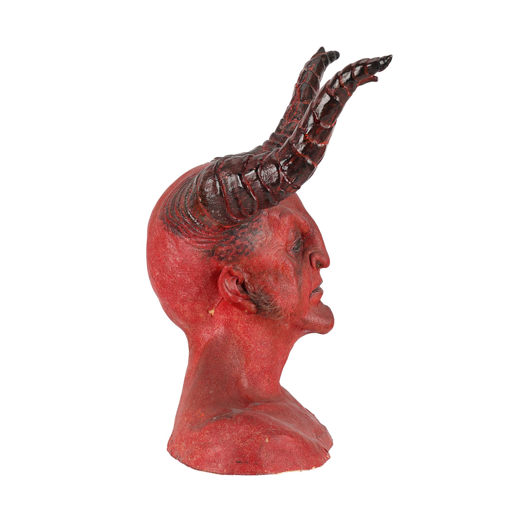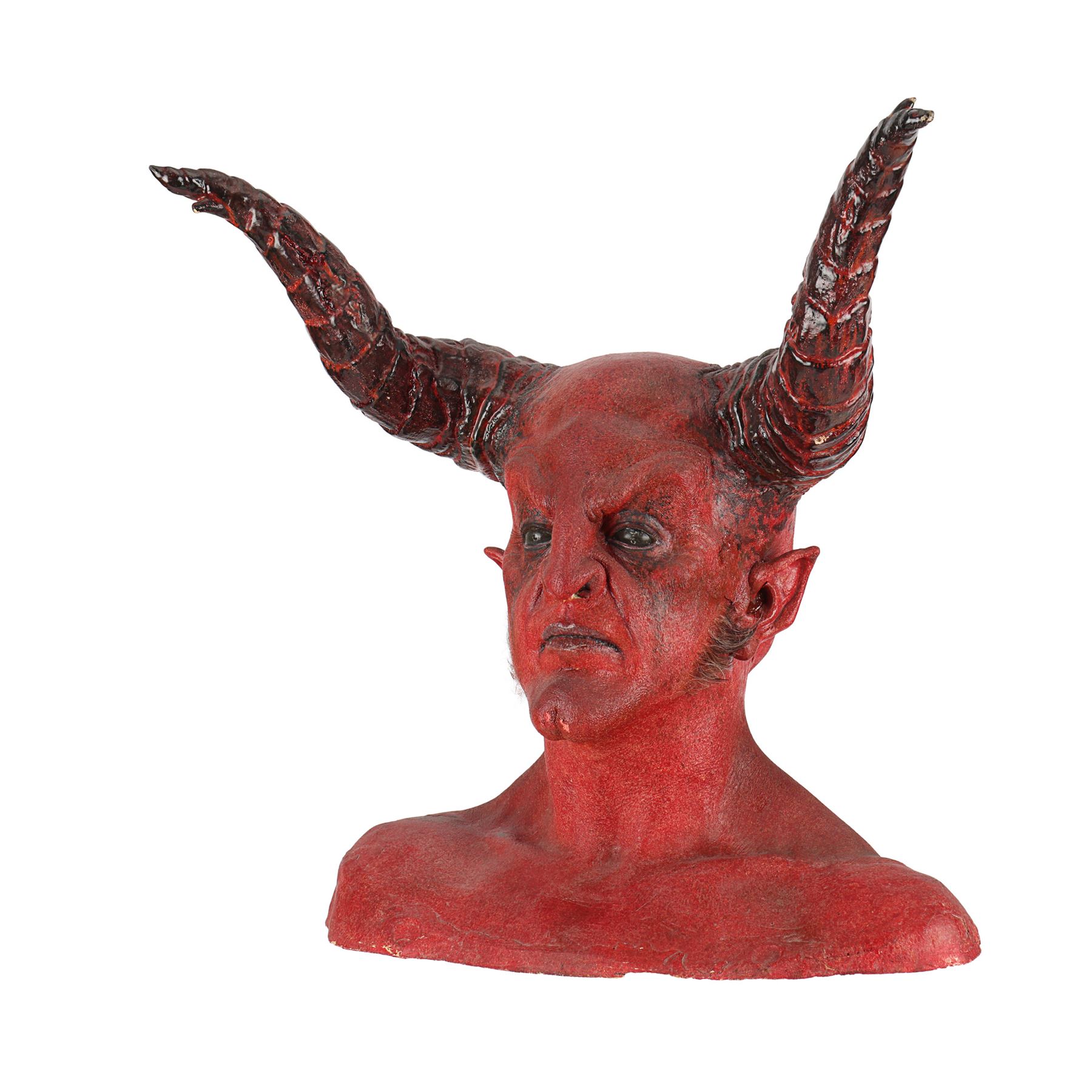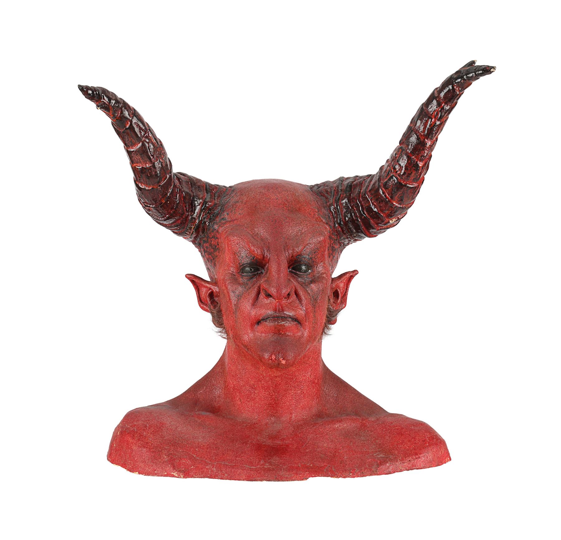 The lot comprises a red-and-black-painted biscuit-foam bust with incorporated foam-latex prosthetics applied on the face, neck and ears with two large resin horns affixed and faux hair sideburns. There is minor damage to the foam latex in places and signs of sympathetic restoration on one horn and ear. The left ear is loose and should be handled with care. Dimensions: 26 cm x 52.5 cm x 55 cm (10 1/4" x 20 3/4" x 21 1/2")