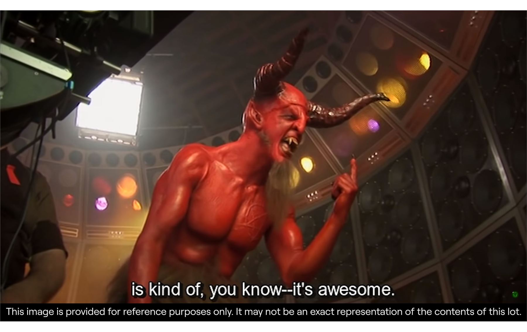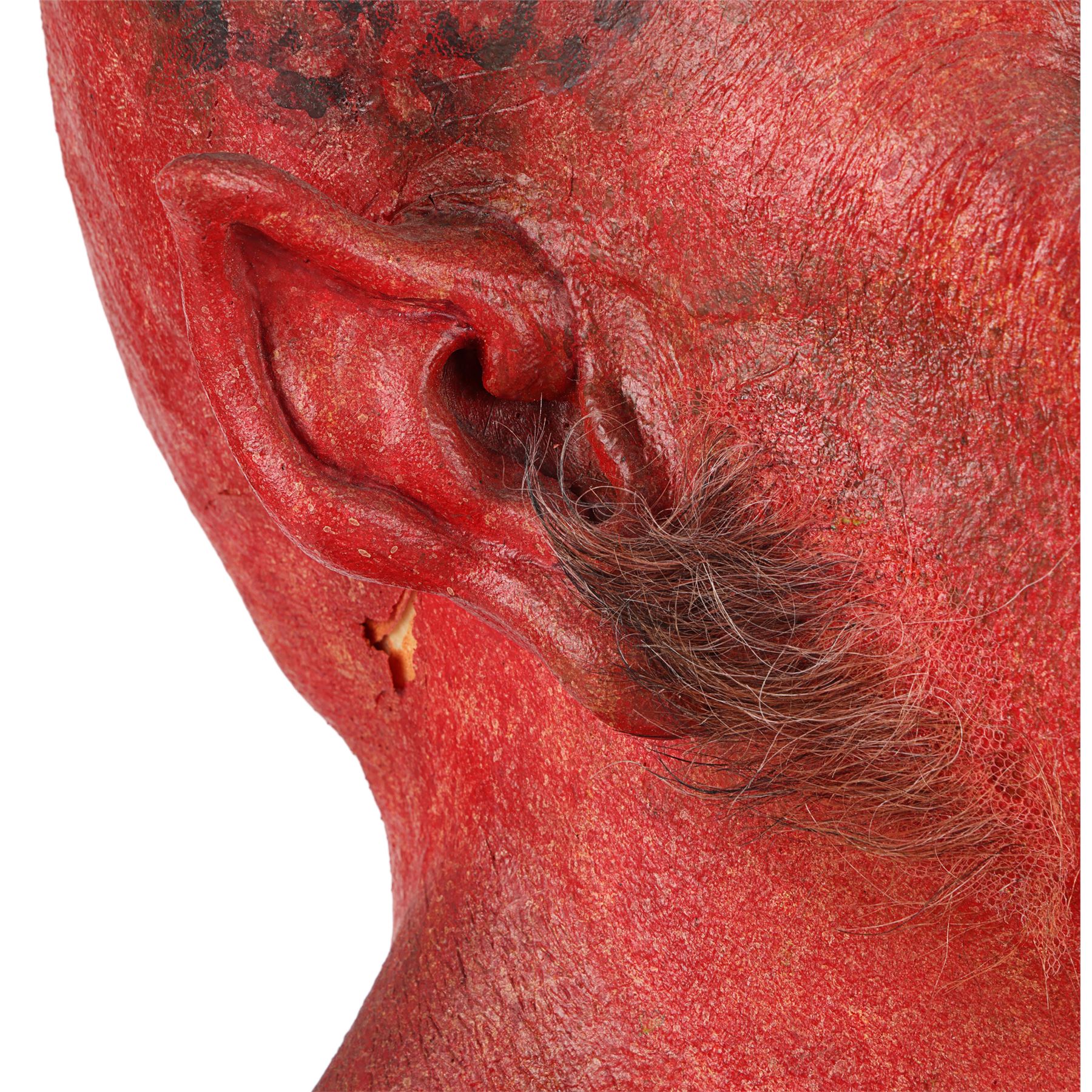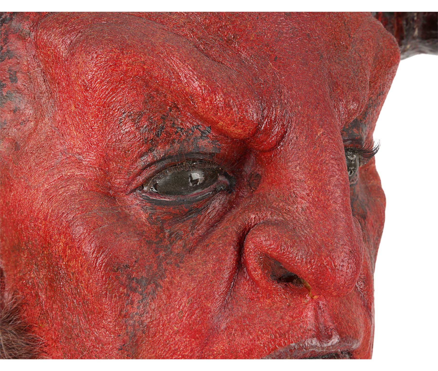 The lot comprises a red-and-black-painted biscuit-foam bust with incorporated foam-latex prosthetics applied on the face, neck and ears with two large resin horns affixed and faux hair sideburns. There is minor damage to the foam latex in places and signs of sympathetic restoration on one horn and ear. The left ear is loose and should be handled with care. Dimensions: 26 cm x 52.5 cm x 55 cm (10 1/4" x 20 3/4" x 21 1/2")