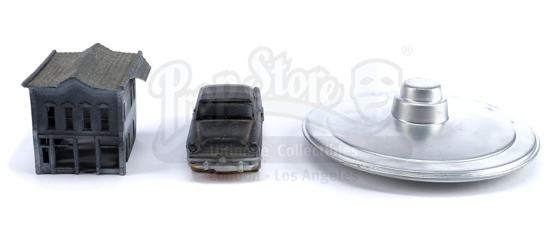 This lot will be auctioned on Wednesday, June 30th. The auction will begin at 9:00am PDT and lots are sold sequentially via live auctioneer; tune in to the live streaming broadcast on auction day to follow the pace. Note other lots in the auction may close on June 29th or July 1st. Model miniatures from Tim Burton's biopic Ed Wood. In homage to Wood's films, miniatures were used in the opening sequence to travel from a stormy night in a graveyard to the swampy lair of a giant octopus to flying saucers in outer space and finally to 1950s Hollywood. This set consists of three hand-painted resin model miniatures: a small house, a 1950s car, and a flying saucer. All are in good overall condition with minor scuffs and scratches. Dimensions (largest): 6" x 6" x 2" (15 cm x 15 cm x 5 cm); (smallest): 3" x 2.5" x 3" (7.5 cm x 6 cm x 7.5 cm) Estimate: $1,500 - 2,500