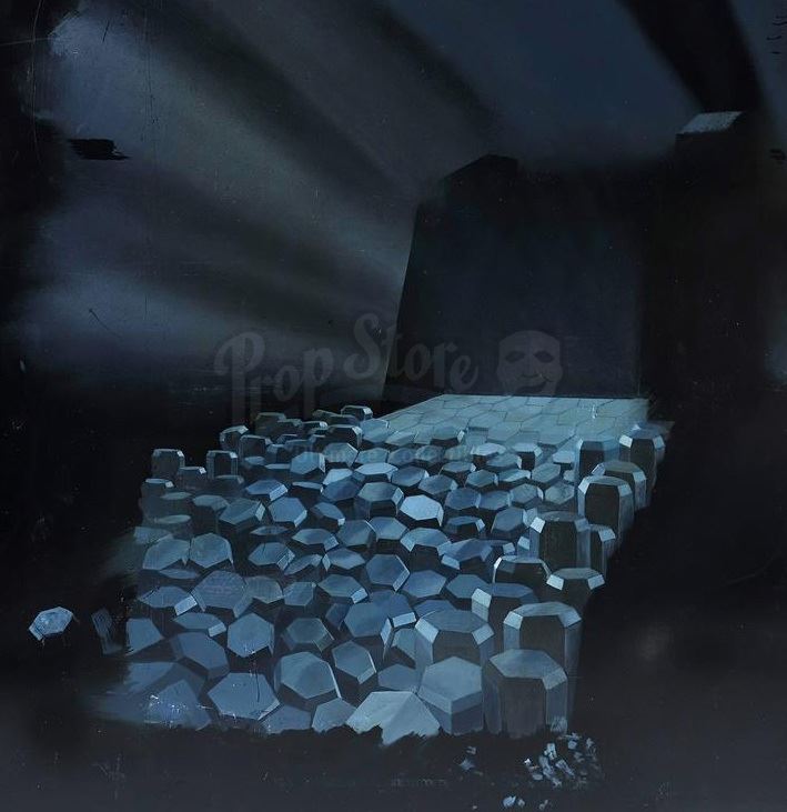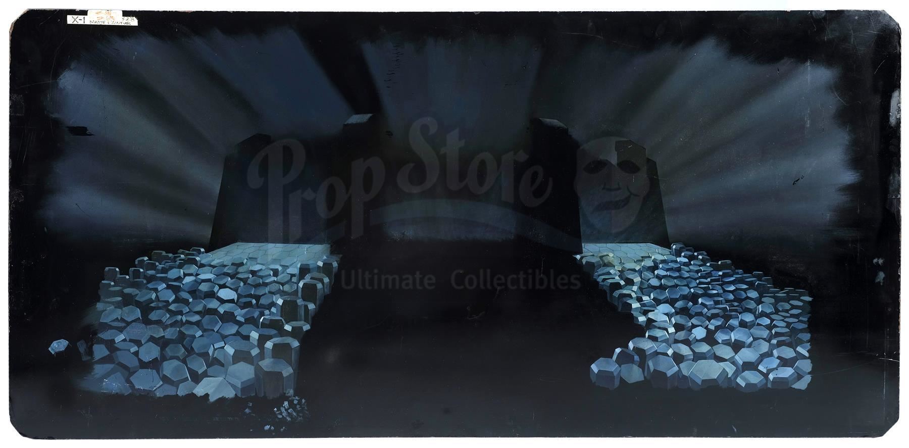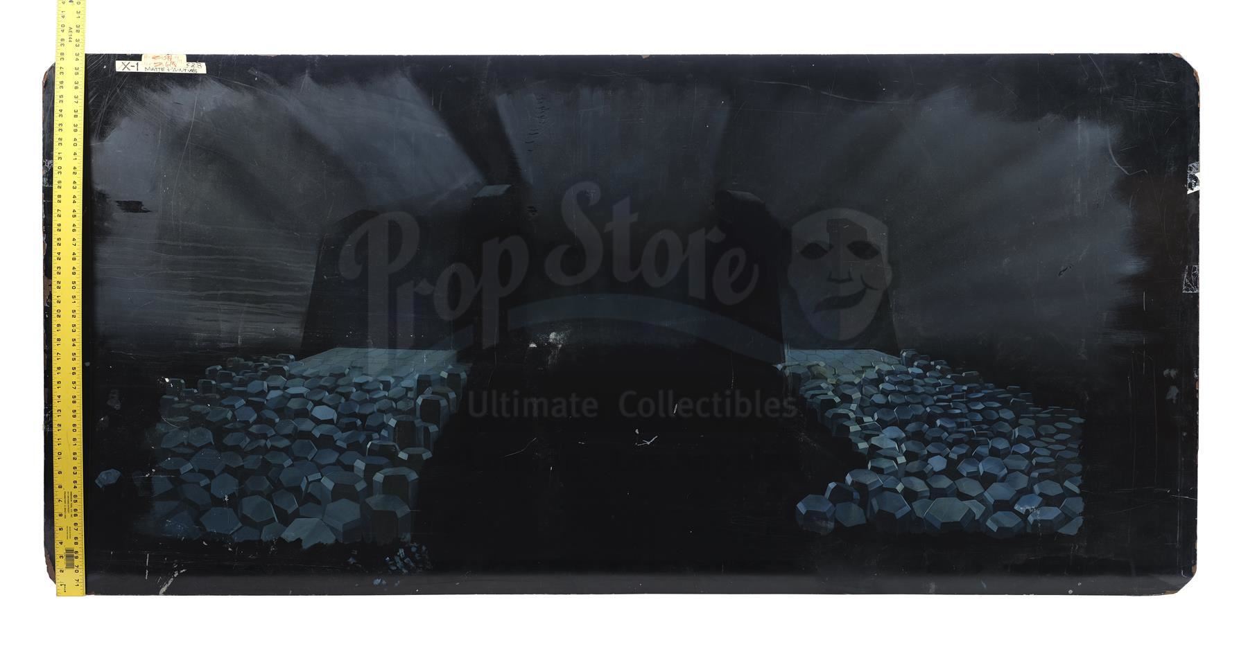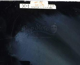 This hand-painted matte painting was created for the long walk undertaken by Admiral Kirk (William Shatner) and his crew on a pathway inside the V'ger vessel. The painting is rendered in mixed media on masonite and labeled "X-1 Matte Painting" on tape by matte artist Rocco Gioffre. The masonite exhibits some signs of handling and wear, but it remains in good overall condition. Dimensions: 86" x 43 1/2" x 2" (218.5 cm x 110.5 cm x 5 cm)