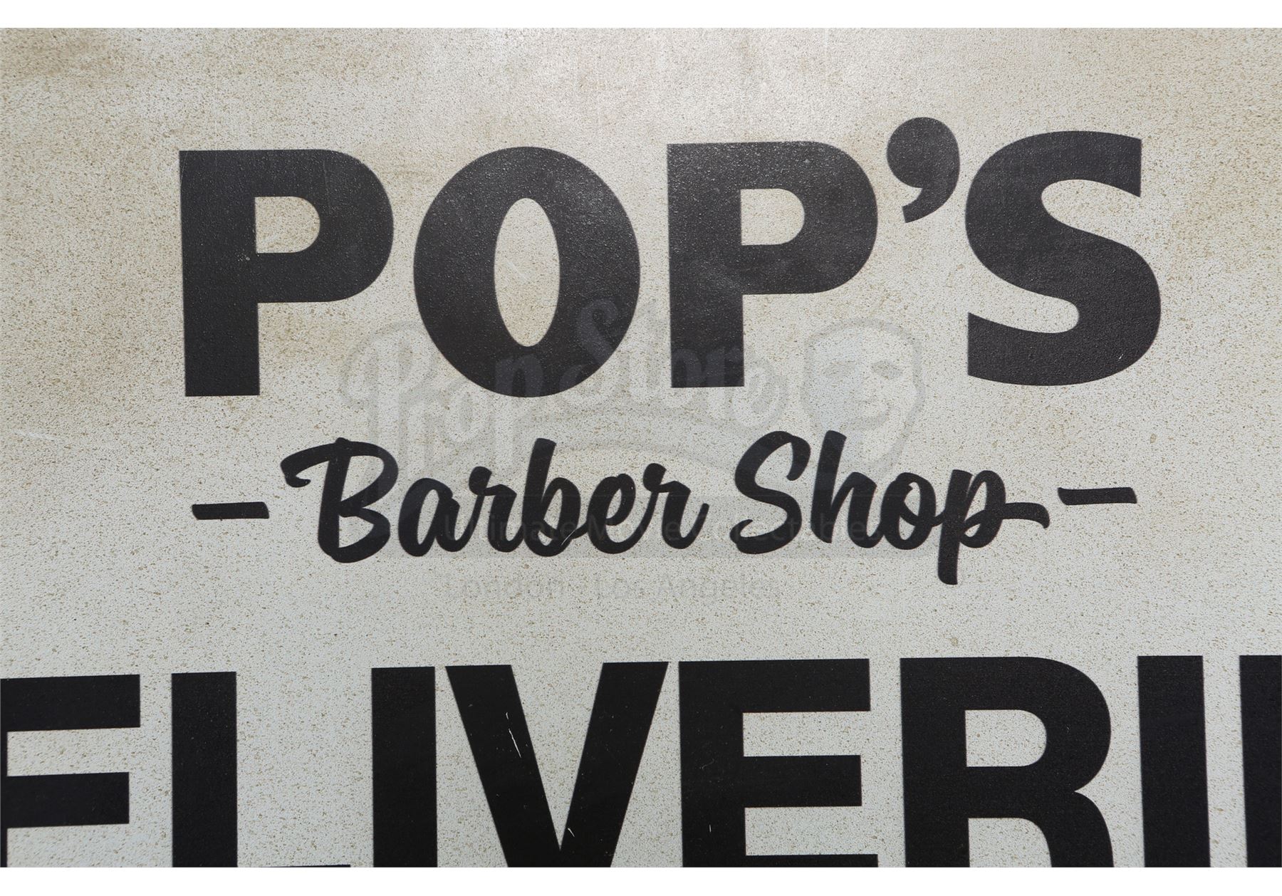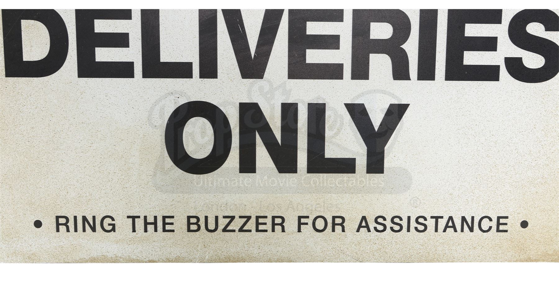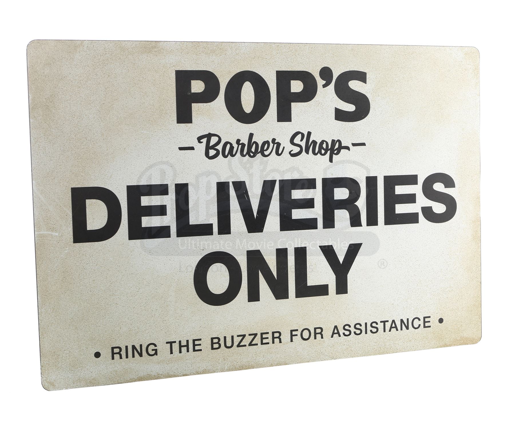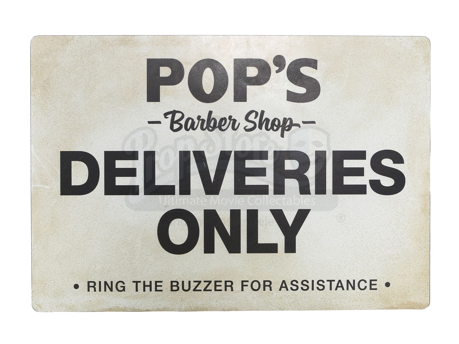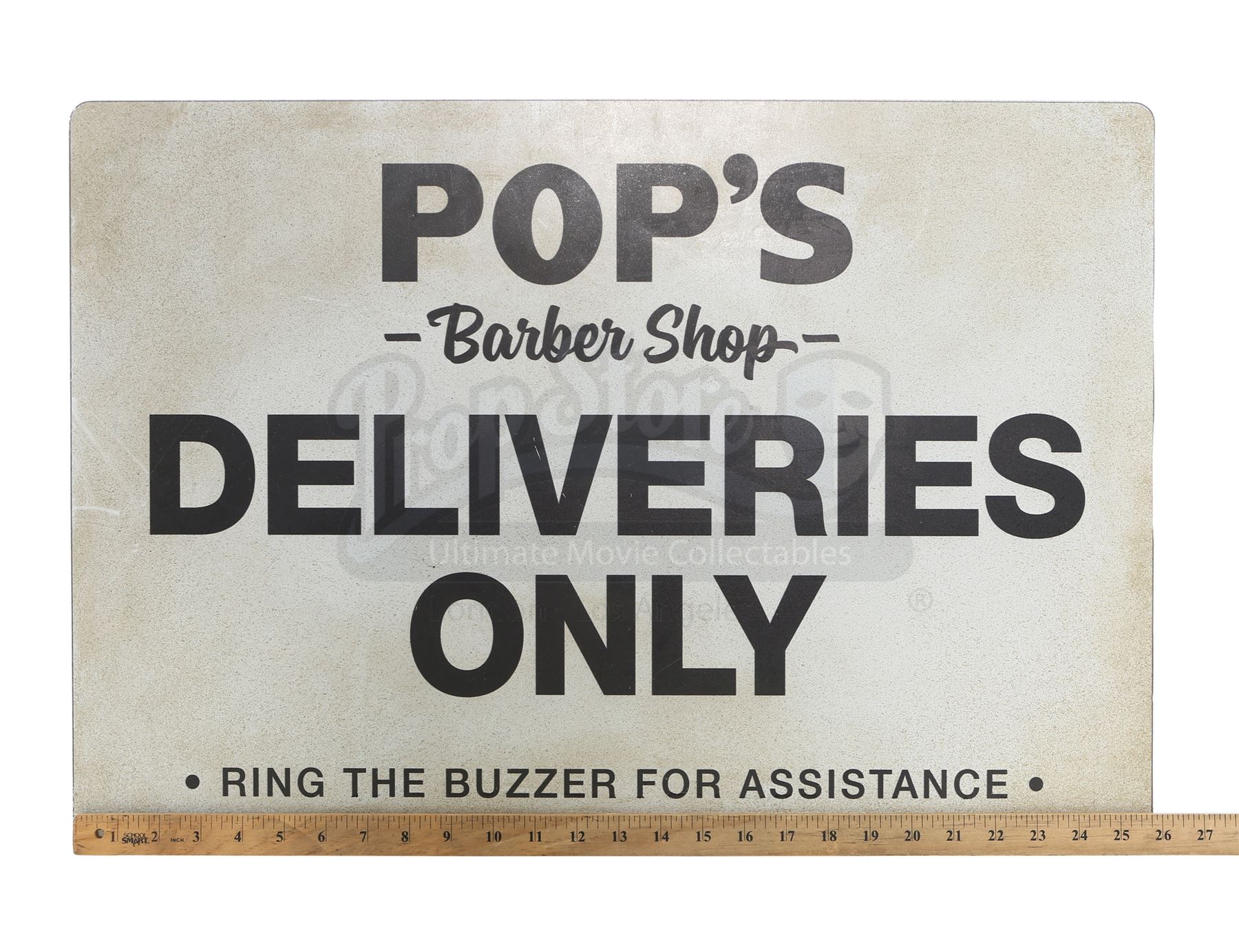 Pop’s ‘Deliveries Only’ sign from the episode ‘The Basement’ (206) of Marvel’s Luke Cage. In the episode, D.W. Griffith calls Luke Cage and warns him about two men sneaking in through the backdoor of Pop’s Barber Shop, where the ‘Deliveries Only’ sign hangs. The sign is made of metal, and features a gray front with faux weathering and large black lettering. This lot is in good overall condition, with some minor wear from production.
