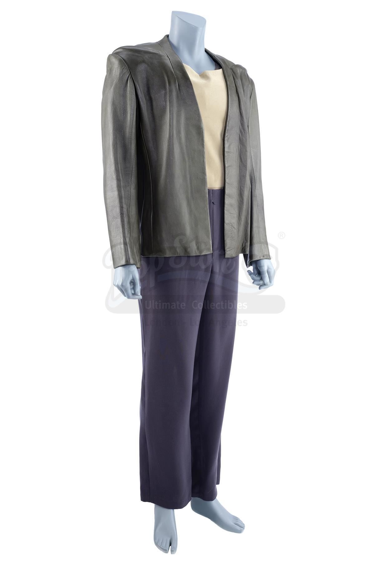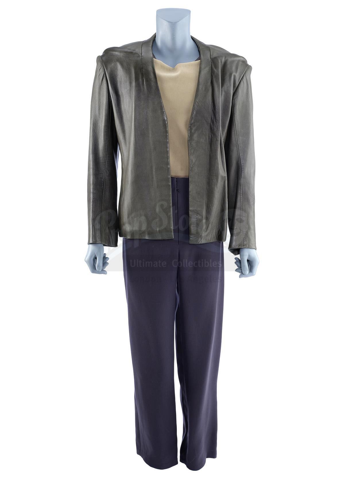 This costume consists of a padded undershirt, two T-shirts, a pair of pants, and a leather jacket. The undershirt is a gray cotton T-shirt with a starred label reading "Patrick" and shaped padding in the shoulders and pecs to enhance the wearer's overall muscular appearance. The two identical velvet T-shirts feature two shades of green material and elastic understraps with metal snaps for keeping the shirts tucked in; one shirt has a Bill Hargate Costumes tag labeled "Hero #1" and the other shirt has no tag. The pants are a dark gray blend of manmade fibers with a zipper fly, and include a production tag reading "Use for Sc-1 35 Yacht-Bay Only-." The dark green leather jacket has a low collar, open front, and a Bill Hargate Costumes tag sewn inside.