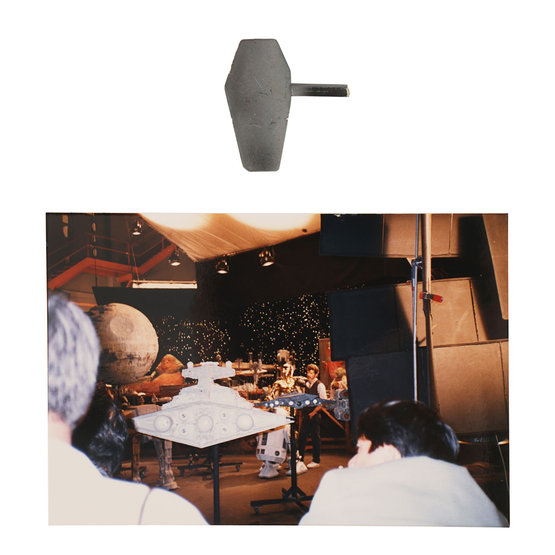 A piece of the Death Star and a behind-the-scenes photograph from Richard Marquand's Star Wars: Return of the Jedi.