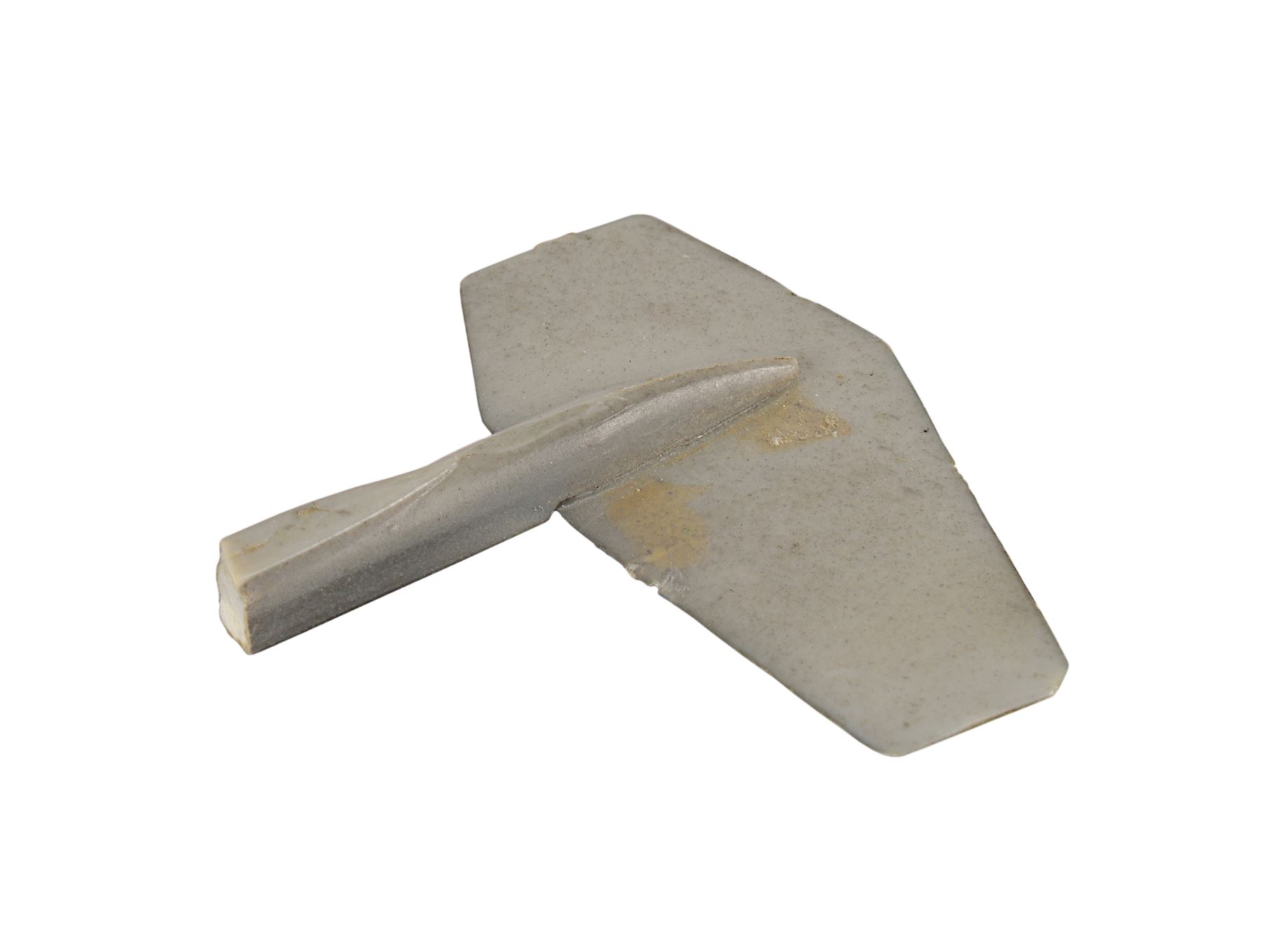 This resin piece broke away from the model miniature of the Death Star during a photoshoot in the Lucasfilm archives with George Lucas and Anthony Daniels, who was in costume as C-3PO. The behind-the-scenes photograph depicts this photoshoot and features both Lucas and Daniels. Dimensions (Death Star piece): 3.5 cm x 3.5 cm x 0.5 cm (1 1/4" x 1 1/4" x 1/4")