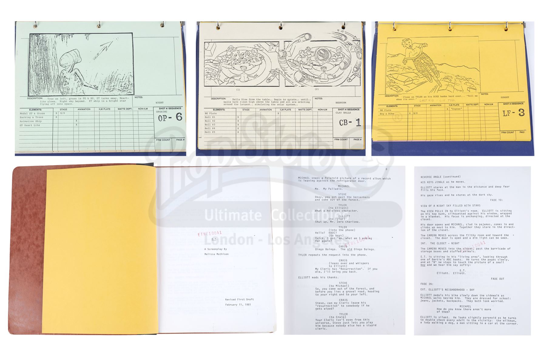 This lot will be auctioned on Tuesday, June 29th. The auction will begin at 9:00am PDT and lots are sold sequentially via live auctioneer; tune in to the live streaming broadcast on auction day to follow the pace. Note other lots in the auction may close on June 30th or July 1st. A set of Industrial Light & Magic (ILM) VFX storyboards and a screenplay from Steven Spielberg's sci-fi classic E.T. the Extra-Terrestrial. Young suburban boy Elliott (Henry Thomas) befriended an alien marooned on Earth during an exploratory mission. This lot consists of a blue binder marked "E.T. ILM STORYBOARDS NO.4" containing 35 printed storyboards for several VFX sequences, as well as a brown folder-bound, 122-page copy of the revised first draft of Melissa Mathison's screenplay. The screenplay is dated February 11, 1981 with each page labeled "ETME 10041." The lot exhibits signs of wear from age and use, but remains in excellent overall condition. Dimensions: 12" x 10" x 1.75" (30.5 cm x 25.5 cm x 4.5 cm) Estimate: $2,000 - 3,000