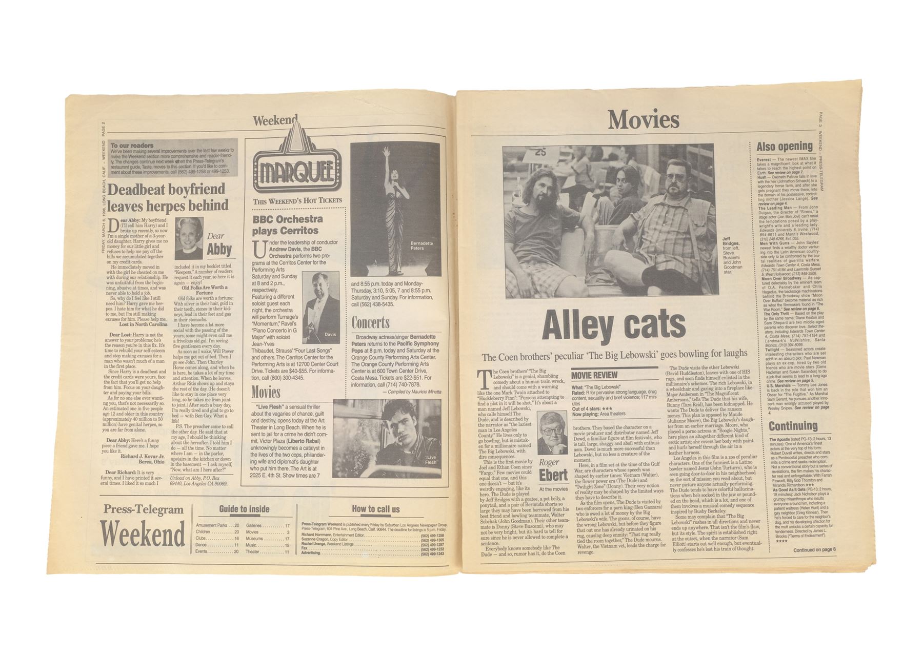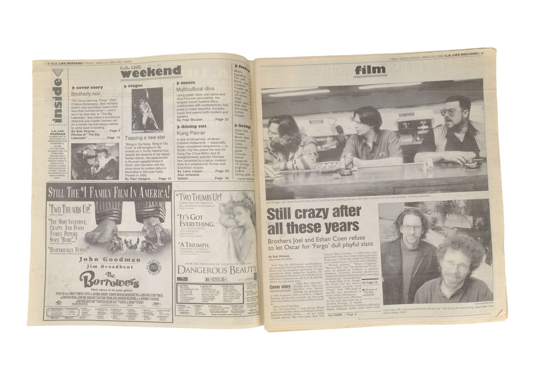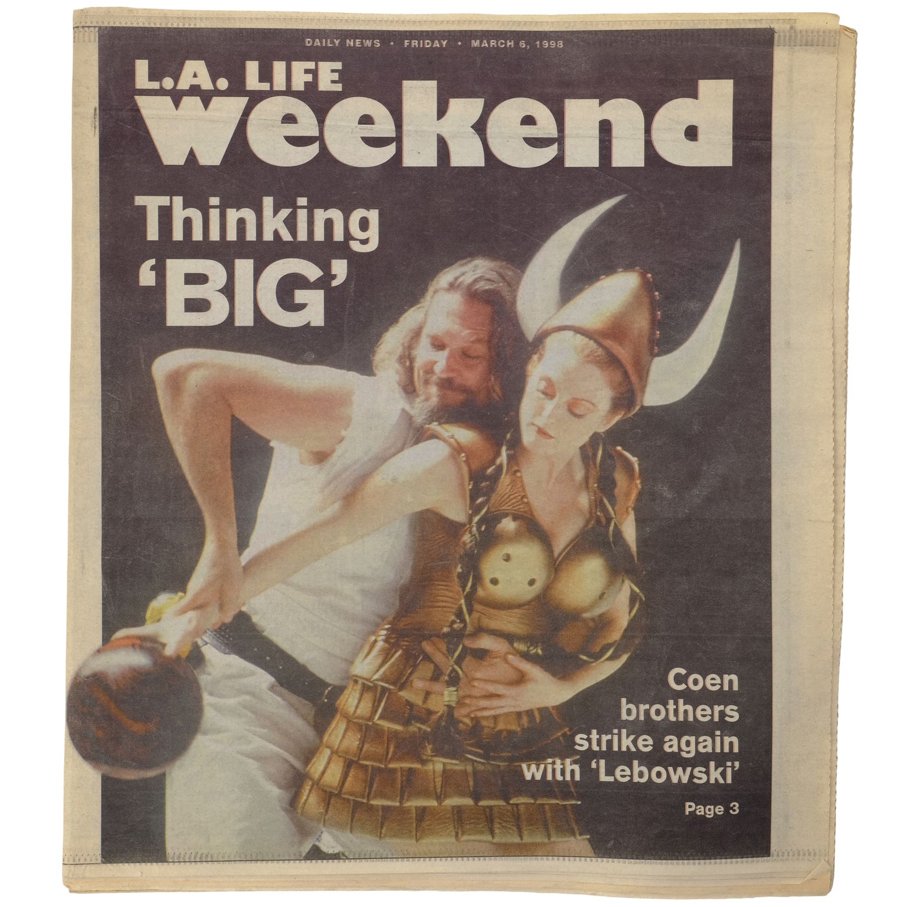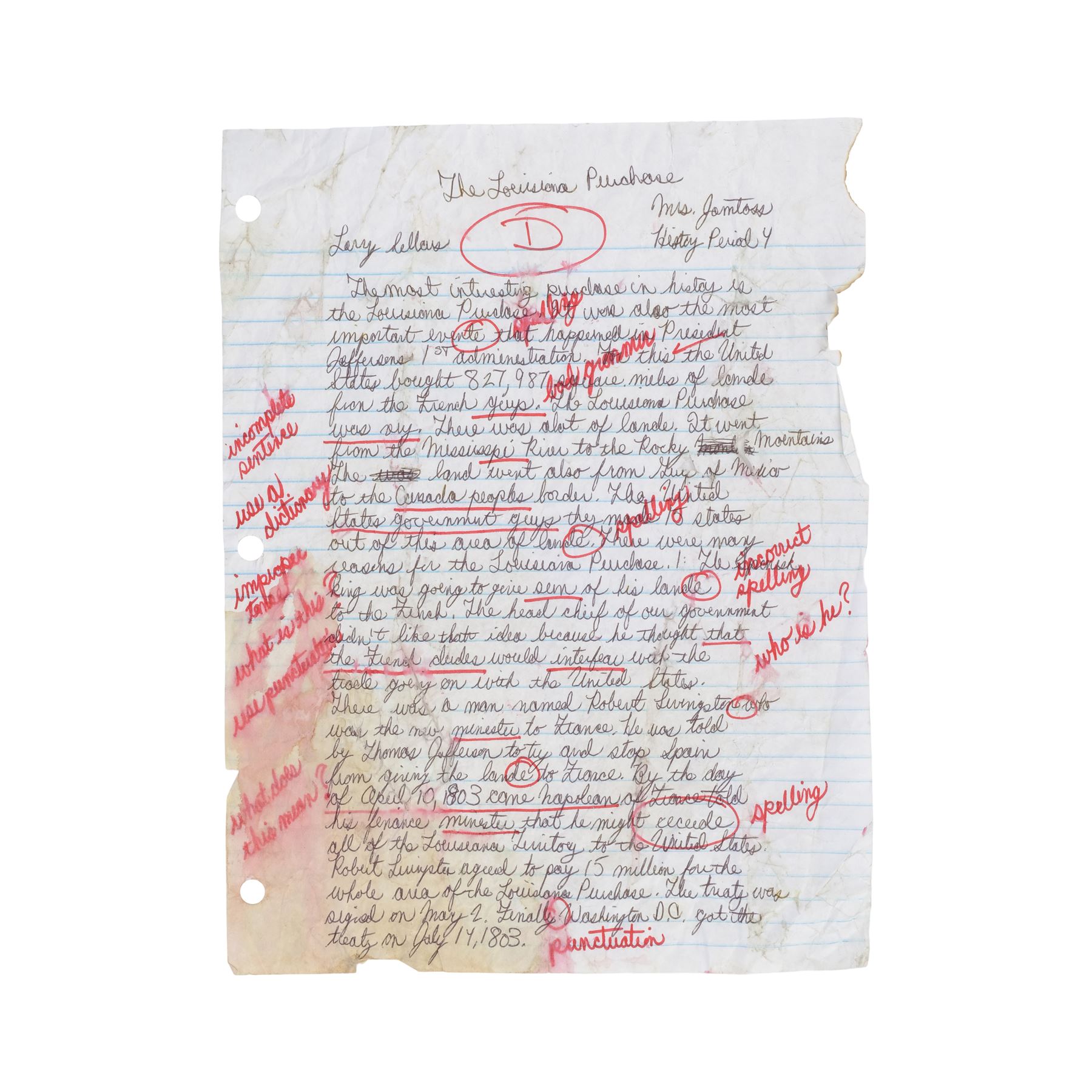 This lot consists of a leather-bound briefcase with metal locks and fabric-lined interior pockets; an essay titled "The Louisiana Purchase" and authored by "Larry Sellers" handwritten in black ink on hole-punched paper with corrections in red ink; and two L.A. Life Weekend newspapers from March 6, 1998 featuring stories about the film. The briefcase exhibits moulding, tape residue, and staining, and the homework exhibits intentional liquid staining and burnt edges. Dimensions: (largest) 45.75 cm x 35.75 cm x 10.25 cm (18" x 14" x 4")
