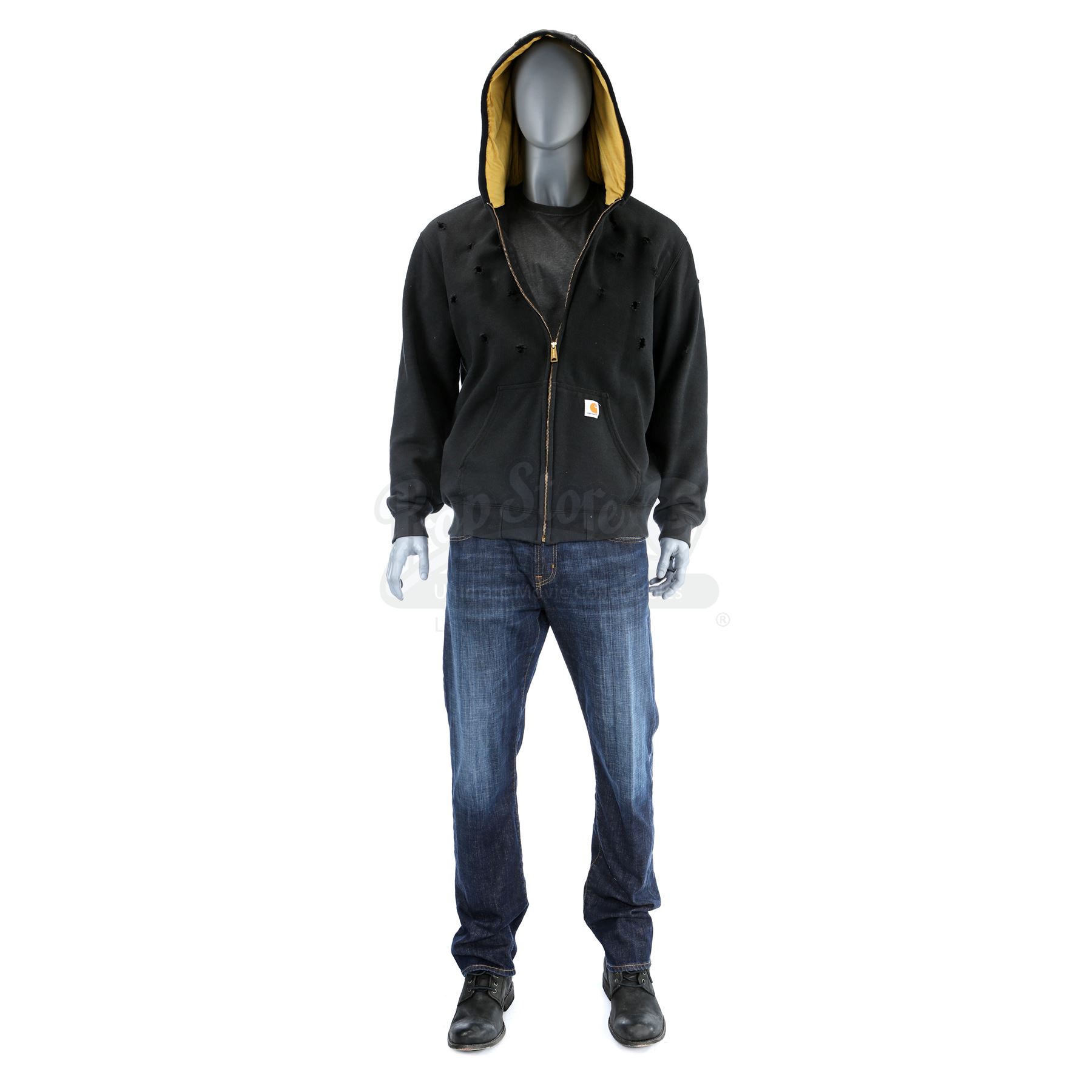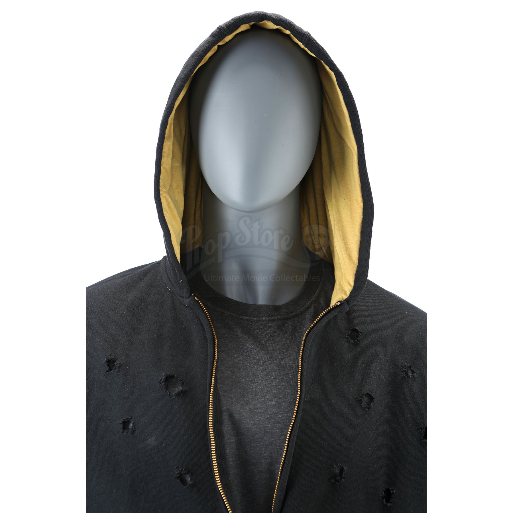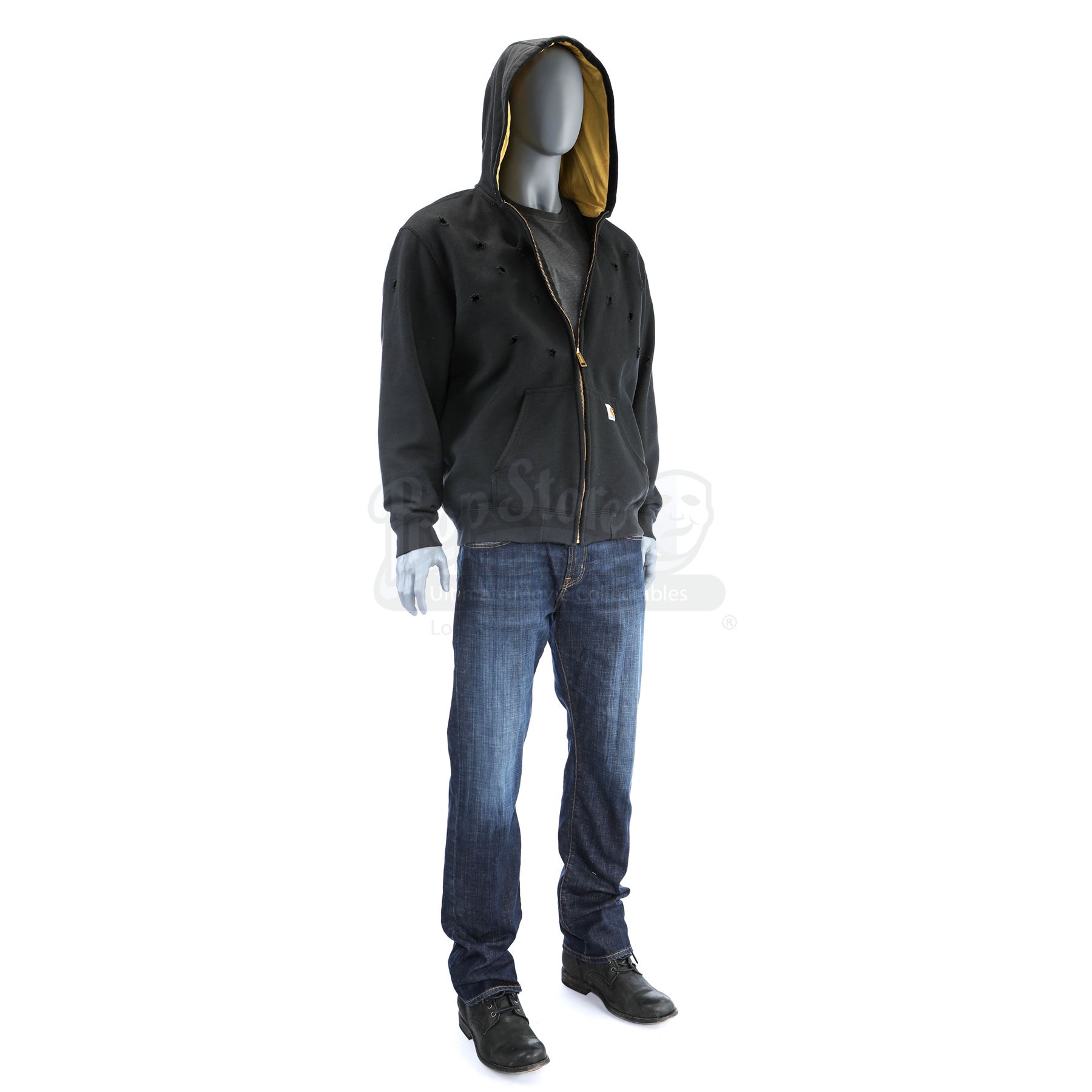 Luke Cage’s bullet-riddled costume from the episode ‘The Main Ingredient’ (210) of Marvel's Luke Cage. In the episode, Cage wears his costume while he and Danny Rand destroy a drug manufacturing warehouse. This lot consists of a charcoal and yellow cotton and polyester zip-up hooded sweatshirt with the number ‘210’ written on the interior label, a dark gray cotton and polyester T-shirt, a pair of black leather and rubber boots, and a pair of dark blue jeans. The lot is in good overall condition with minor signs of wear and extensive faux bullet holes in the sweatshirt, as well as some scuffing on the boots, from production.