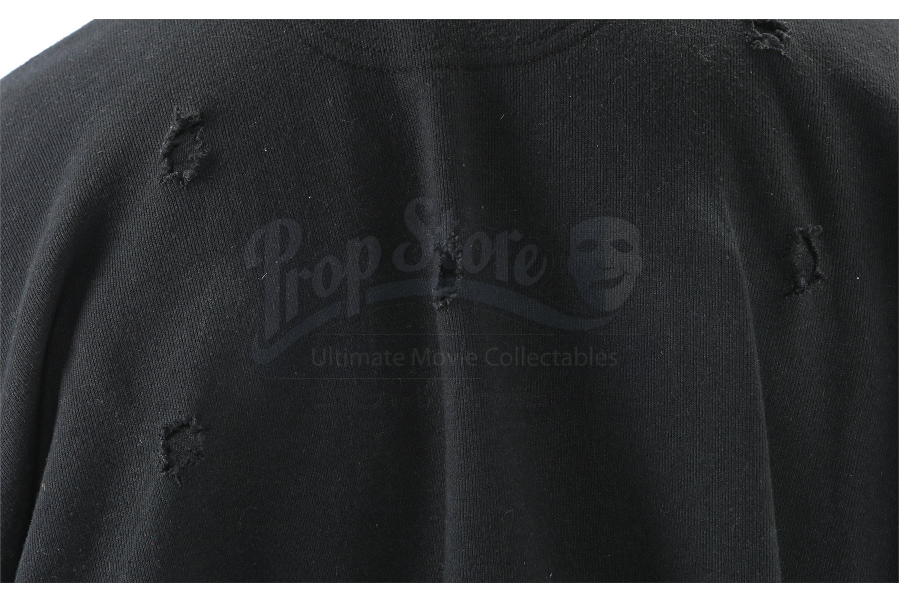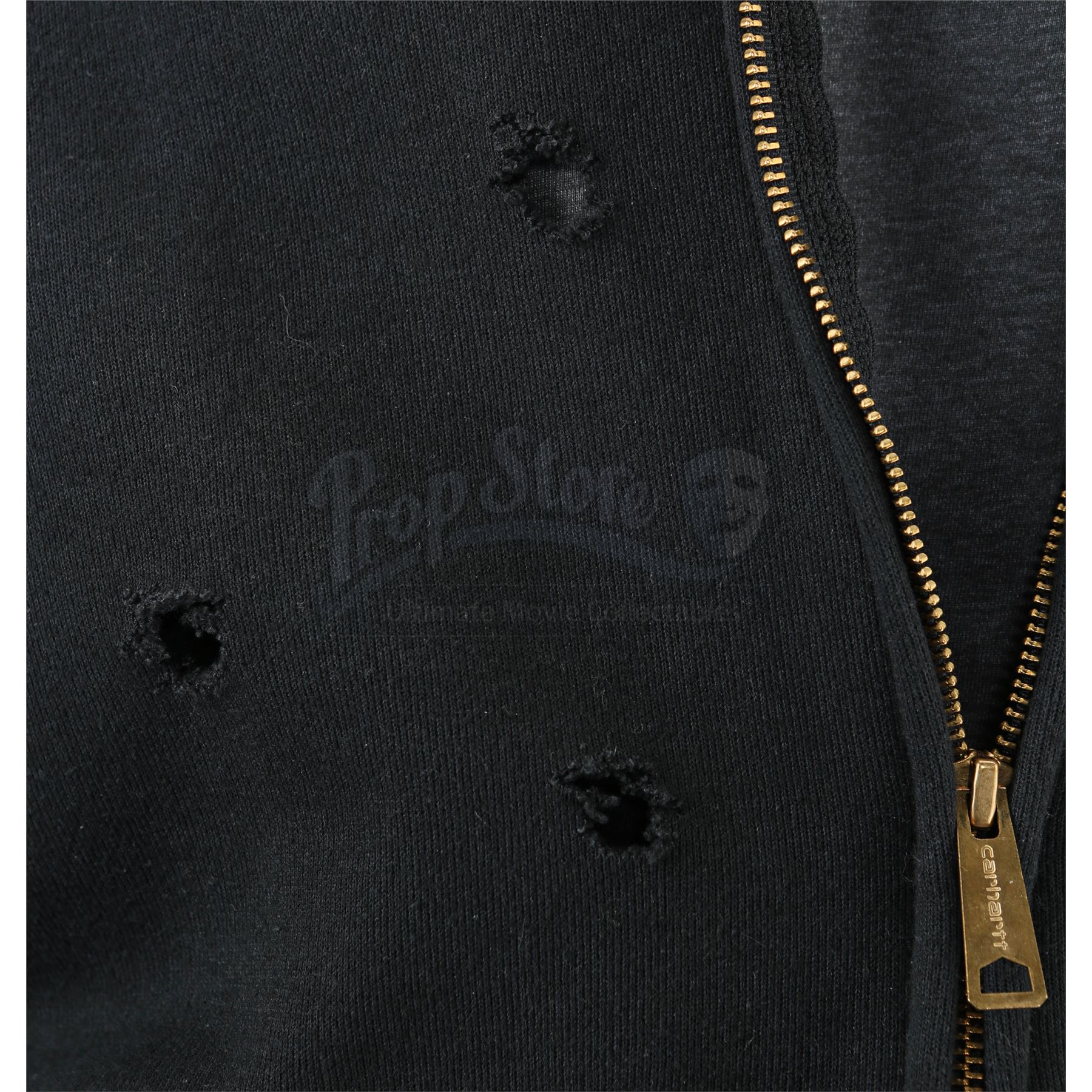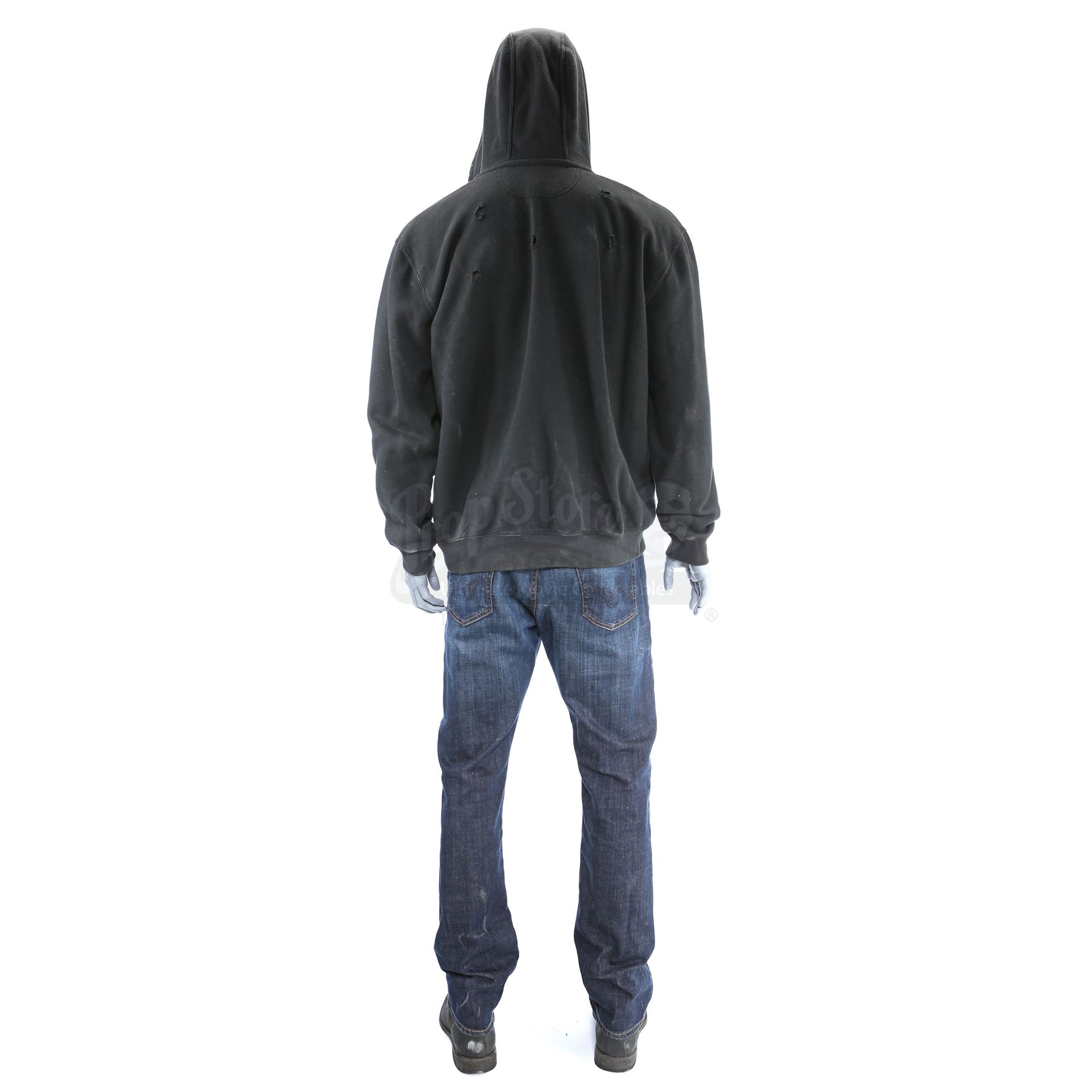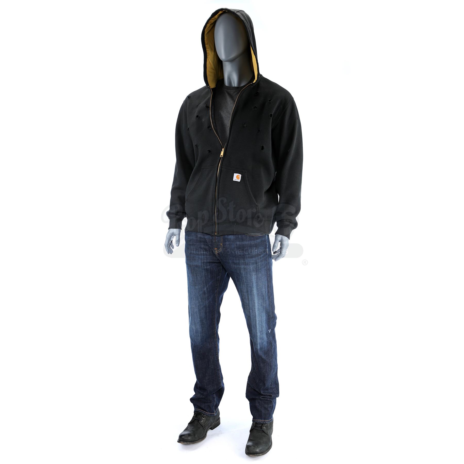 Luke Cage’s bullet-riddled costume from the episode ‘The Main Ingredient’ (210) of Marvel's Luke Cage. In the episode, Cage wears his costume while he and Danny Rand destroy a drug manufacturing warehouse. This lot consists of a charcoal and yellow cotton and polyester zip-up hooded sweatshirt with the number ‘210’ written on the interior label, a dark gray cotton and polyester T-shirt, a pair of black leather and rubber boots, and a pair of dark blue jeans. The lot is in good overall condition with minor signs of wear and extensive faux bullet holes in the sweatshirt, as well as some scuffing on the boots, from production.