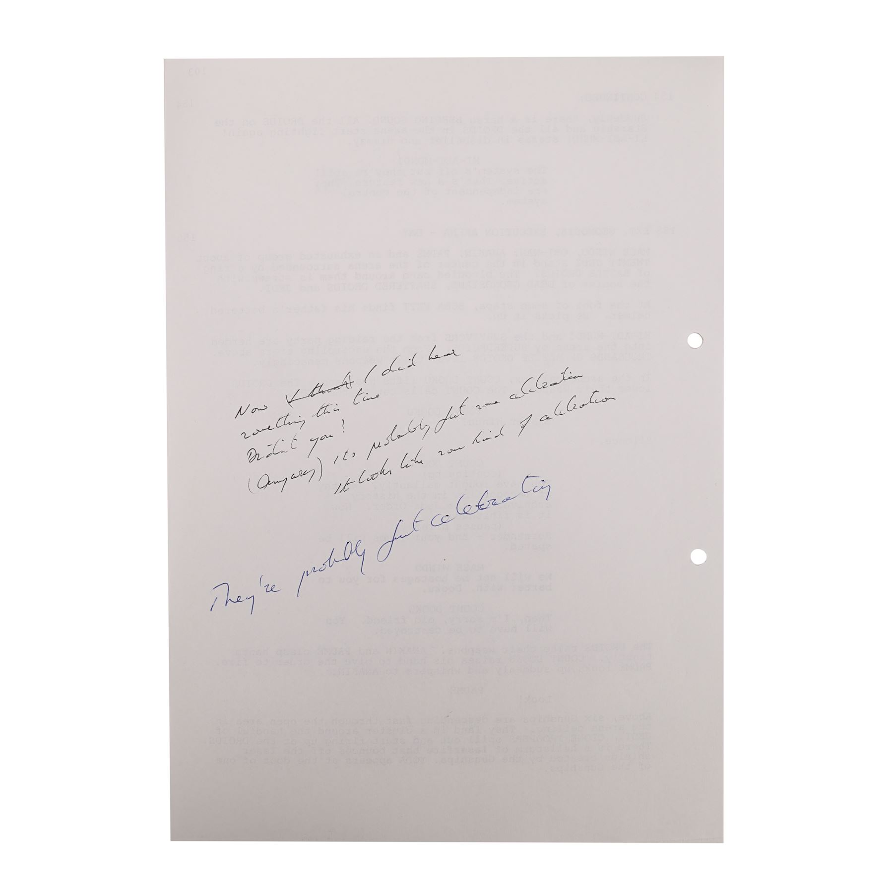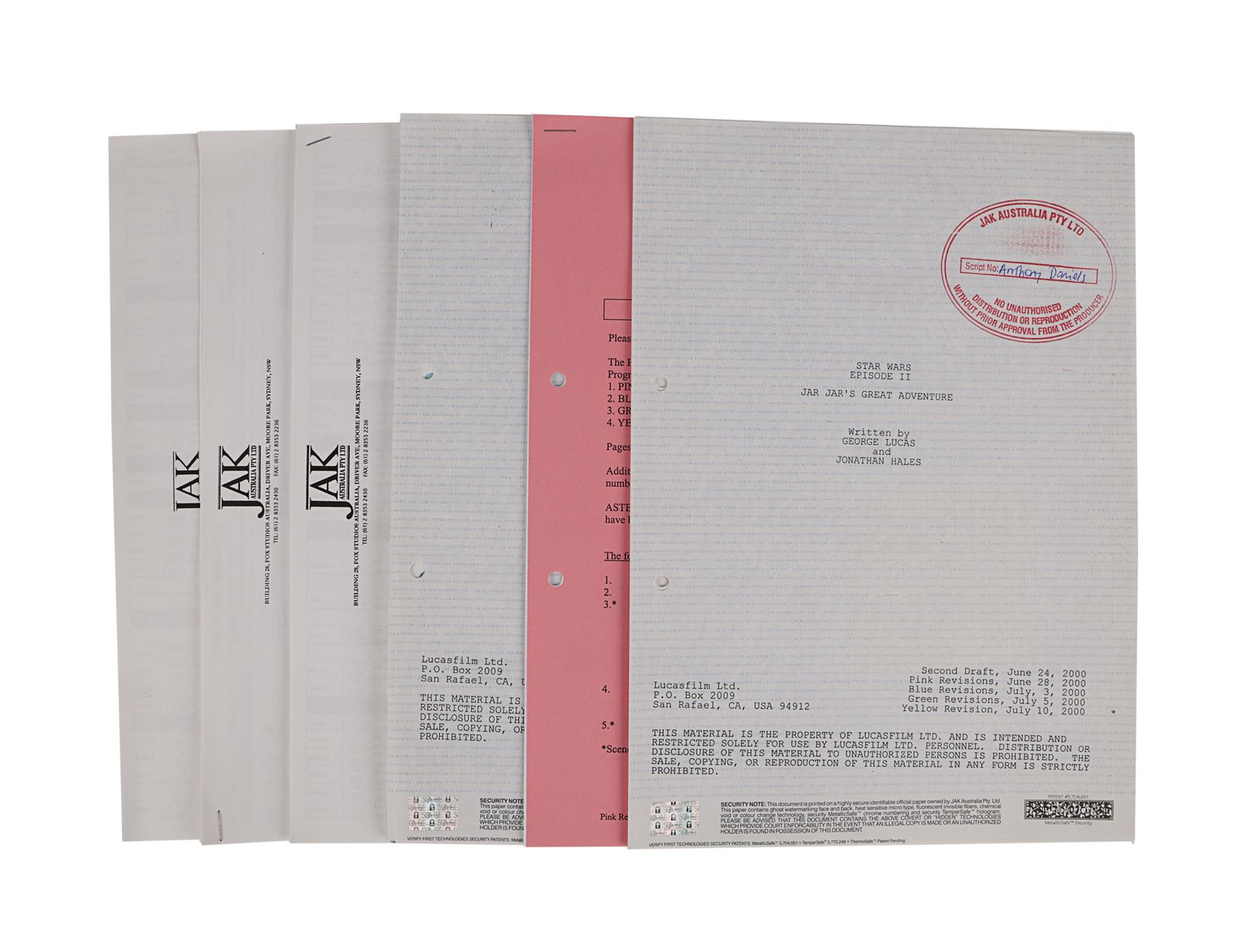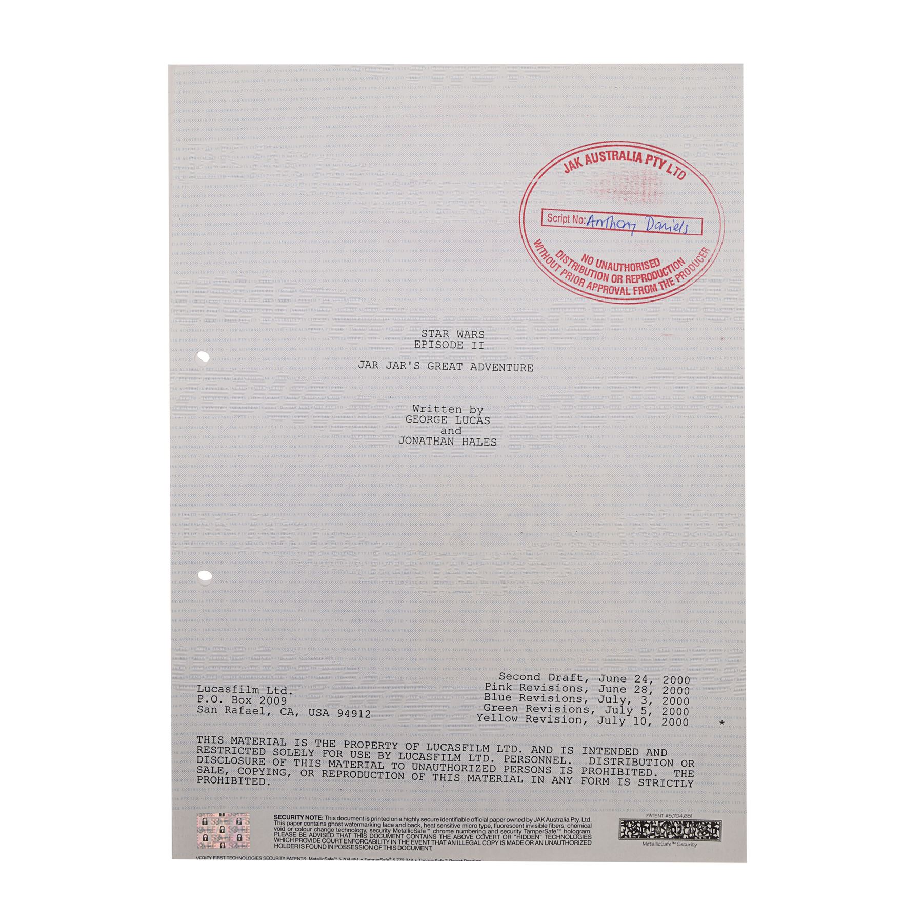 Anthony Daniels' revised script pages and shooting schedules from the production of George Lucas' Attack of the Clones. The lot contains 20 revised script pages, several of which have been hand-annotated by Daniels, including changes to his dialogue. Several title pages accompany the script pages and feature the film's working title "Jar Jar's Great Adventure". Also included in the lot are several shooting schedules. Dimensions: 31 cm x 21.5 cm x 1.5 cm (12 1/4" x 8 1/2" x 3/4")