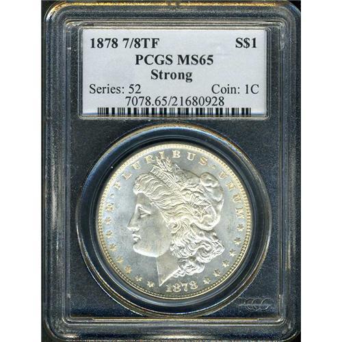 1878 Morgan Dollar. Strongly doubled tail feathers. This is the earlier named 7 over 8 tail feathers variety, now relegated to the history books. A nice radiant white tint tantalizes the eye from this lustrous piece, a coin whose mint glow goes round and round. Struck with mathematical precision by the dies, which is why it has earned the prized MS65 grade. (#7078)