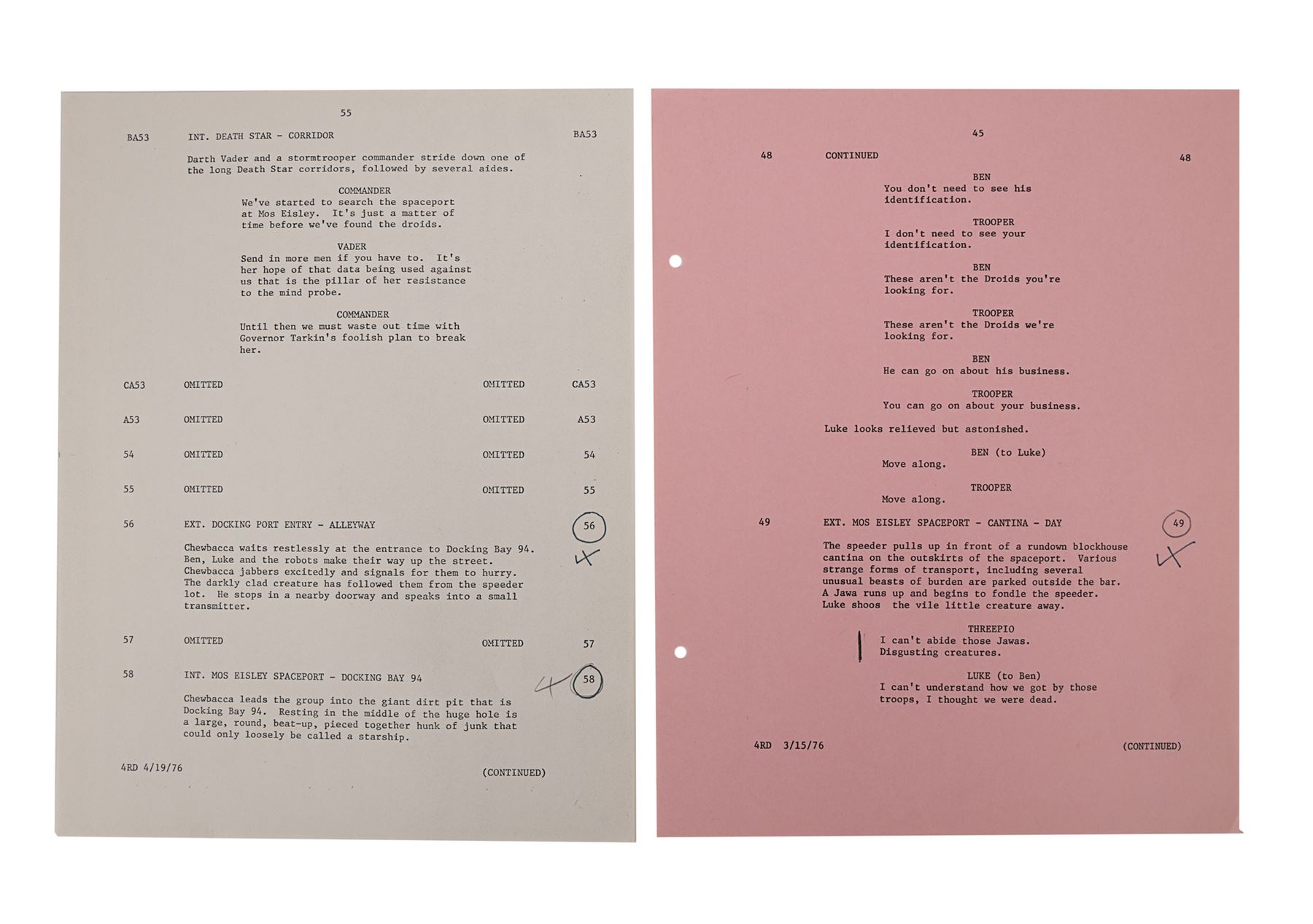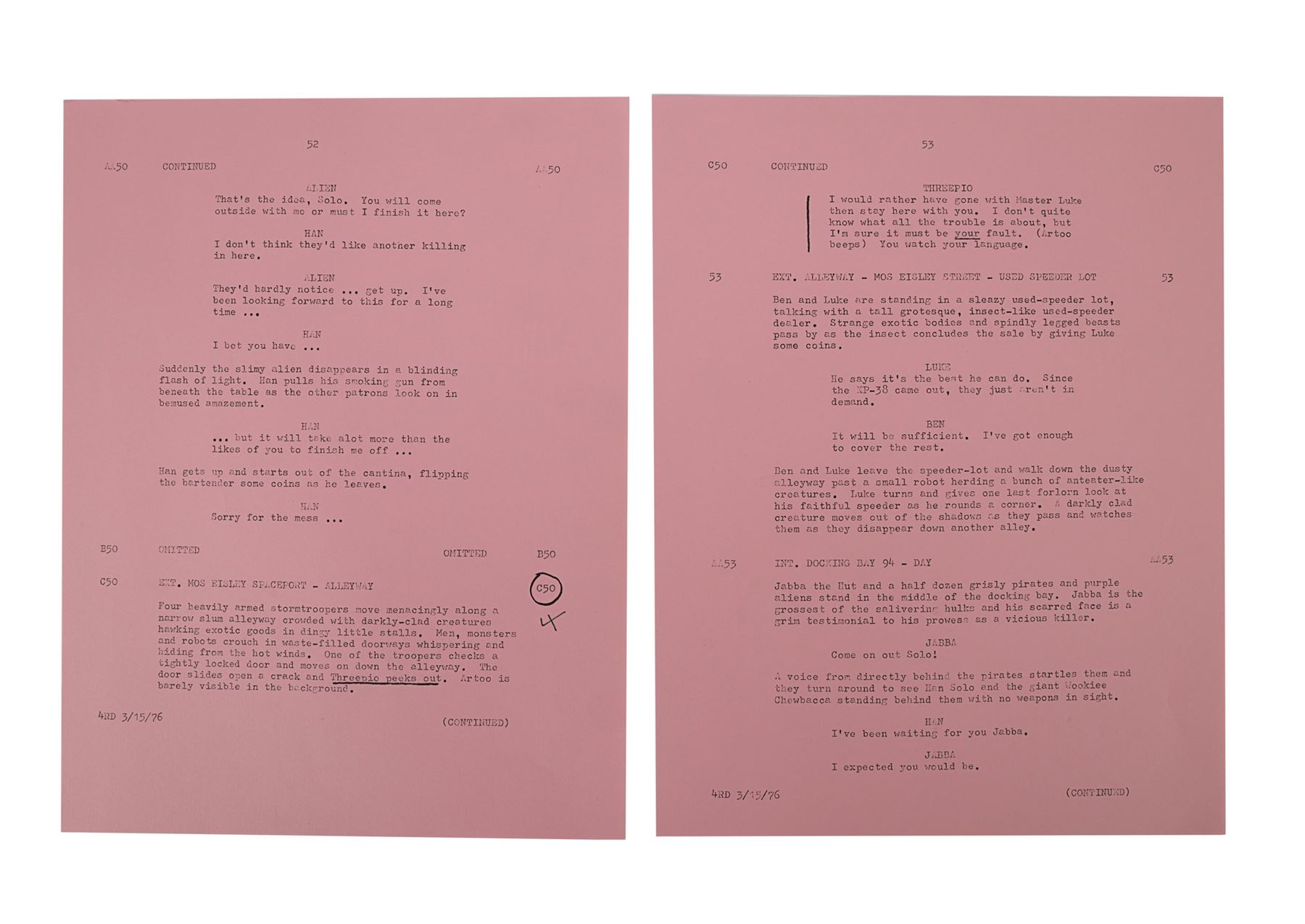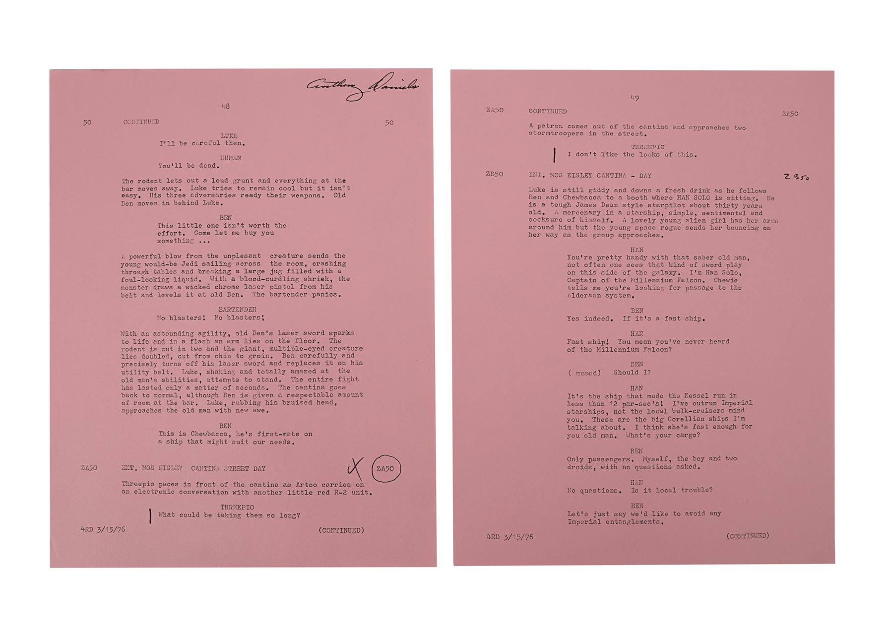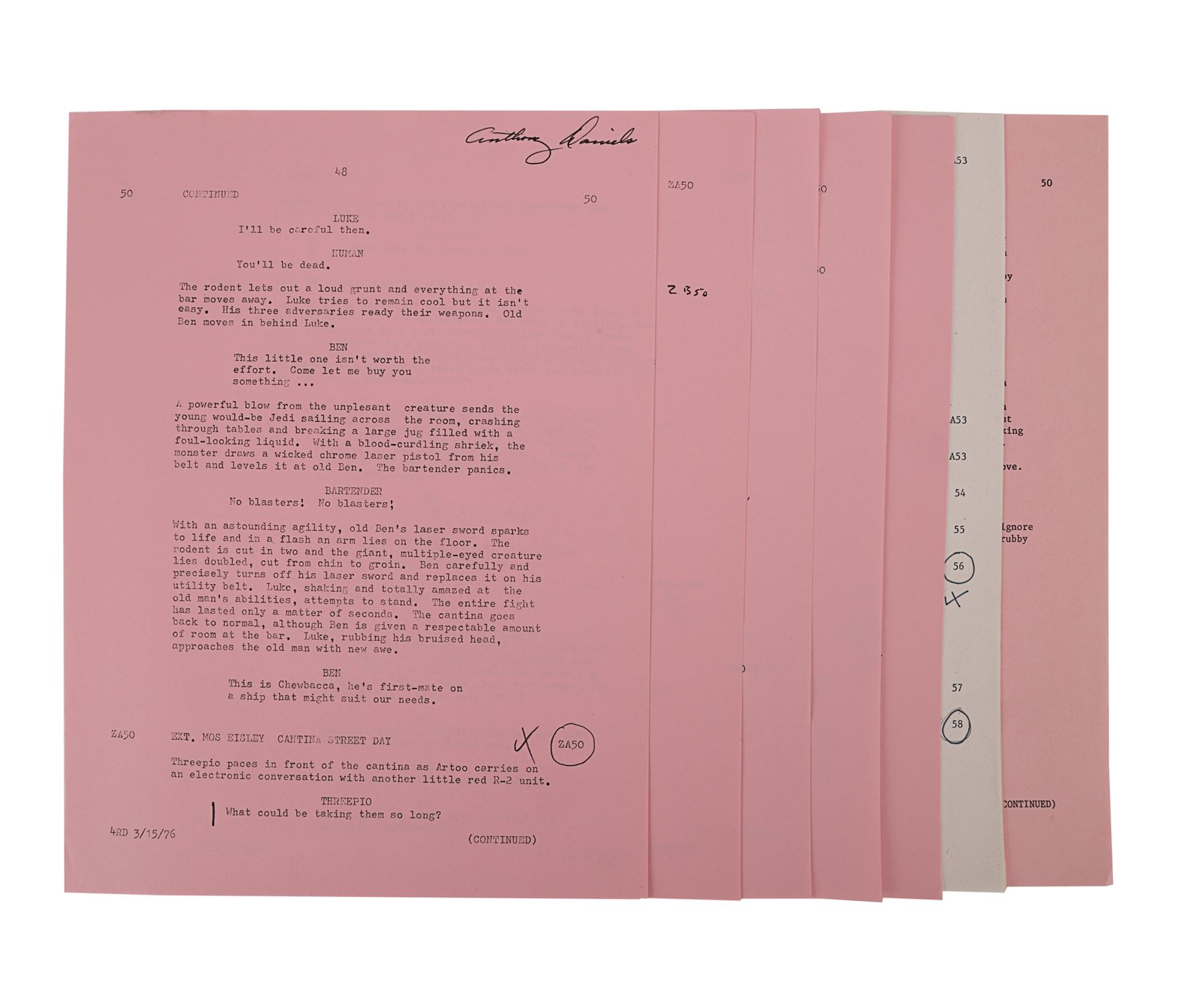 Eleven hand-annotated script pages from the production of George Lucas' Star Wars: A New Hope. All the pages are dated "3/15/76" and printed on pink paper, except for one page dated "4/19/76", which is printed on white paper. The first page is signed by Anthony Daniels and several feature minor annotations. The pages cover some of the scenes in Mos Eisley and the cantina, when the audience is first introduced to Han Solo (Harrison Ford). Dimensions (each page): 28 cm x 21.5 cm (11" x 8 1/2")