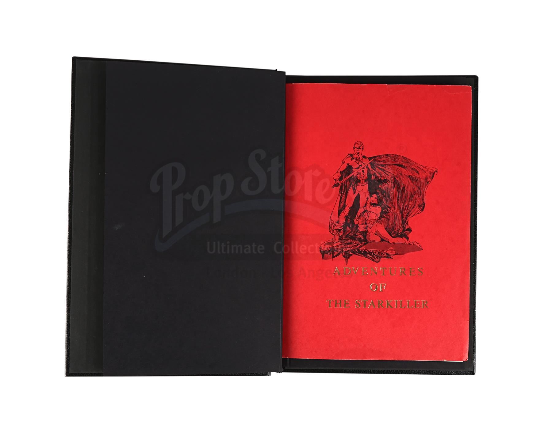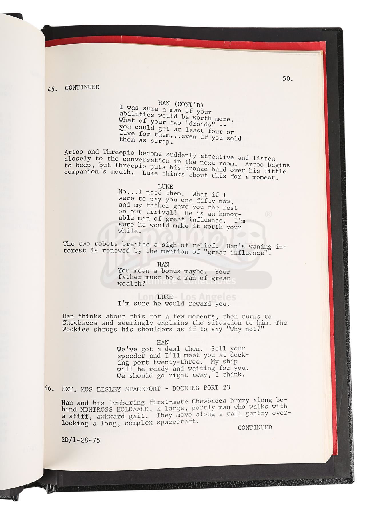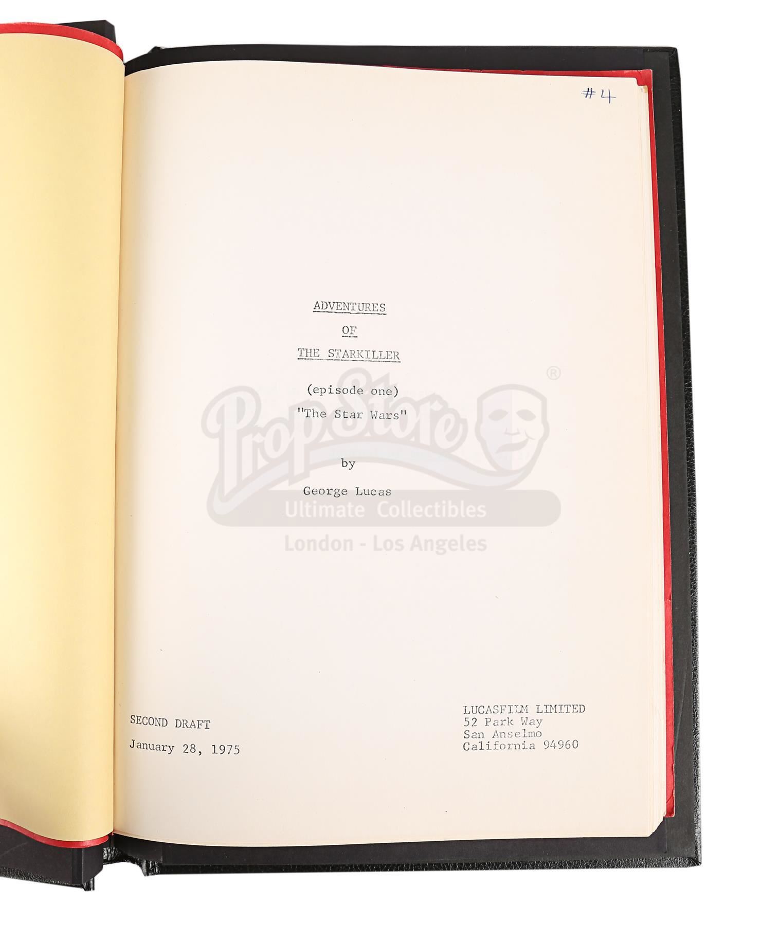 A second draft Adventures of the Starkiller script from George Lucas' Star Wars: A New Hope. This version of the script was originally issued to concept artist Colin Cantwell who designed several vehicles and ships. Bound within a leather springback binder, the script displays a red card cover which bears the original title "The Adventures of The Starkiller," as taken from the "Journal of the Whills'' in goldtone foil and a printed design by artist Esteban Maroto that was originally done for a 1972 Flash Gordon tribute. The art was placed on the cover of this early script to provide tone for the reader. "#4" is handwritten in the top right corner of the title page and a small piece of paper displays handwritten text including the production title, the date, an address for LucasFilm Limited and "copy #4." Very few copies of the second draft script are believed to have been issued. Dated January 28, 1975, the script consists of 115 single-sided printed pages on white U.S. letter size paper. The card cover displays small tears and creases from use, and there is minor discoloration present around the edges of some pages.